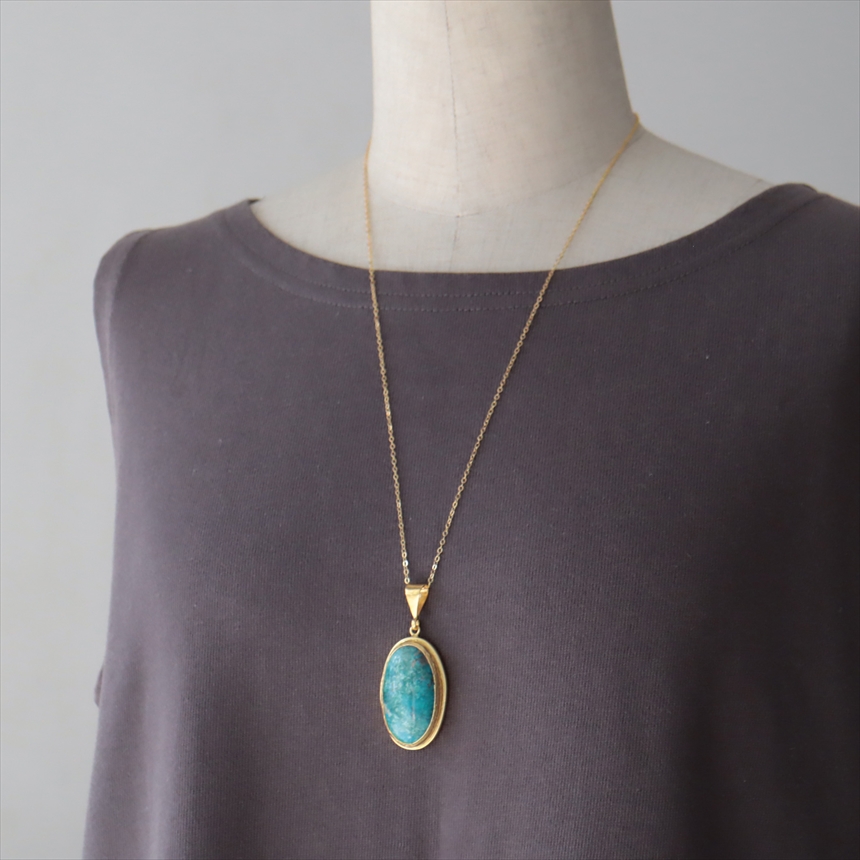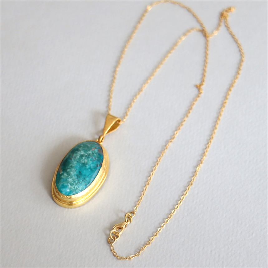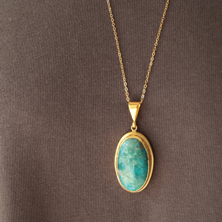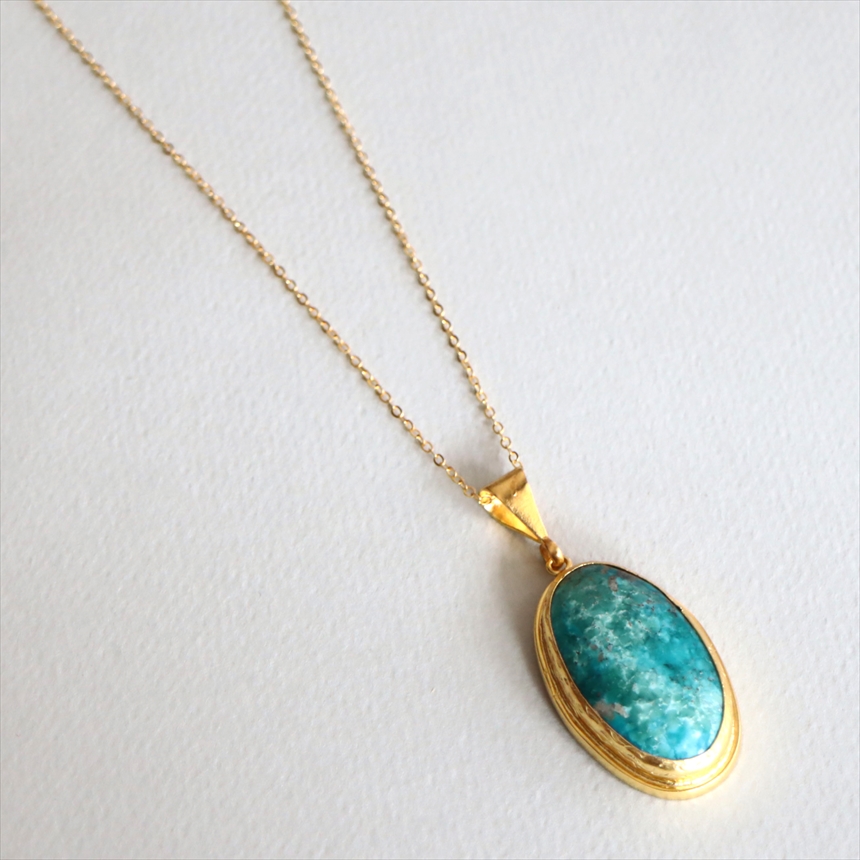 ターコイズ ペンダント オーバル ビッグストーン 60cmチェーン 天然石22Kゴールドプレーテッド トルコジュエリー