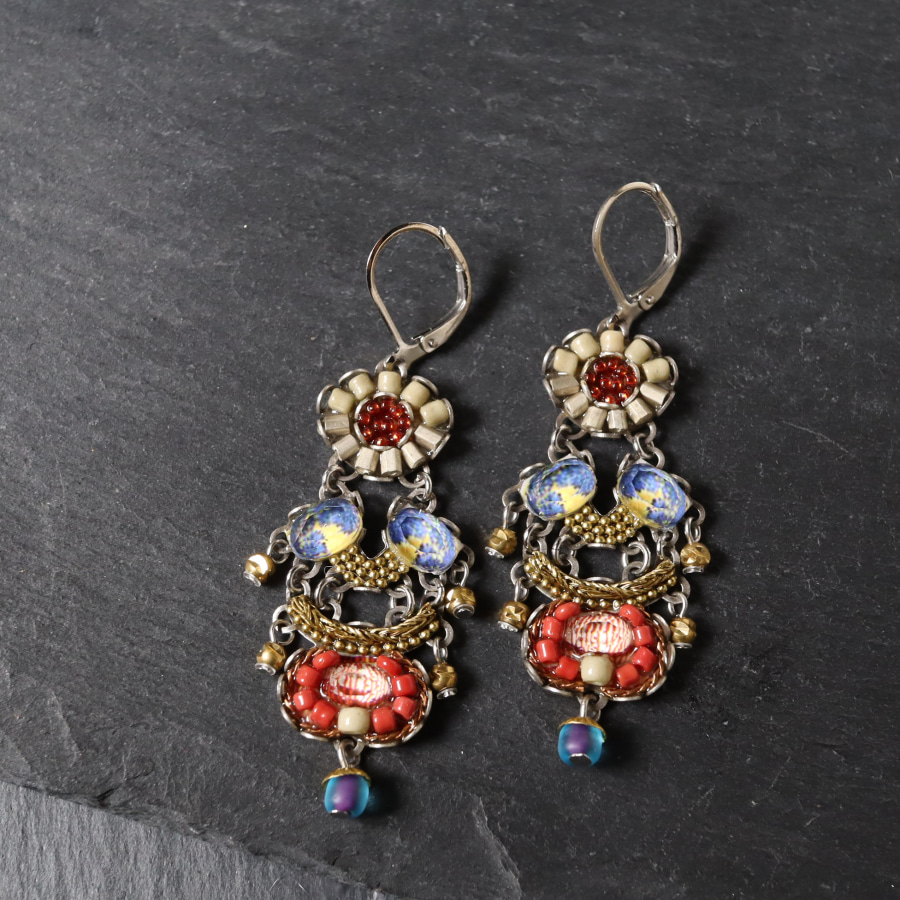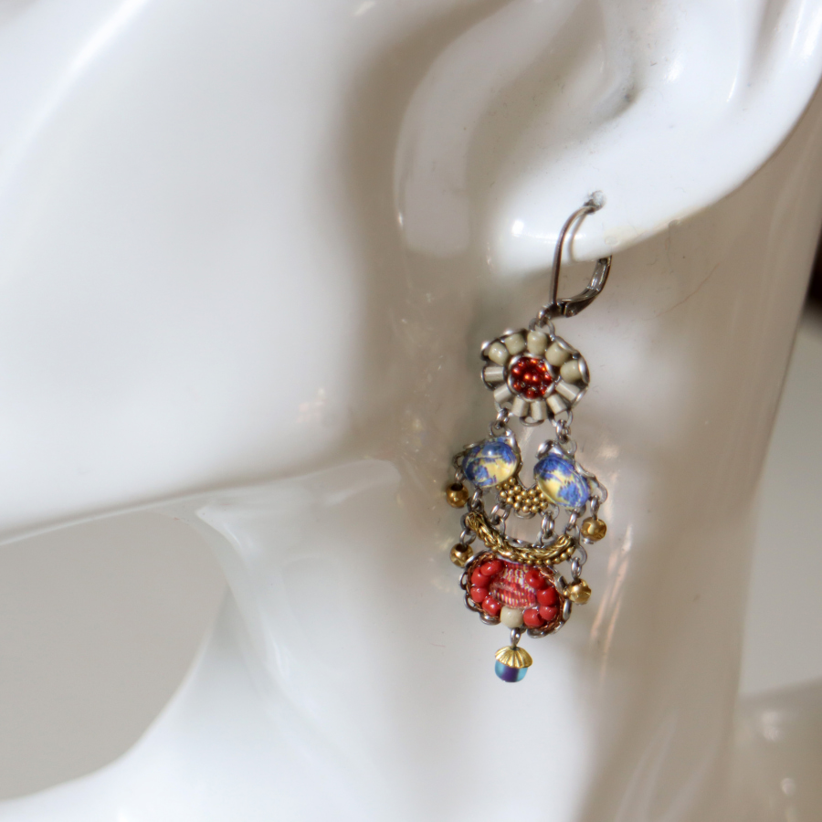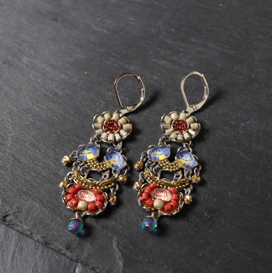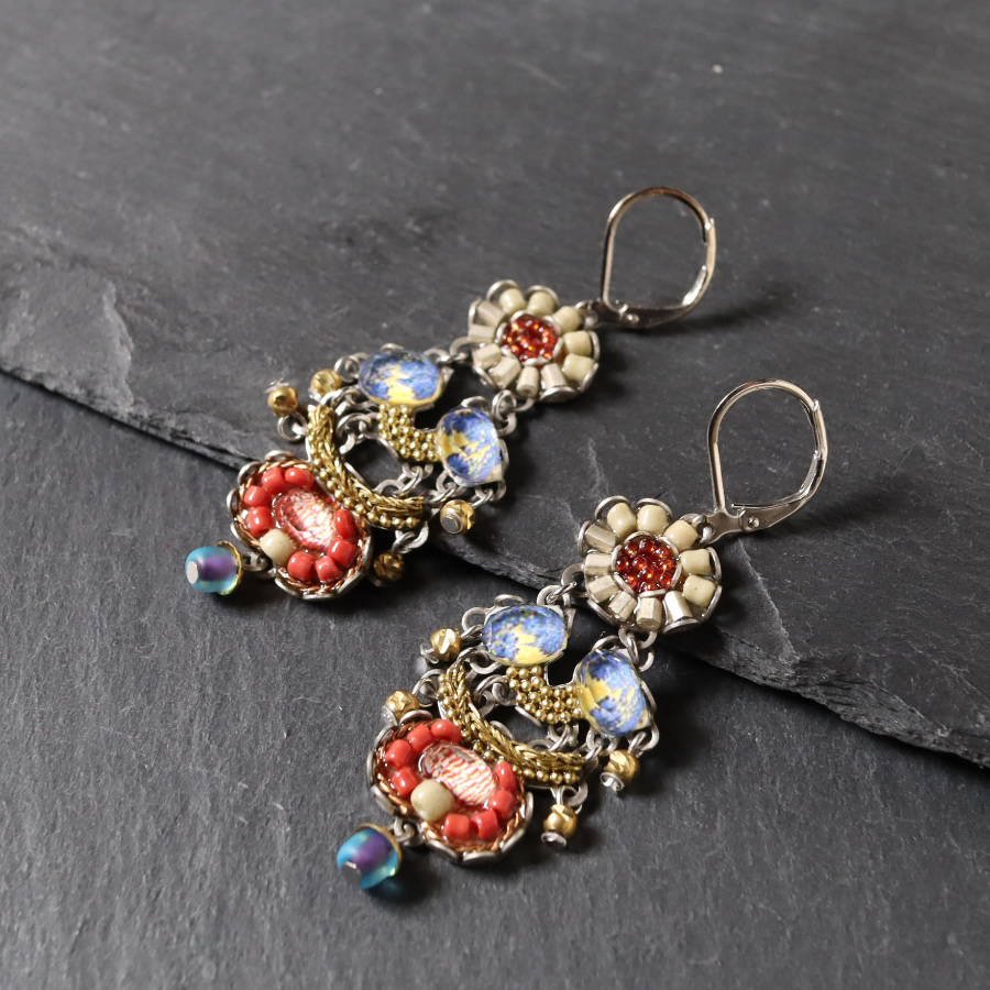 | 真鍮、ガラスビーズ、クリスタル、プリントファブリック |