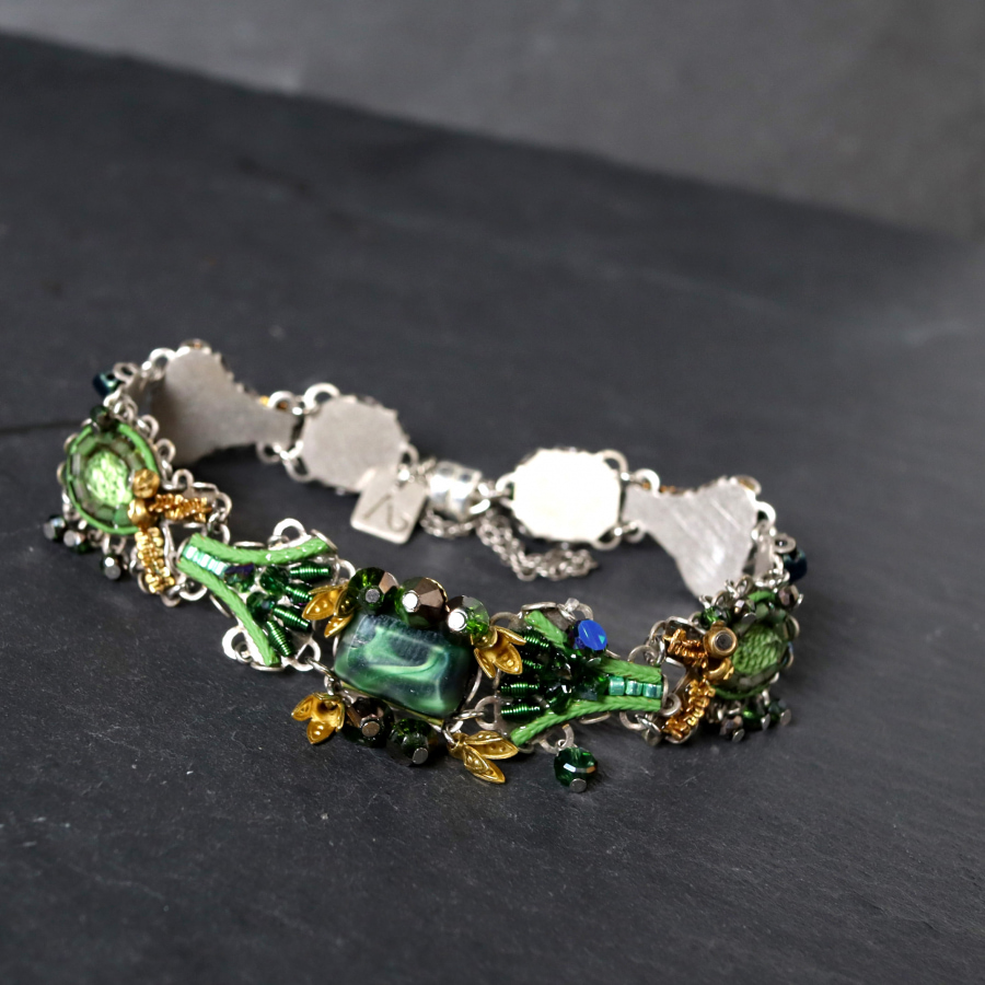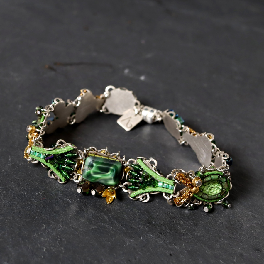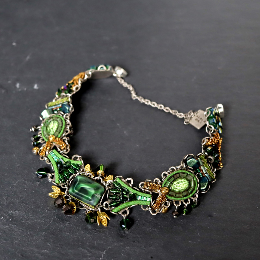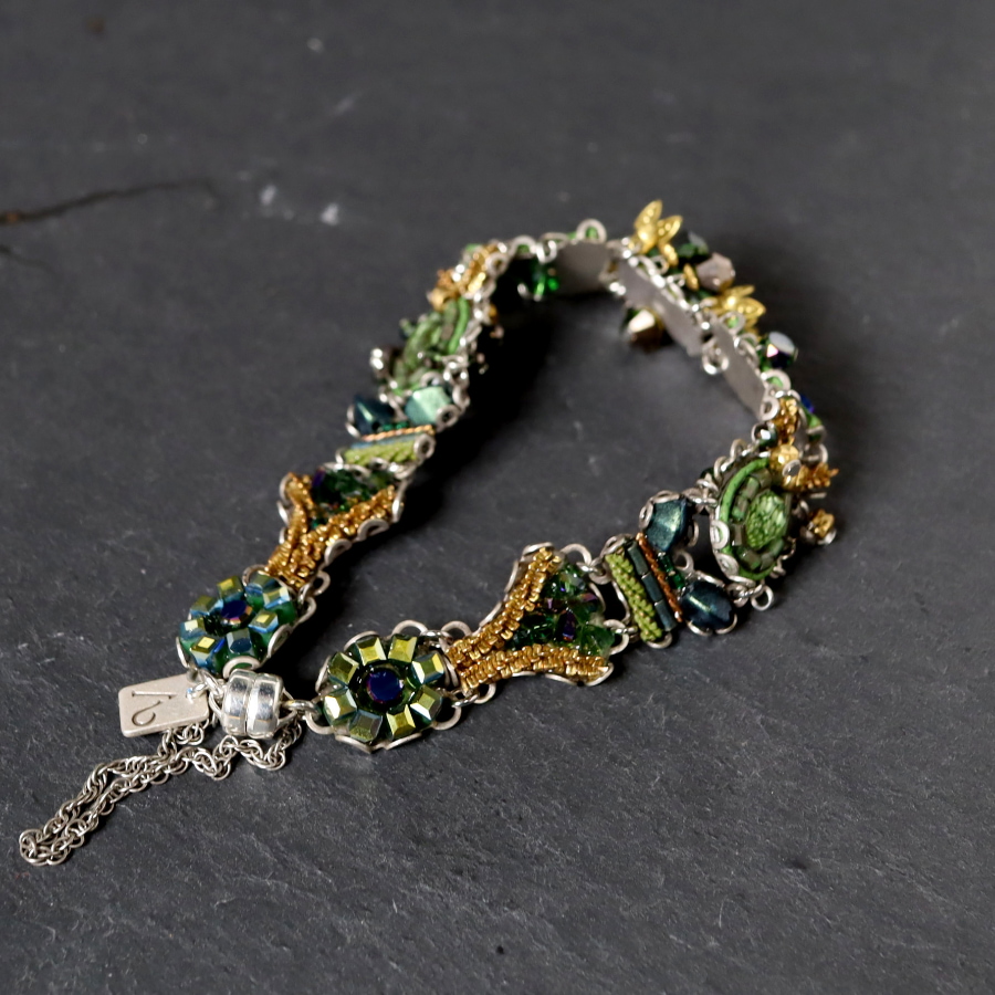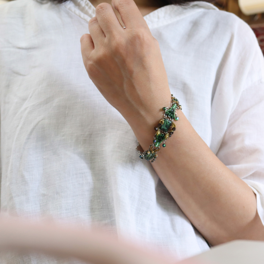 Viridian Moodという青みがかった深いグリーンの美しいシリーズ。グリーンのグラデーションが細やかに様々なビーズで表現されています。ゴールドカラーがアクセントになりシックでありながら、華やかな印象のブレスレットです。