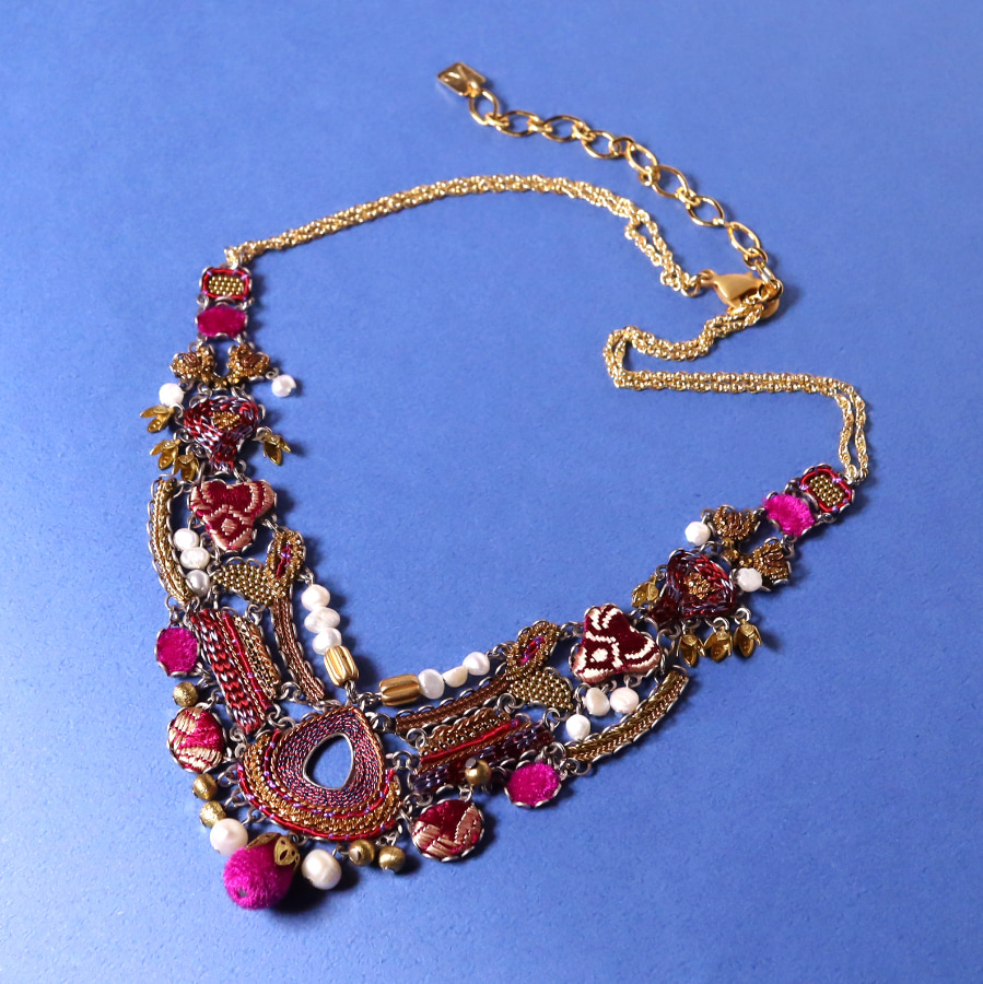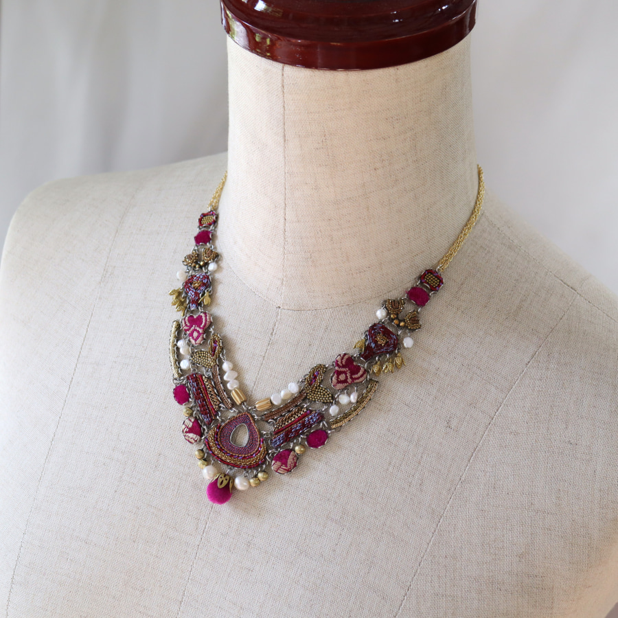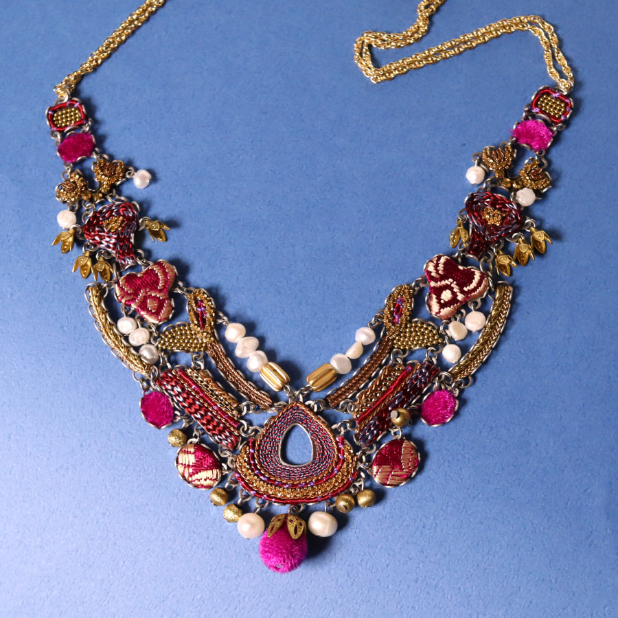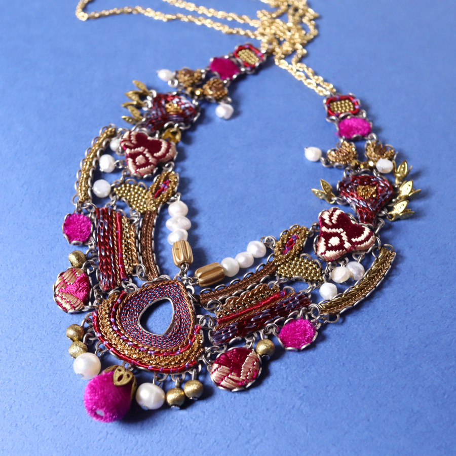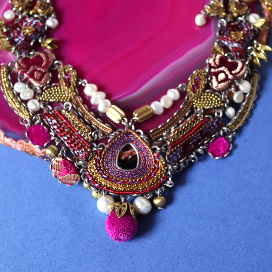Ancient Royalty(古代の王族)という名の、深みあるフューシャピンクとゴールドの組み合わせが豪華で魅力のシリーズ。ベルベットの様な光沢がある風合いのファブリックにゴールドカラーの糸で細やかな刺繍が施されています。アヤラバーらしい独特の芸術的なデザインのネックレスです。