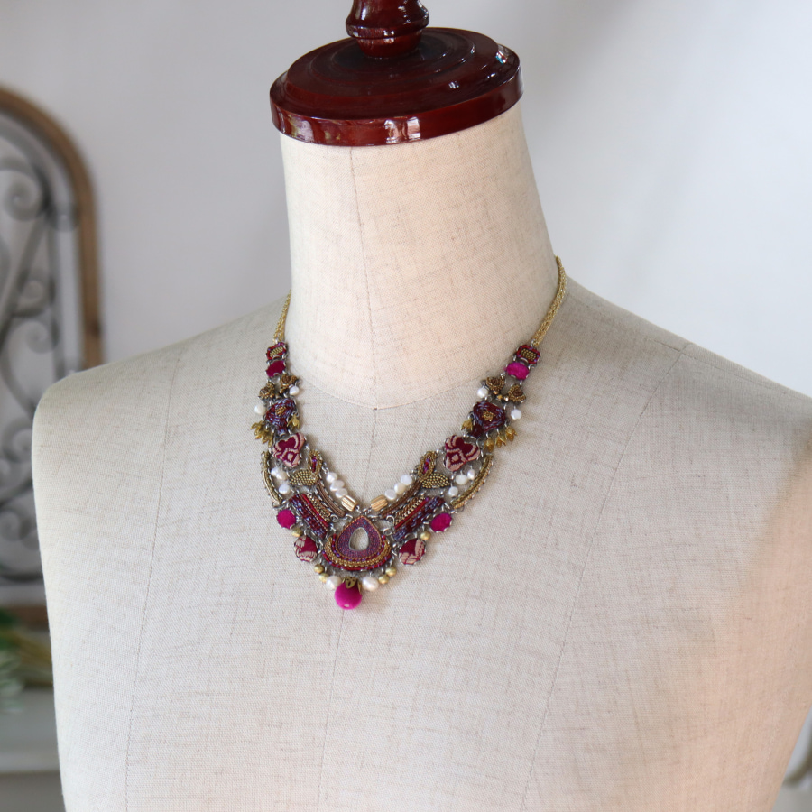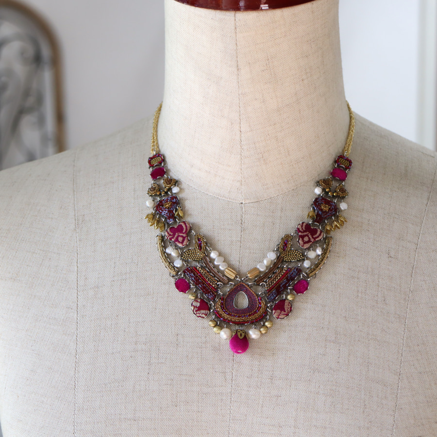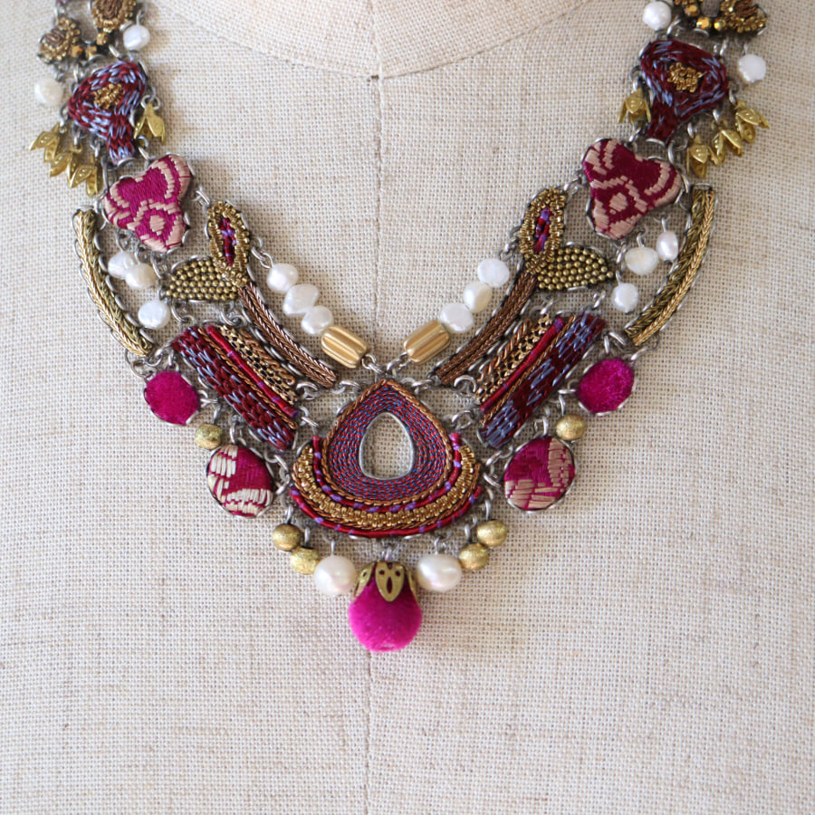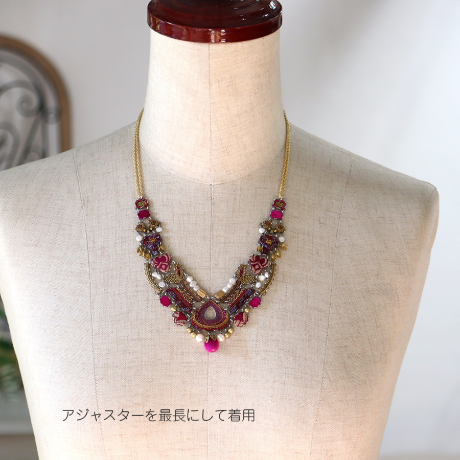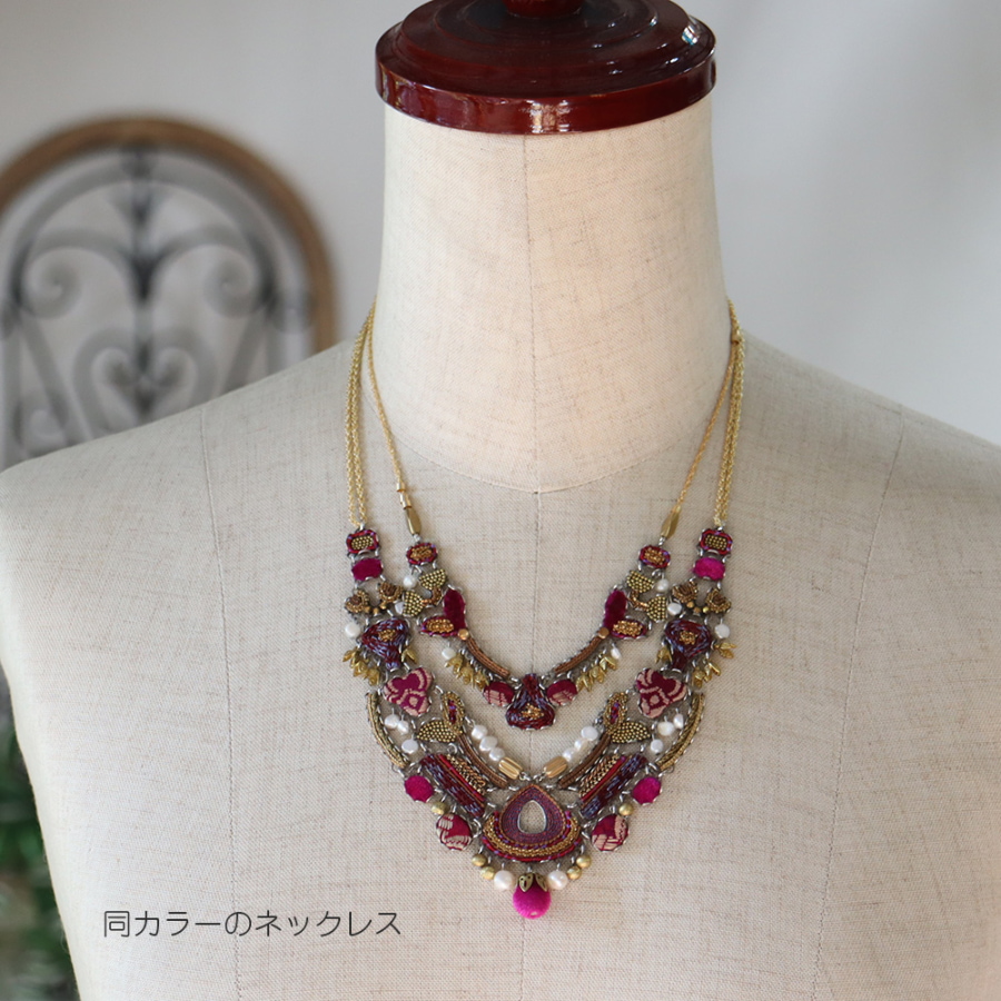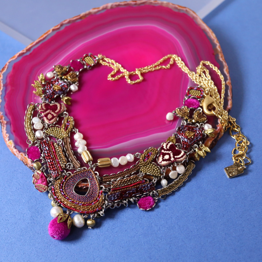 Ancient Royalty(古代の王族)という名の、深みあるフューシャピンクとゴールドの組み合わせが豪華で魅力のシリーズ。ベルベットの様な光沢がある風合いのファブリックにゴールドカラーの糸で細やかな刺繍が施されています。アヤラバーらしい独特の芸術的なデザインのネックレスです。