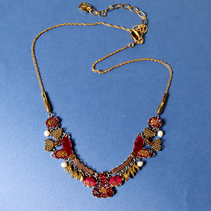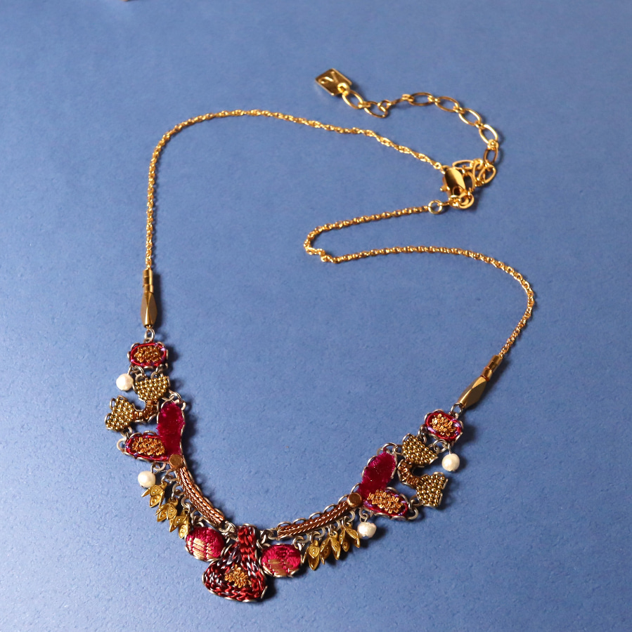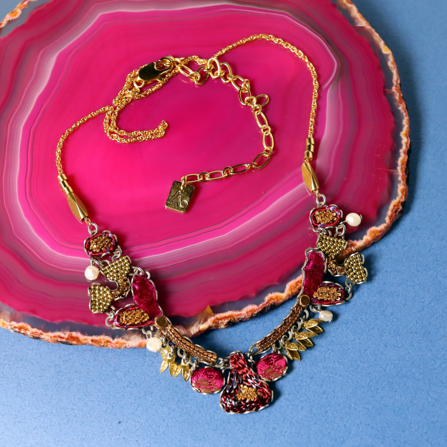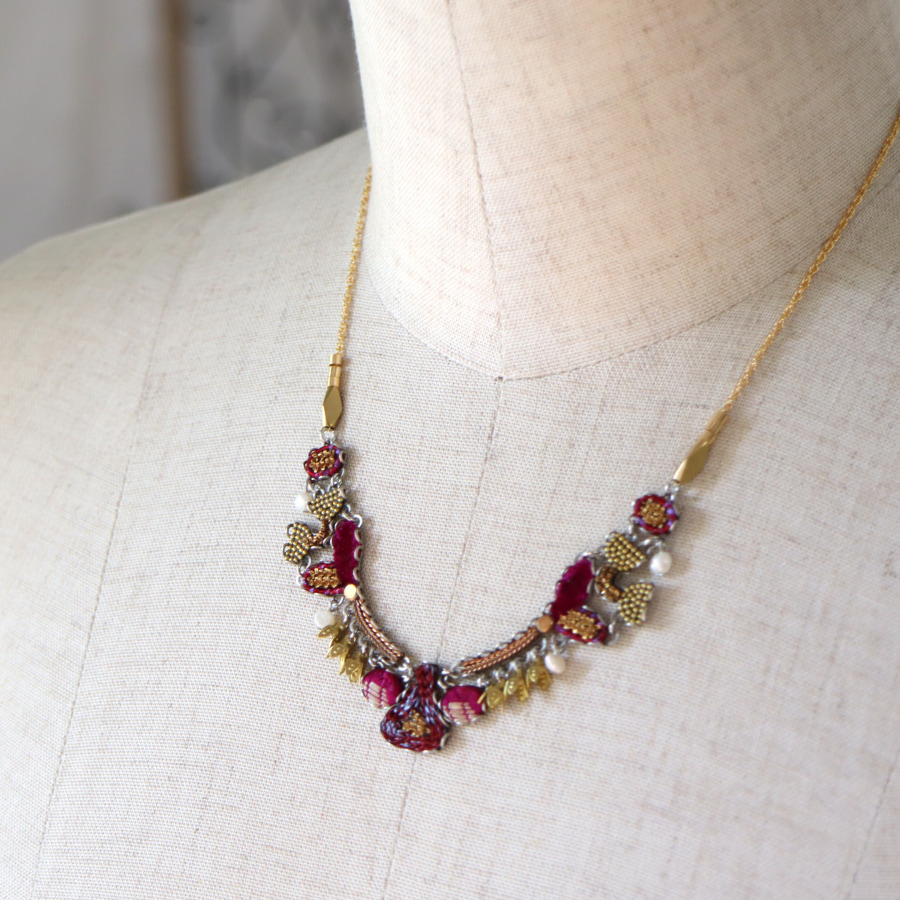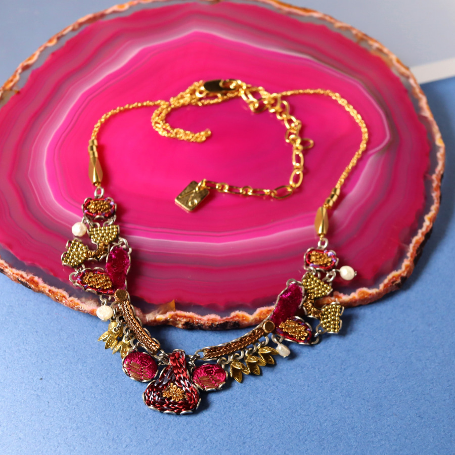 Ancient Royalty(古代の王族)という名の、深みあるフューシャピンクとゴールドの組み合わせが豪華で魅力のシリーズ。ベルベットの様な光沢がある風合いのファブリックにゴールドカラーの糸で細やかな刺繍が施されています。