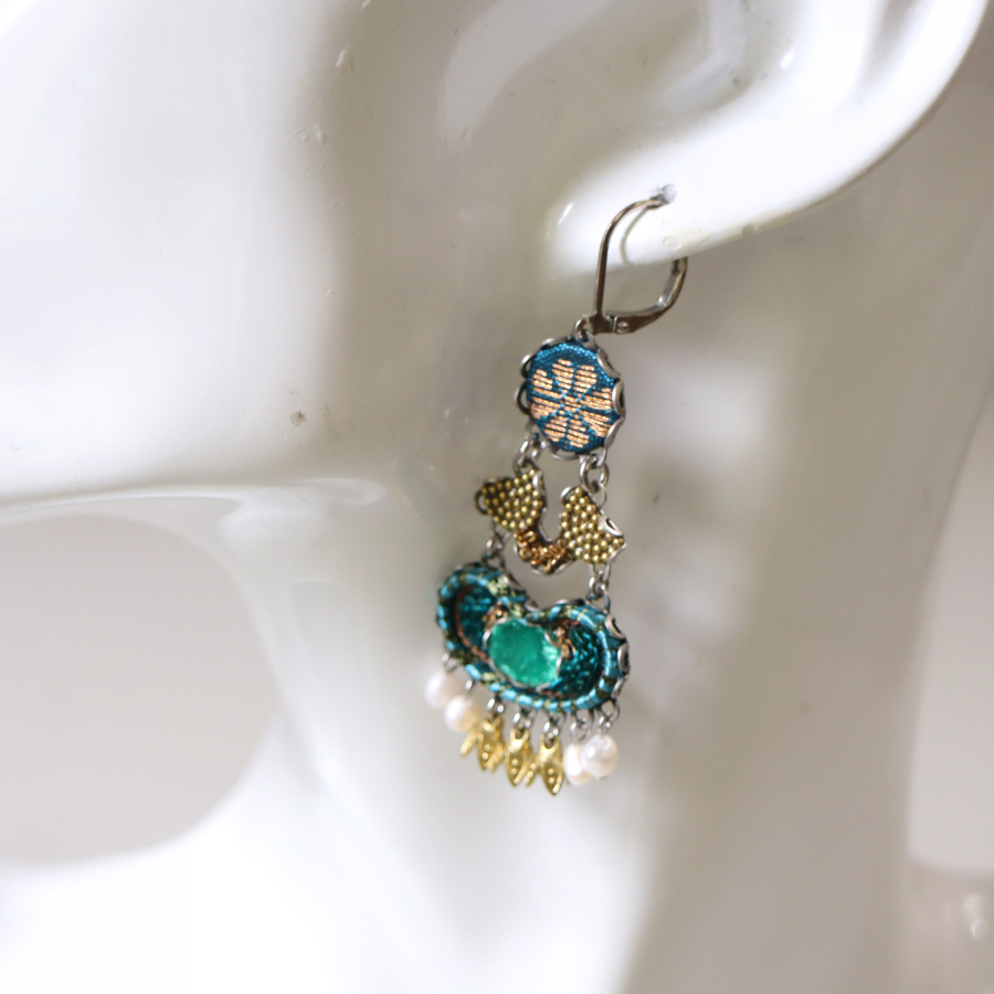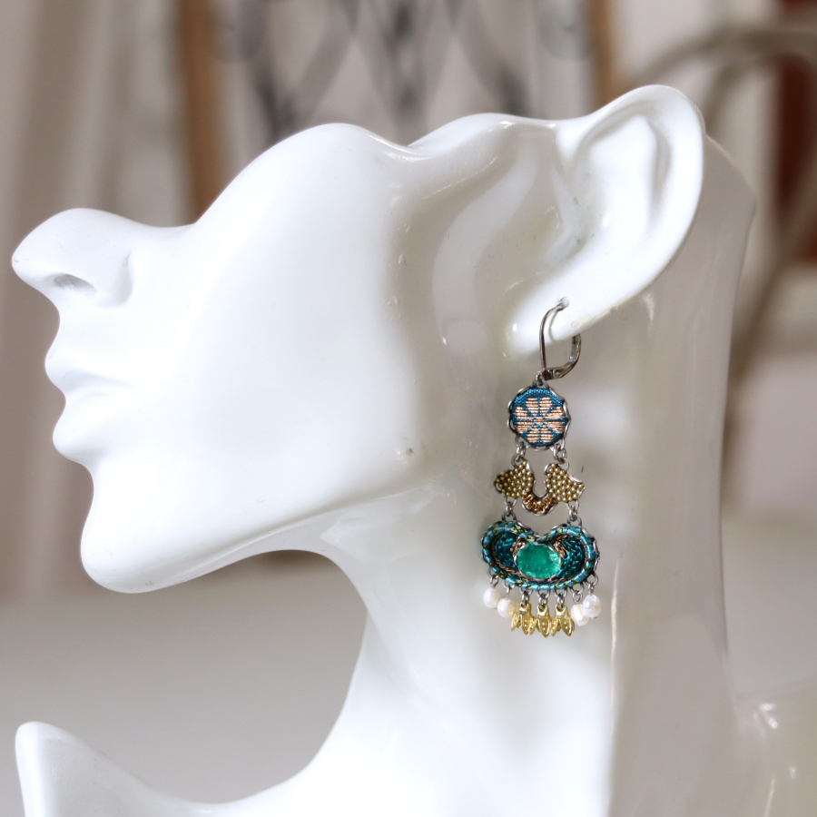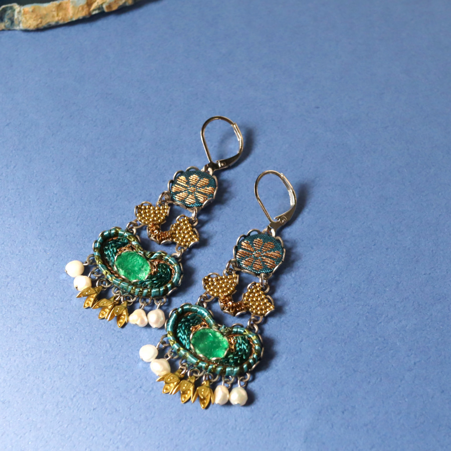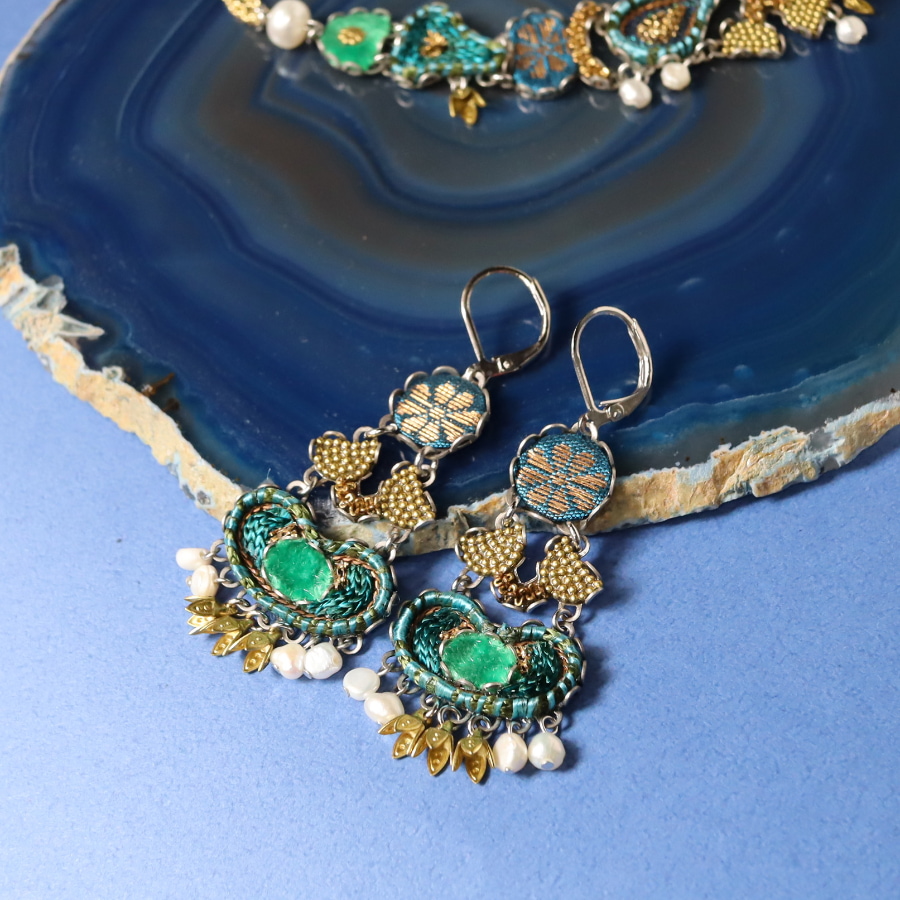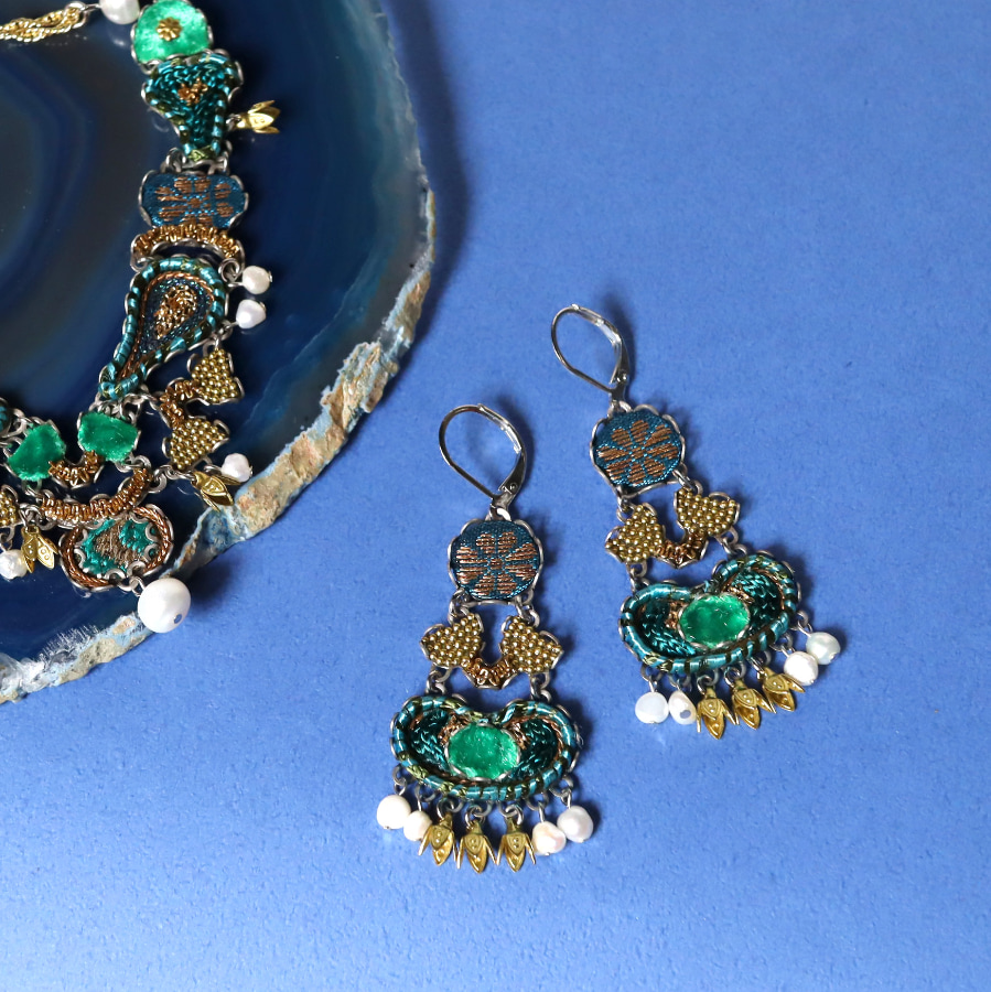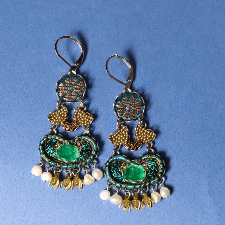 Royal Velvetという名の、鮮やかなグリーンとゴールドの組み合わせが豪華で魅力のシリーズ。ベルベットの様な光沢がある風合いのファブリックにゴールドカラーの糸で細やかな刺繍が施されています。アヤラバーらしい独特の芸術的なデザインのピアスです。