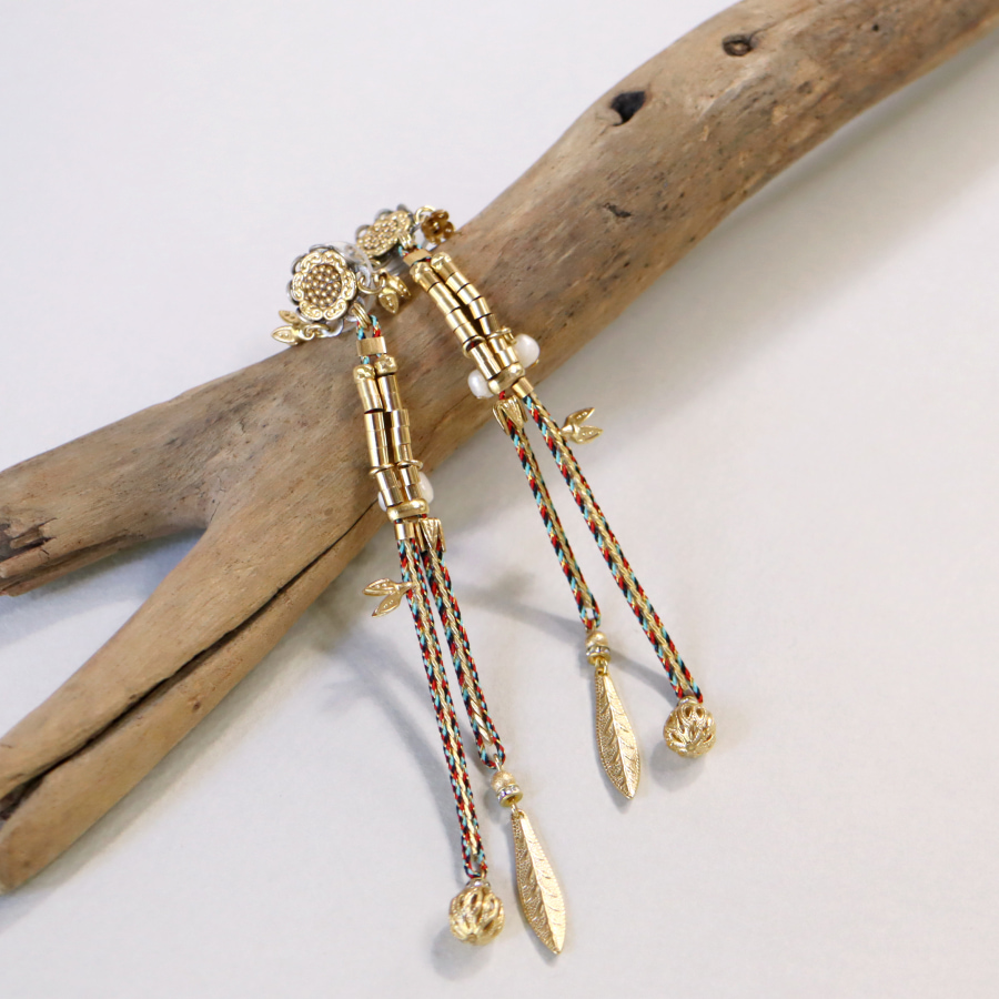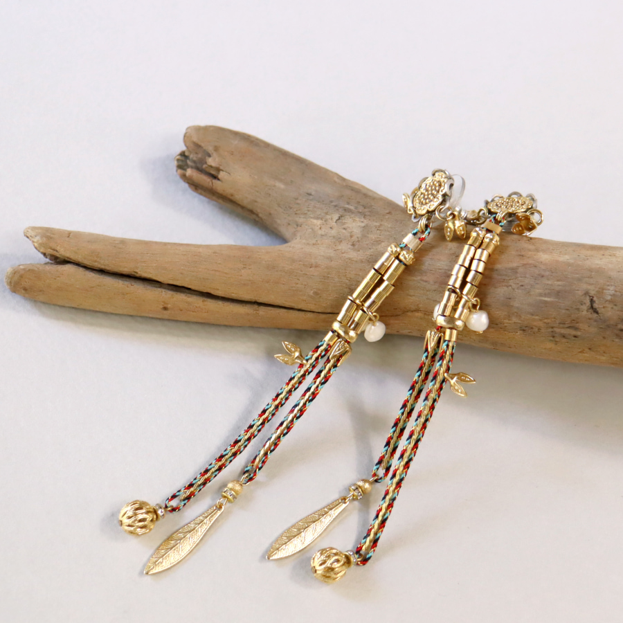 【Signiture Collection】アジアやアフリカの民族衣装にインスパイアされたという、デザイナーの、広がるイメージをそのままに表現したユニークなコレクション。使われているパーツのひとつひとつは、手作業で縫い合わされ、組み立てられ、クラフト万の丁寧な仕事が際立っています。