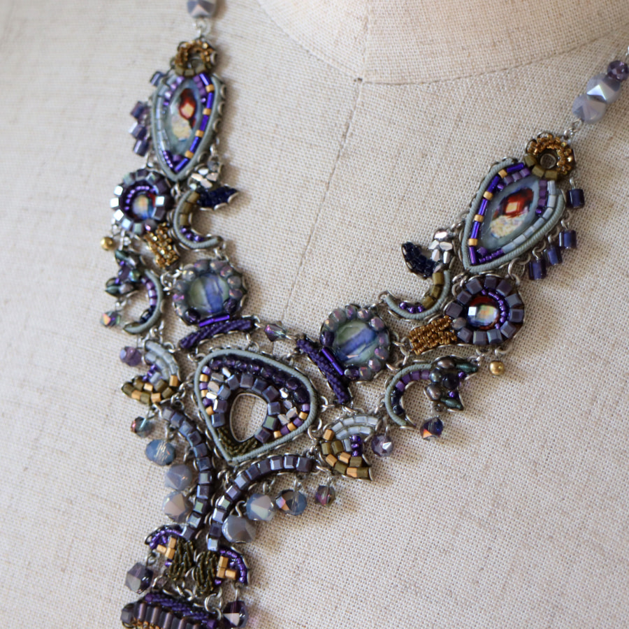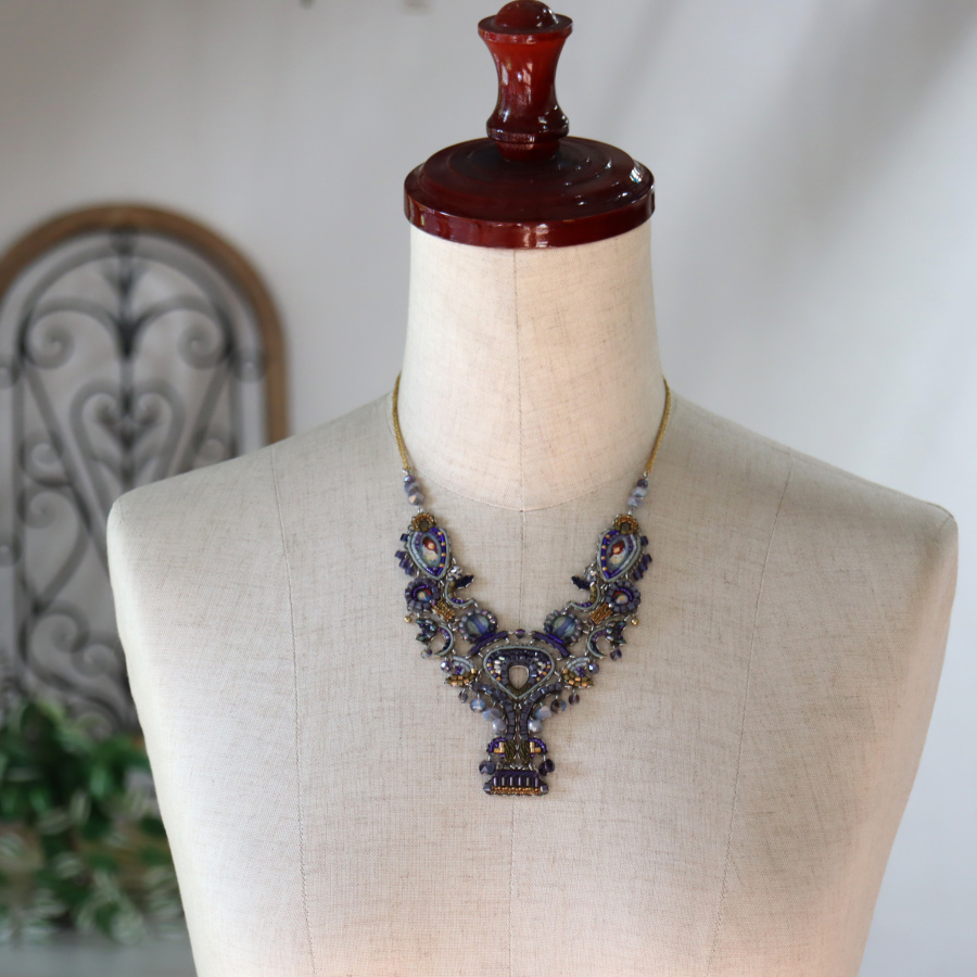Mystical Grapeという名の、鮮やかなグレープカラーが輝くシリーズ。細やかなビーズの組み合わせに、メタリックなビーズがアクセントになり、魅惑的な印象。こちらはカジュアルにつけやすいペンダントタイプです。