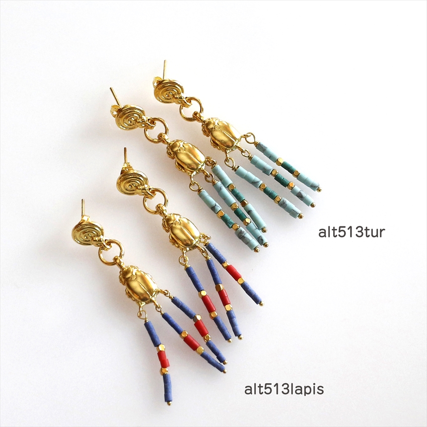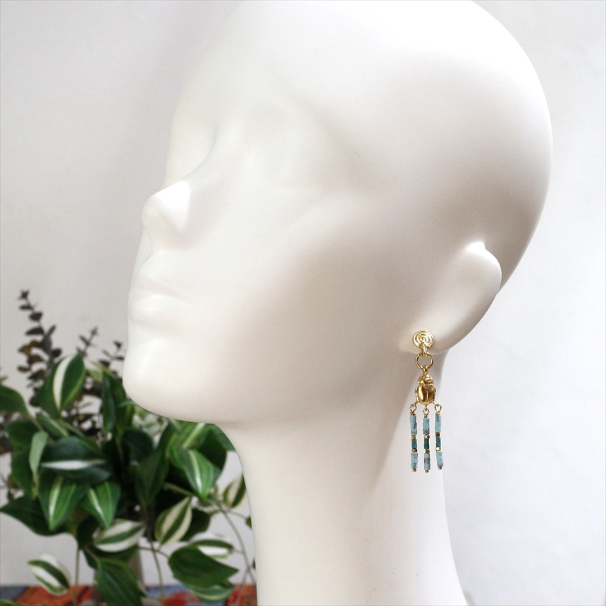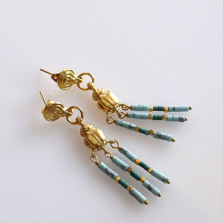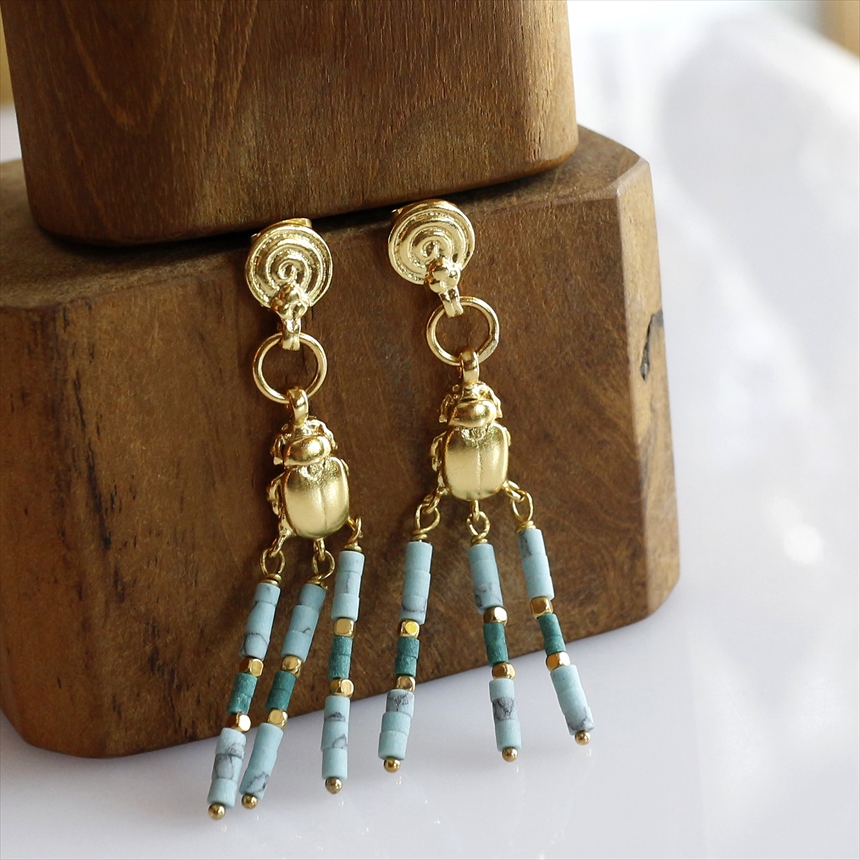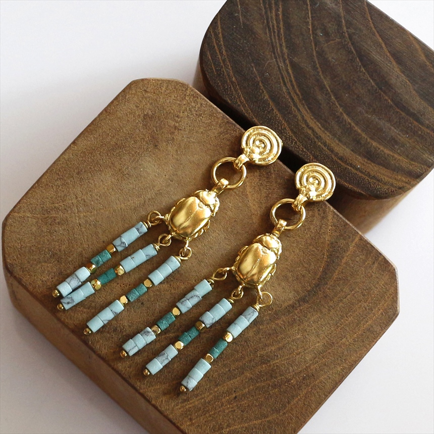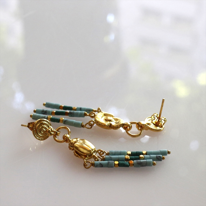 古代エジプトで、太陽をつかさどる神の化身と考えられ崇められていたスカラベがモチーフになったピアスです。上部の円盤が太陽のようにも見え、アンティークジュエリーのレプリカの雰囲気がでています。