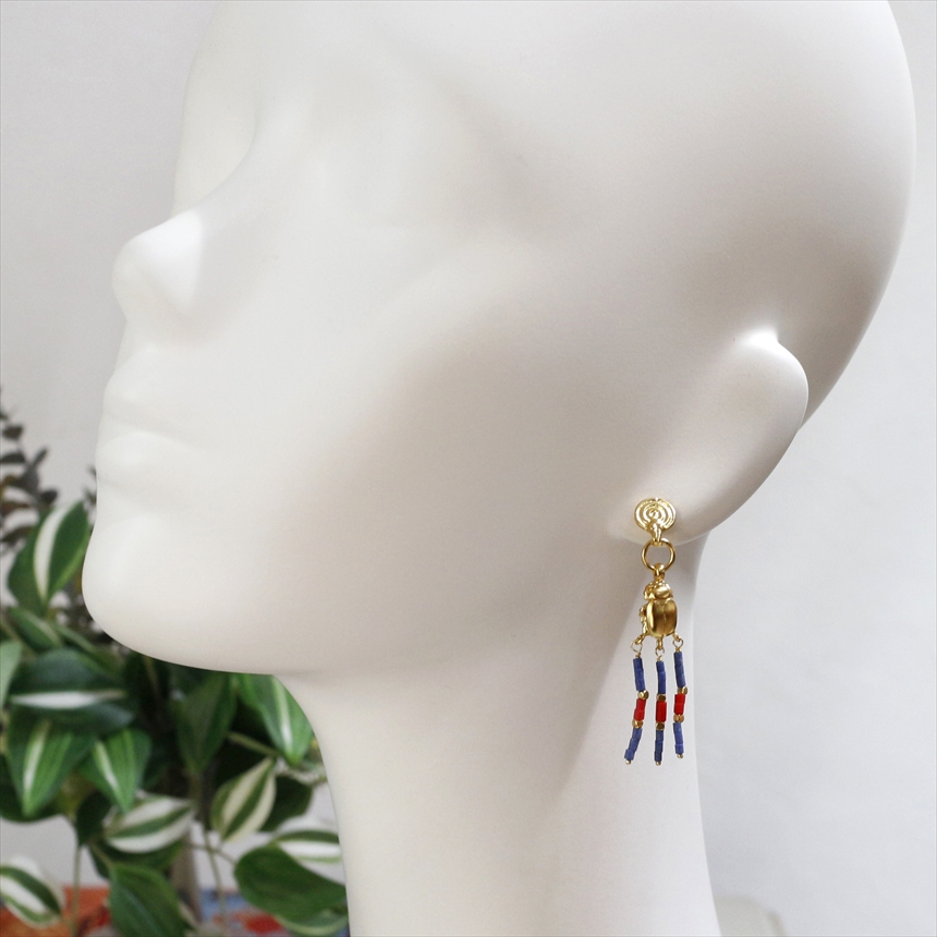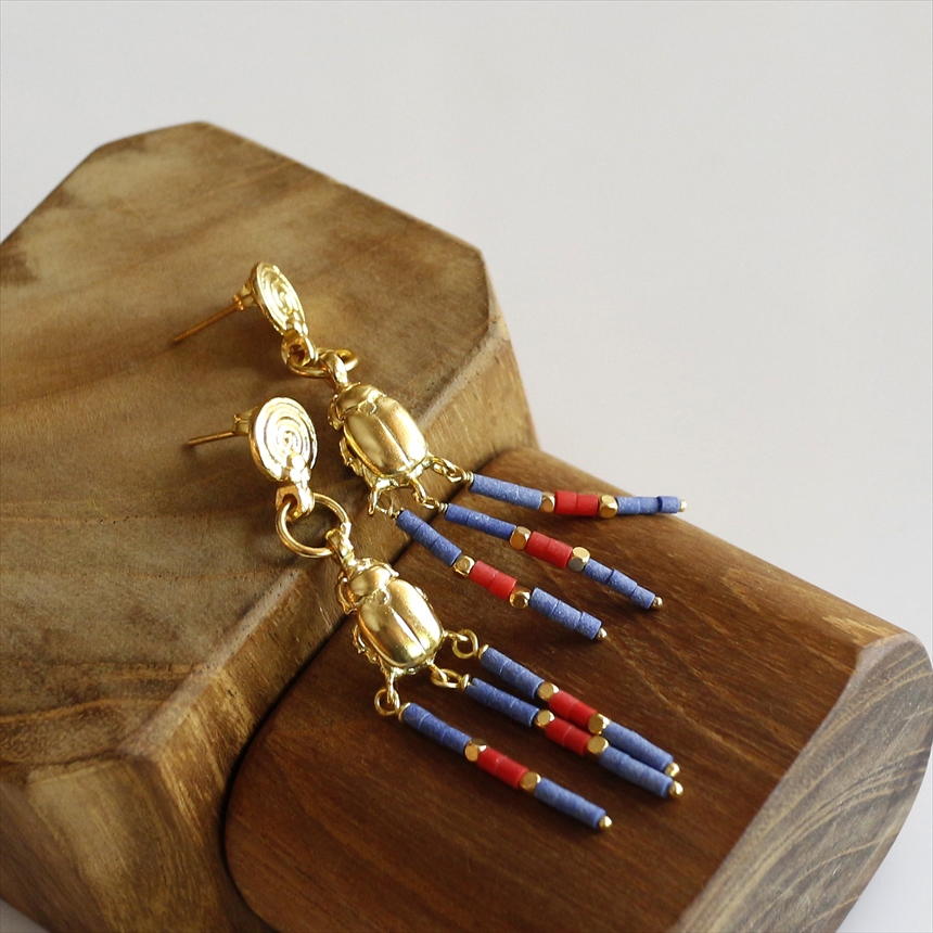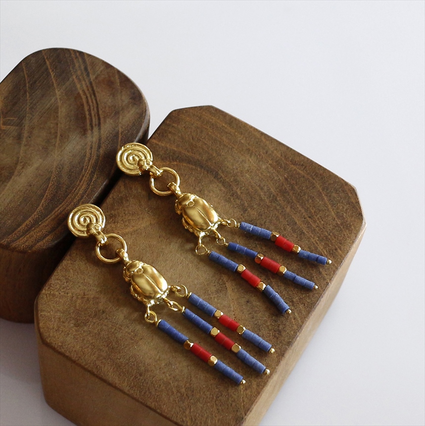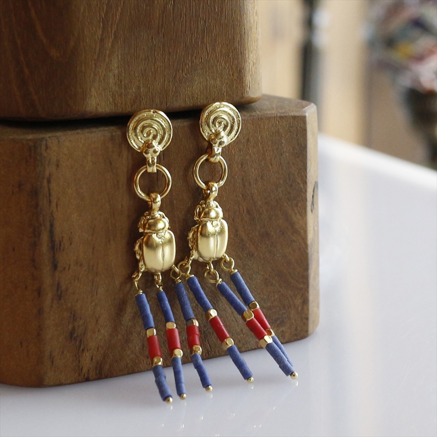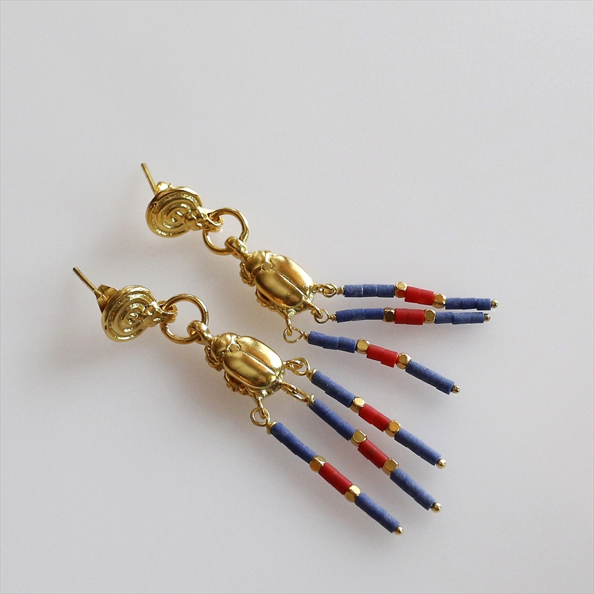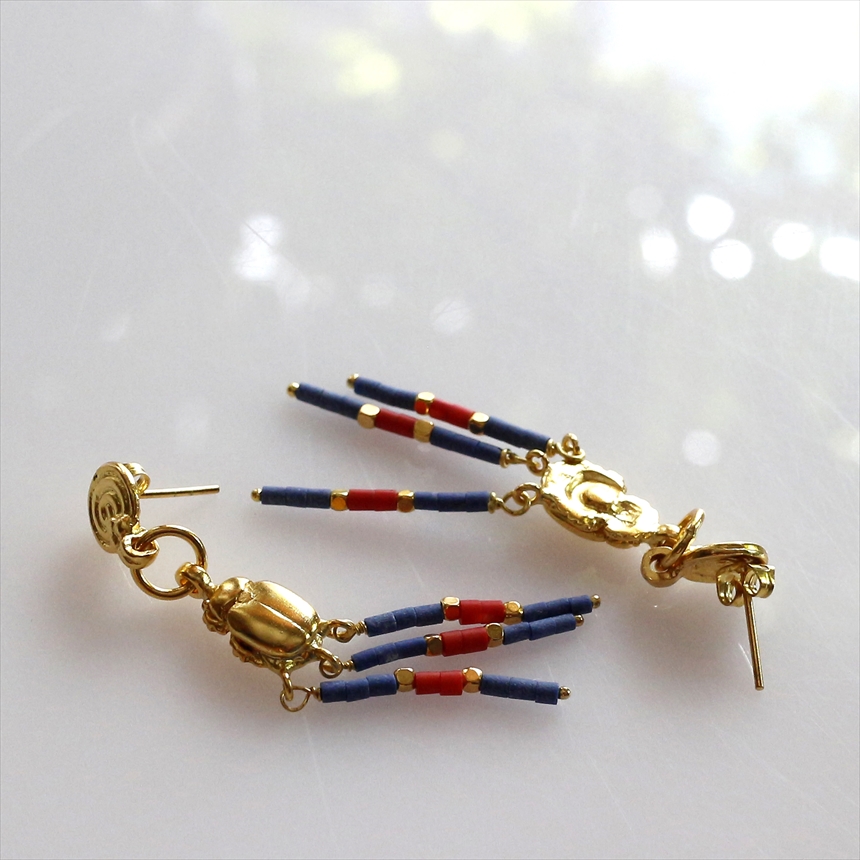 古代エジプトで、太陽をつかさどる神の化身と考えられ崇められていたスカラベがモチーフになったピアスです。上部の円盤が太陽のようにも見え、アンティークジュエリーのレプリカの雰囲気がでています。