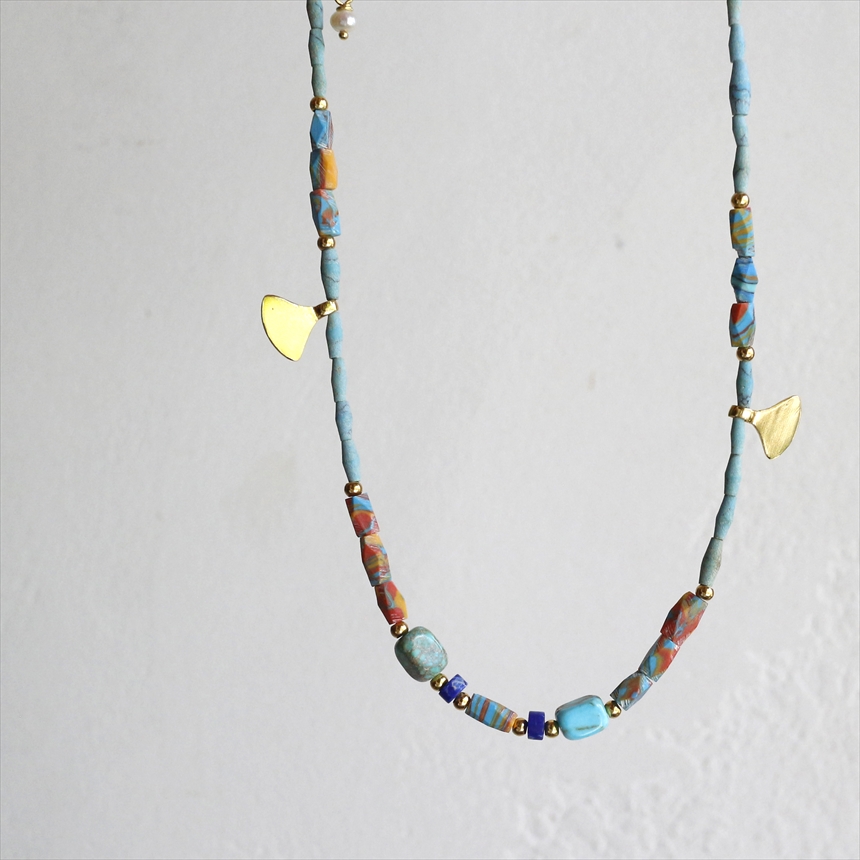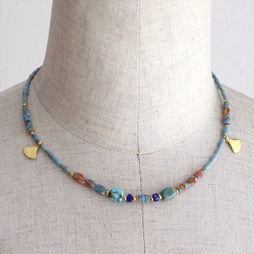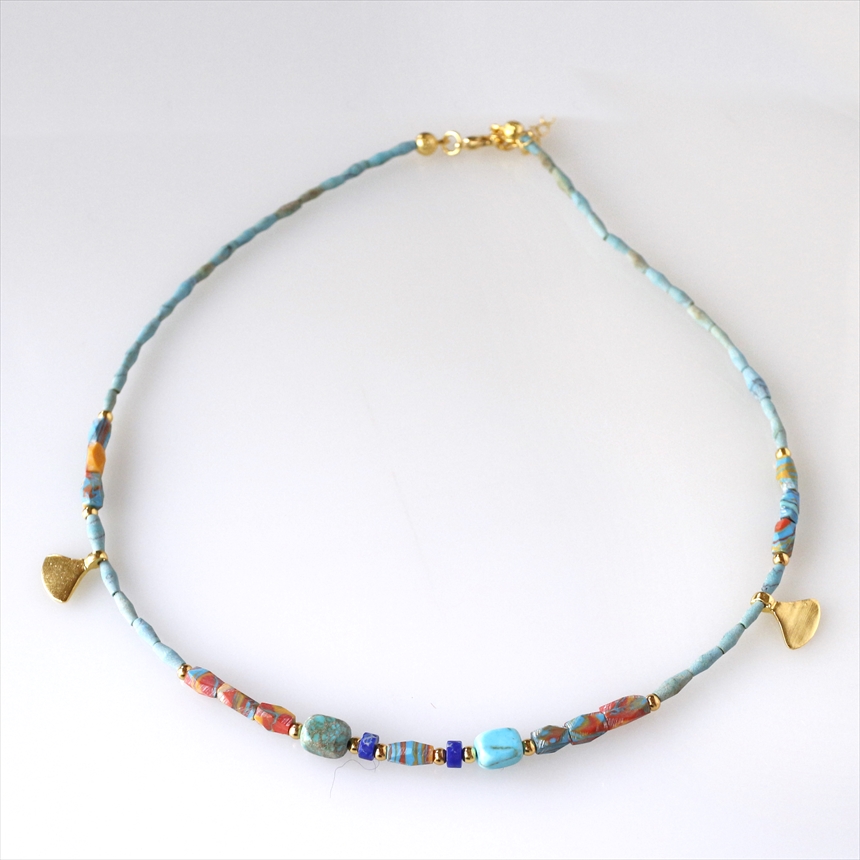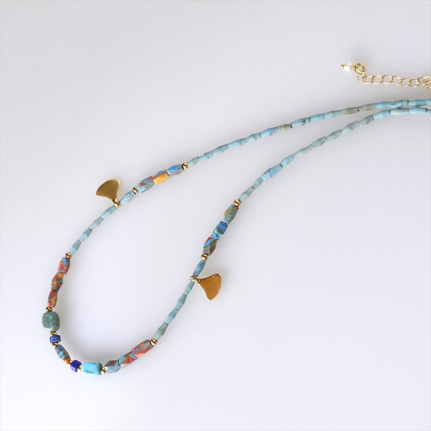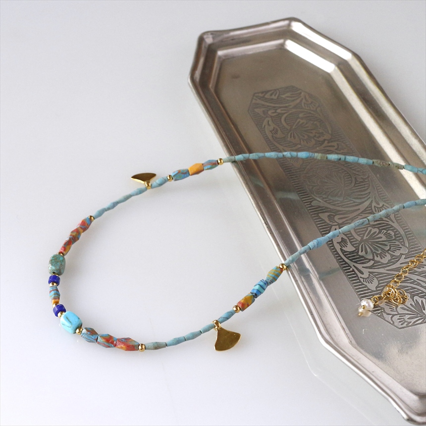 天然のターコイズ、ラピスラズリに加えて、ターコイズとコーラルを練りこんで作られたマーブルビーズが使われています。イチョウの葉のような小さなゴールドのモチーフが合わさって、ユニークなデザインに仕上がっています。