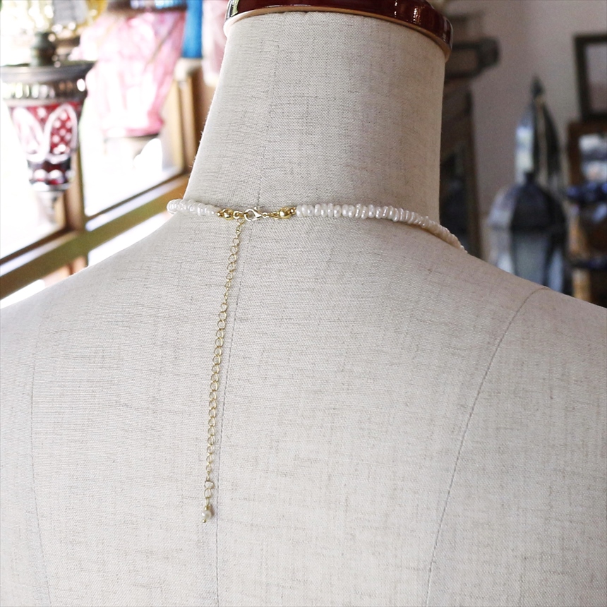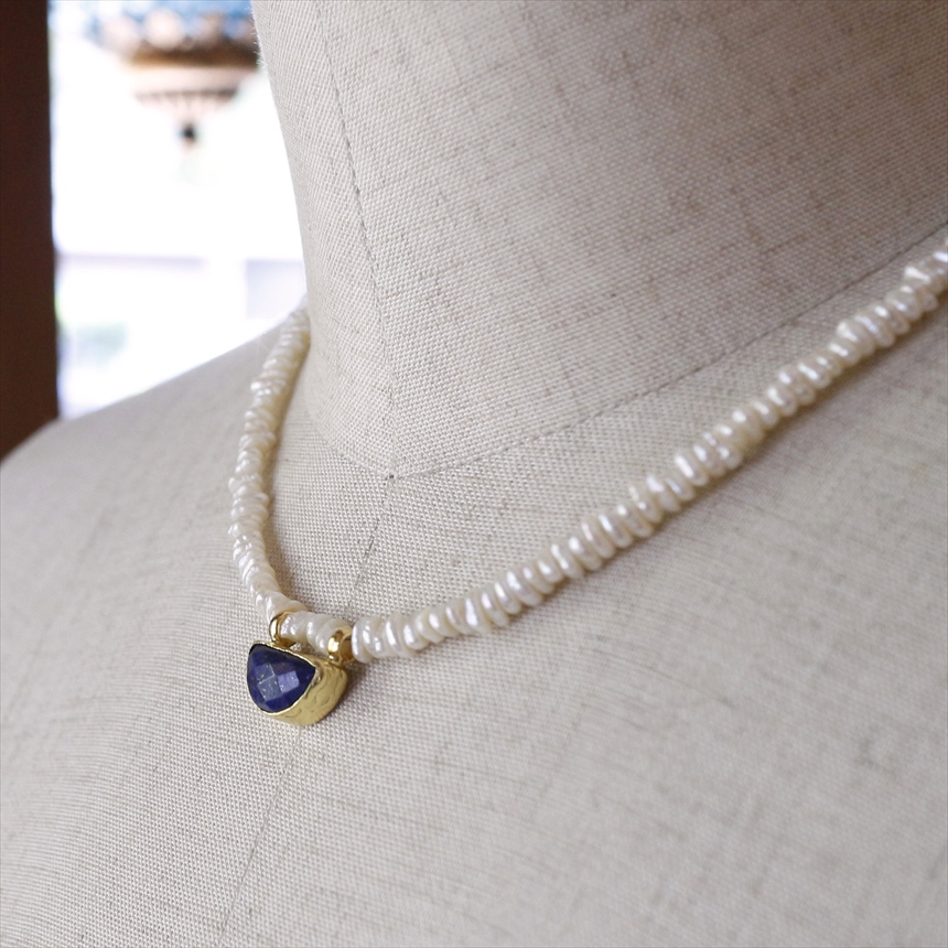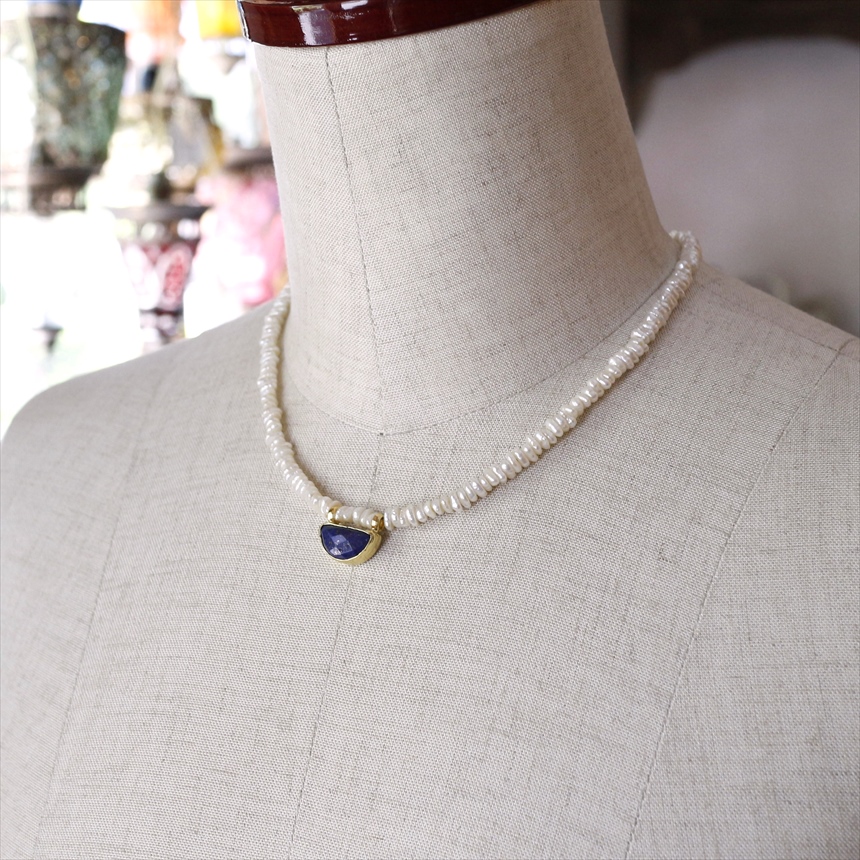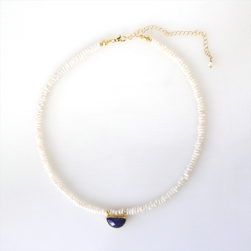 不揃いのパールと天然石ラピスのハーフムーンモチーフを組み合わせた、艶やかで、美しいコントラストが華やかなネックレスです。