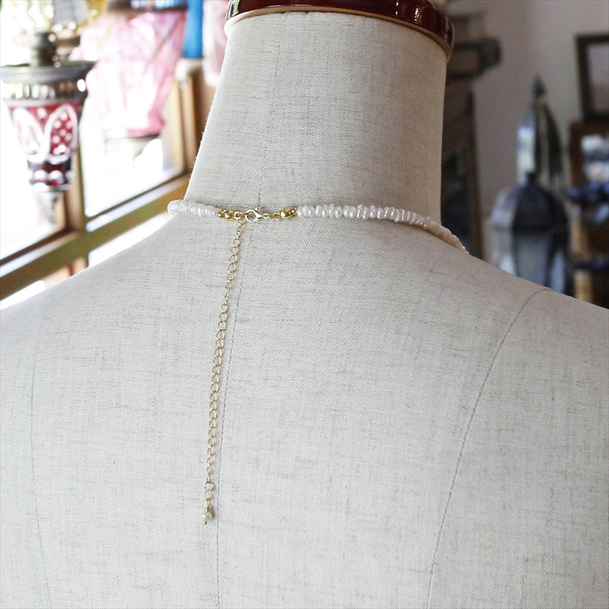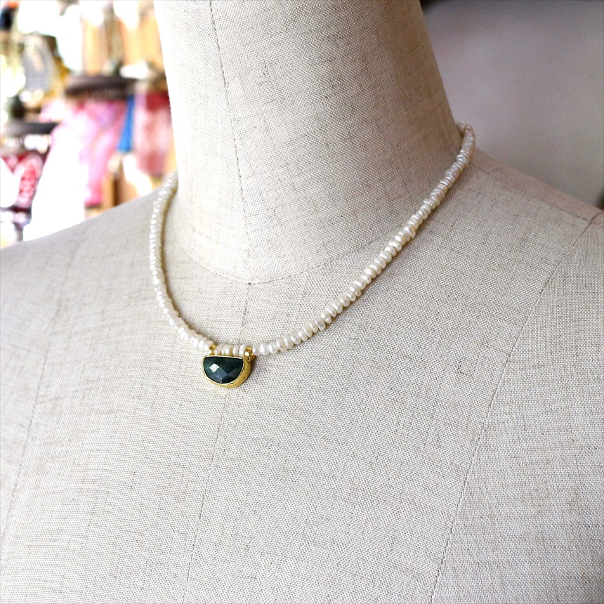 不揃いのパールと天然石のハーフムーンモチーフを組み合わせた、艶やかで、美しいコントラストが華やかなネックレスです。