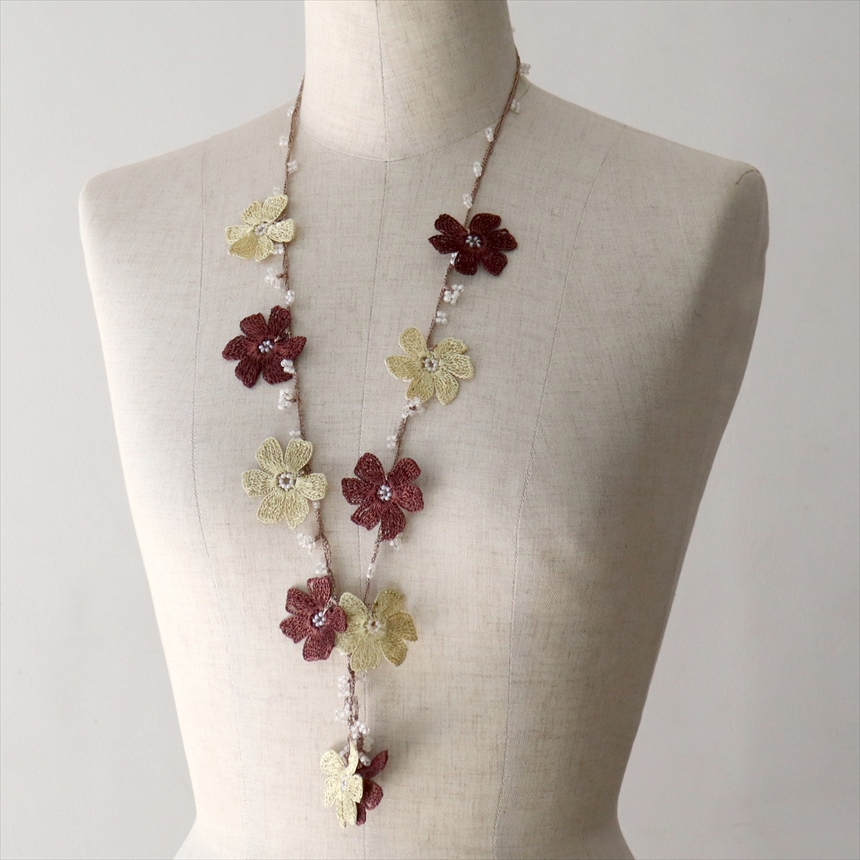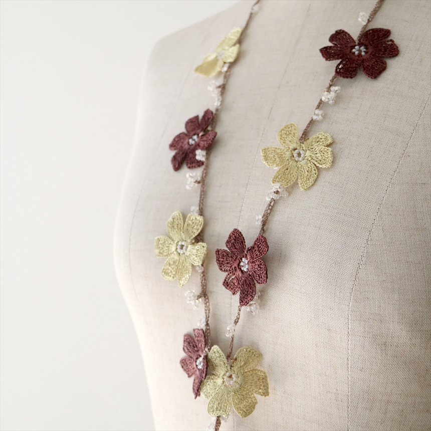 トルコの伝統的な手芸「オヤ」をモチーフにして、手編みで作られたネックレスです。このピースは、かぎ針で編んだ「トゥ・オヤ」の大ぶりな平面モチーフが使われた華やかなデザイン。