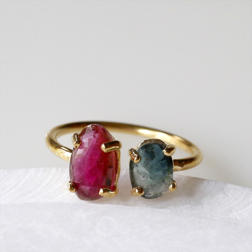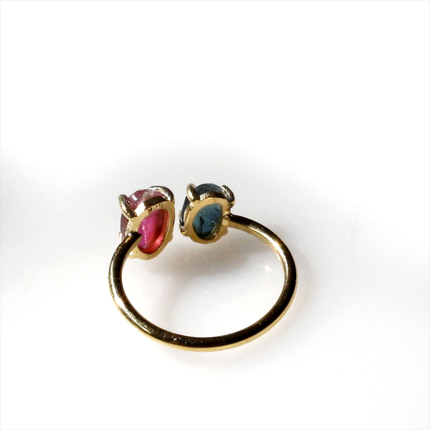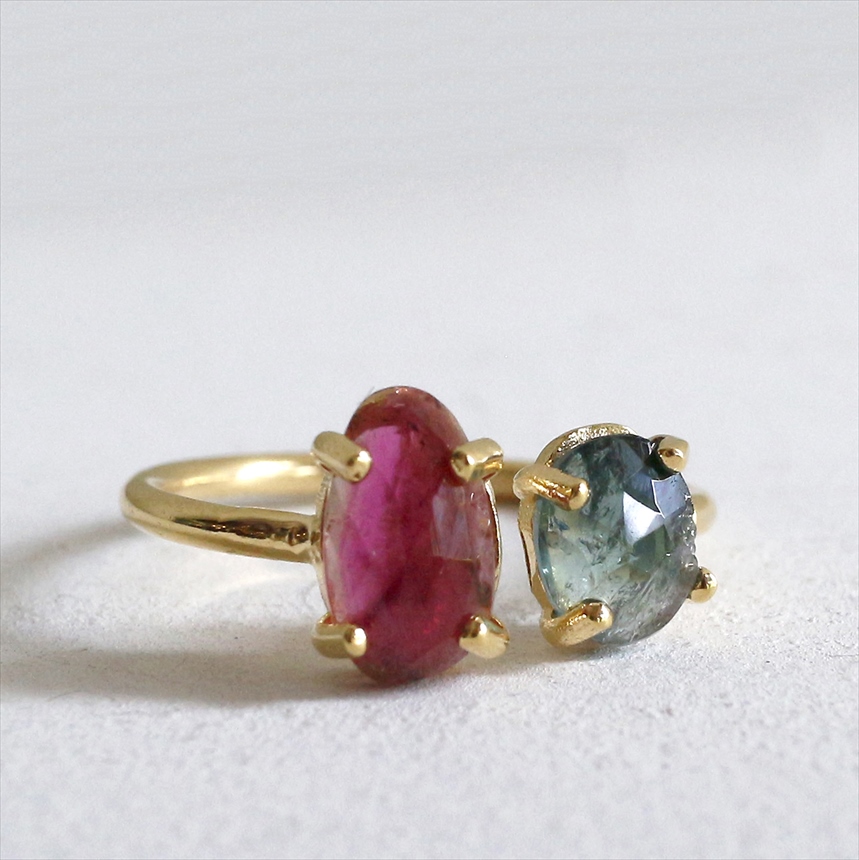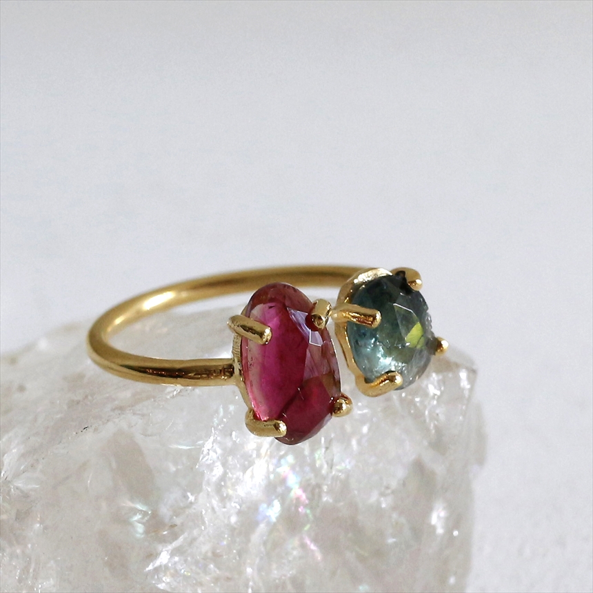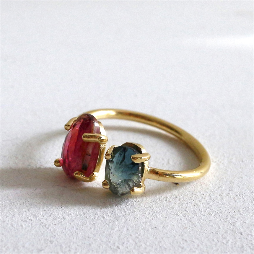 ウォーターメロントルマリン フォークリング シルバーリング 18KGF 天然石 バイカラーダブルストーン オープンリング