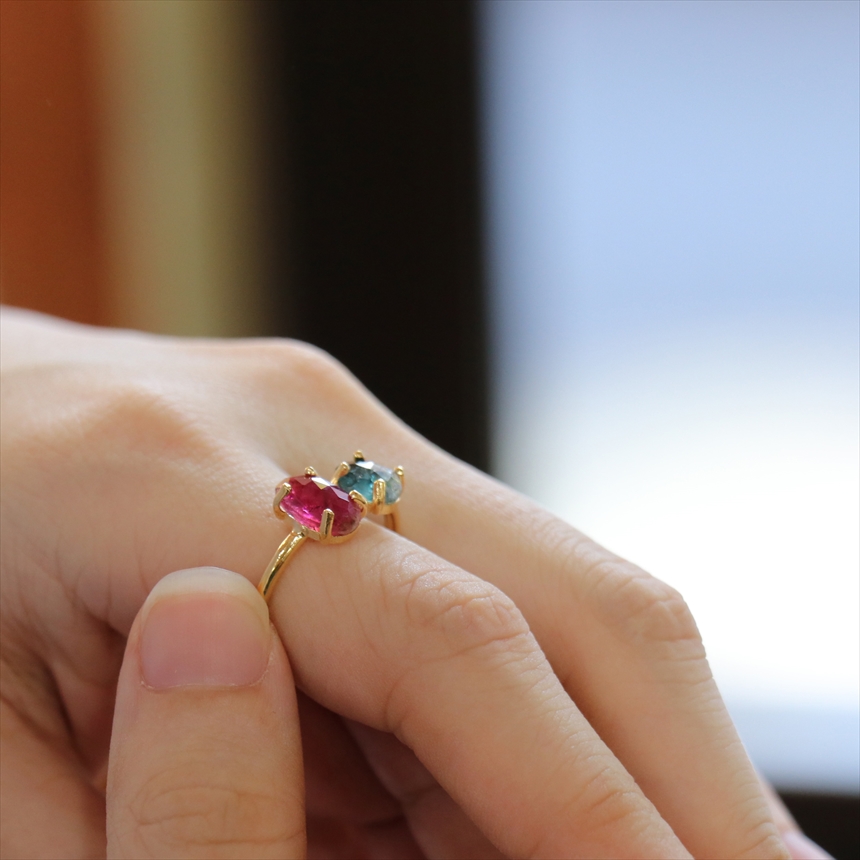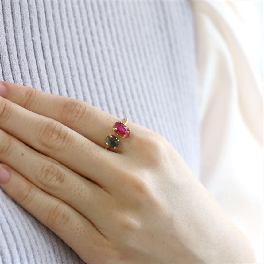 濃い鮮やかなピンクカラーと淡い透明感あるライトブルーグラデーションカラーの石のウォーターメロントルマリンフォークリング。爪留めのデザインが上品な印象。ウォーターメロントルマリンとは、その名の通り、スイカのように外側がグリーンで、内側が赤いピンクの配色からなるバイカラートルマリンのことをいいます。大きさ違いの石が寄り添うようなフォークリングデザインは手元を華奢にみせてくれます。※石大1×0.6cm