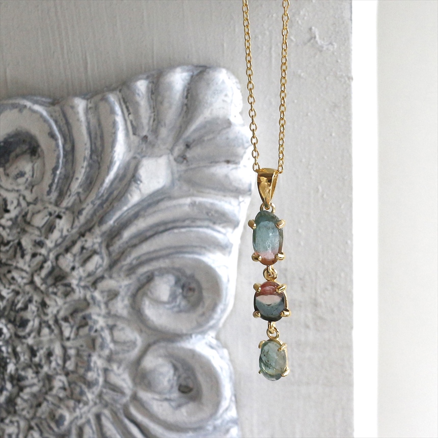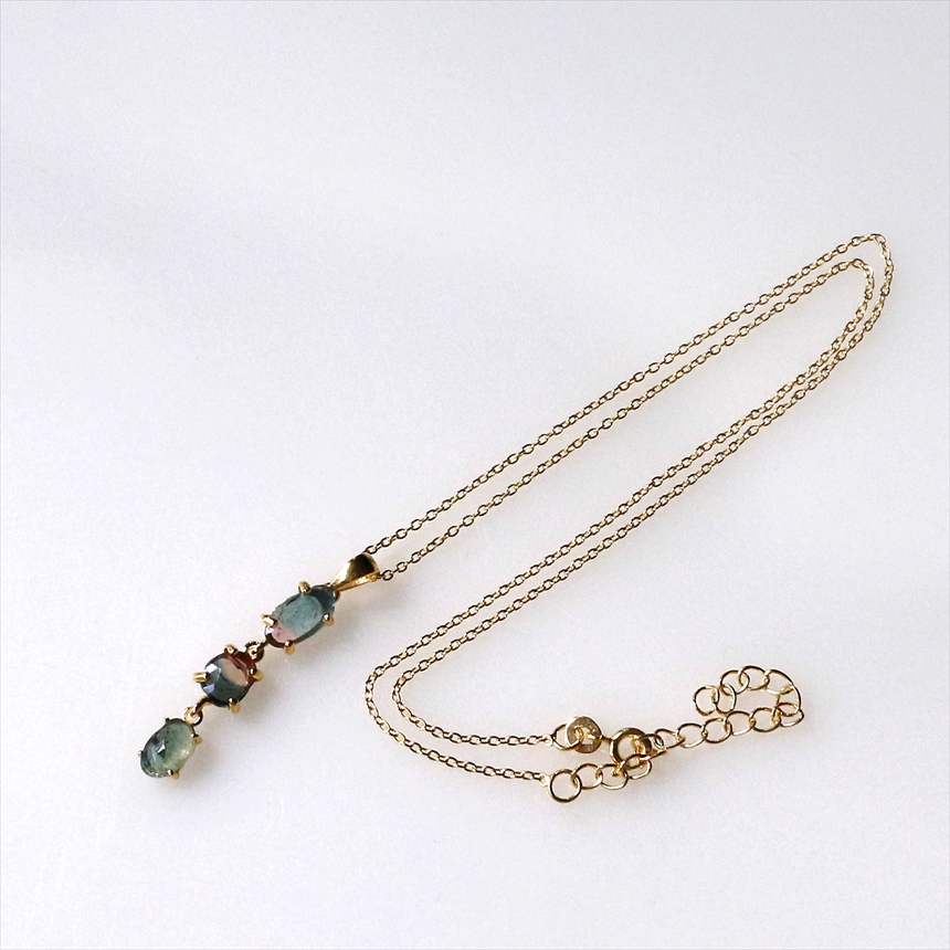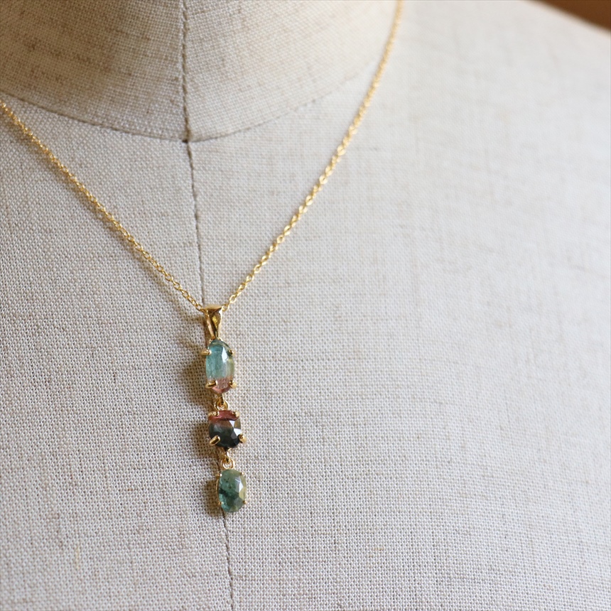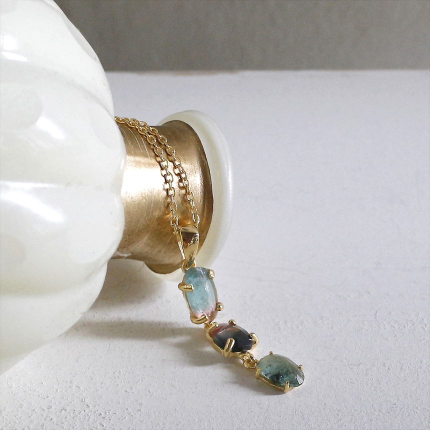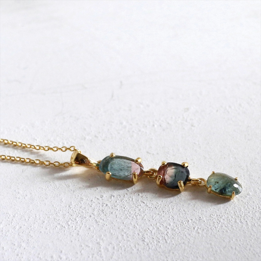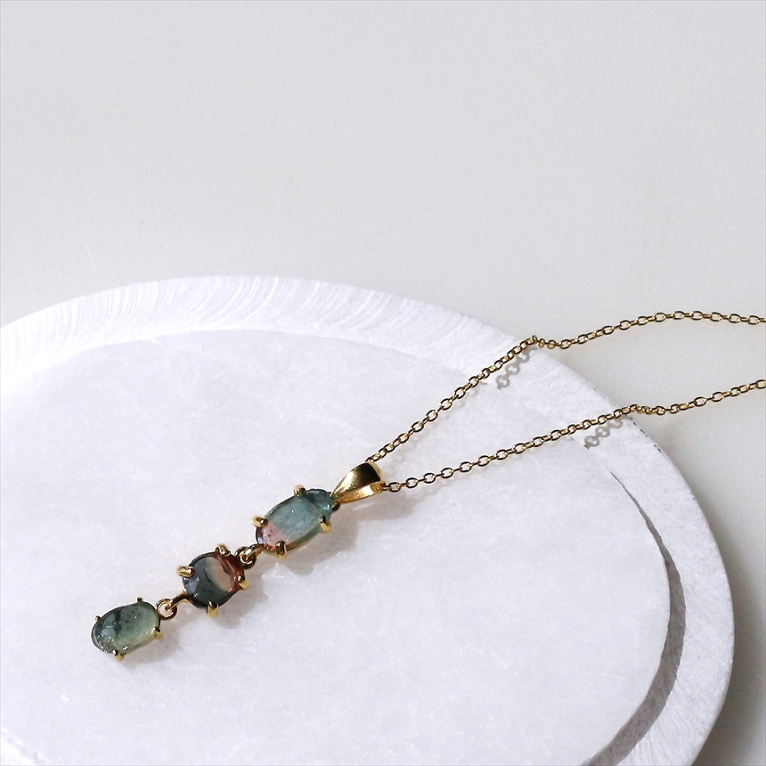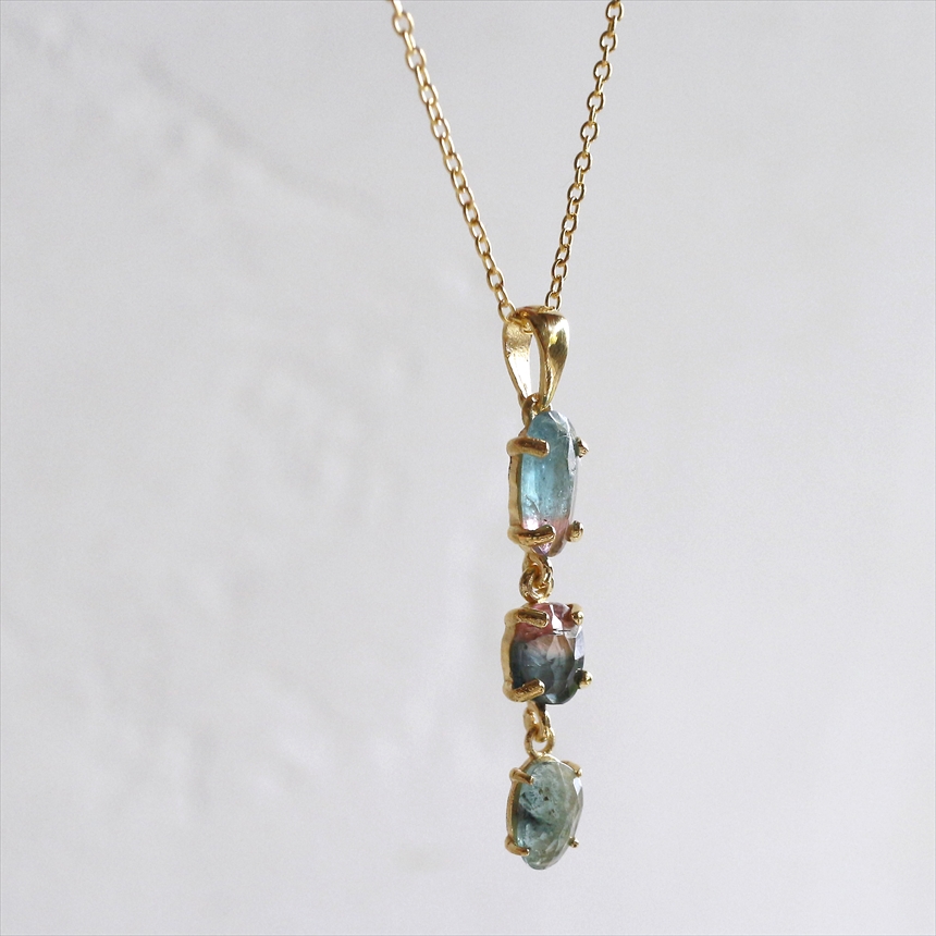 透明感あるブルーからピンクへのグラデーションの、ラフにカットされた石が三つ並んだウォーターメロントルマリンのネックレス。爪留めのデザインが上品な印象。ウォーターメロントルマリンとは、その名の通り、スイカのように外側がグリーンで、内側が赤いピンクの配色からなるバイカラートルマリンのことをいいます。大きさ違いの石が寄り添うようなフォークリングデザインは手元を華奢にみせてくれます。※石上1×0.6cm