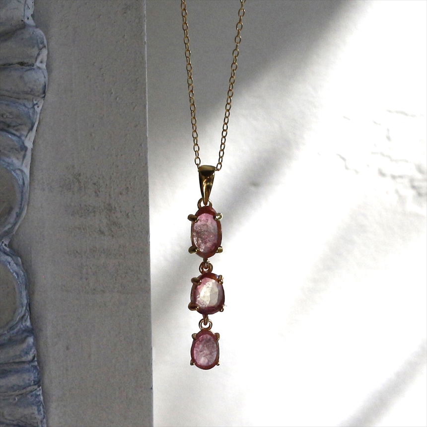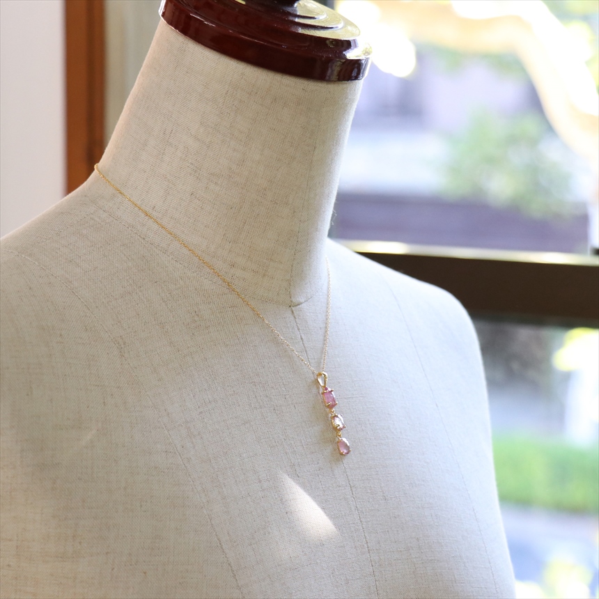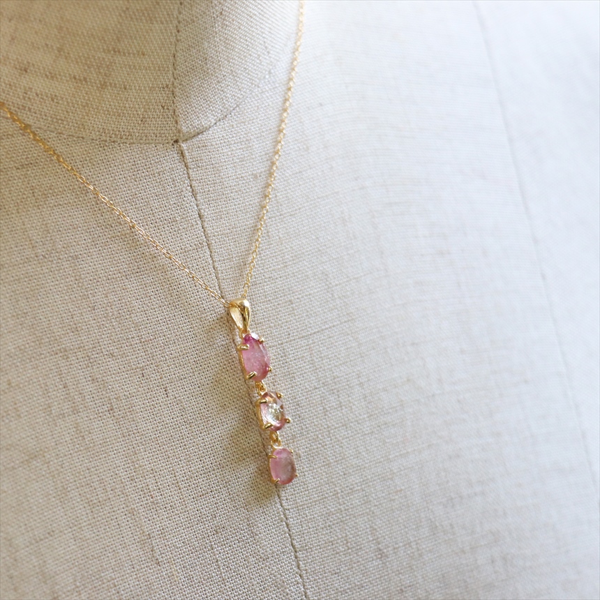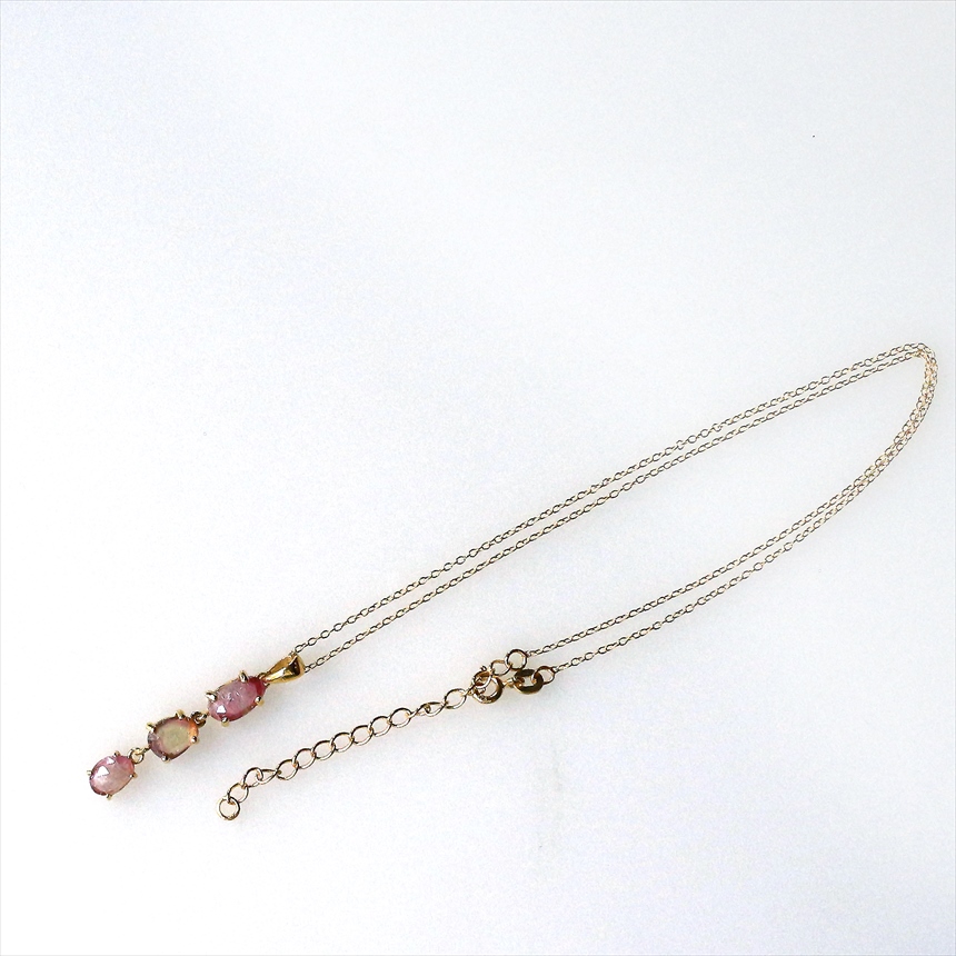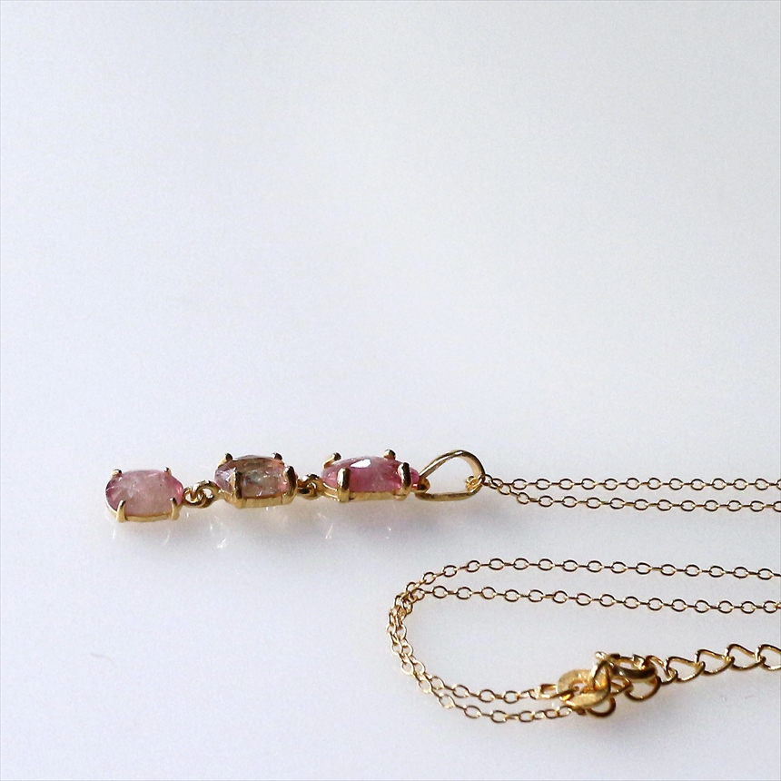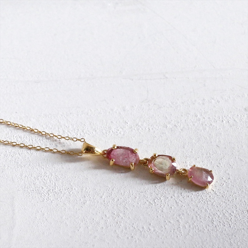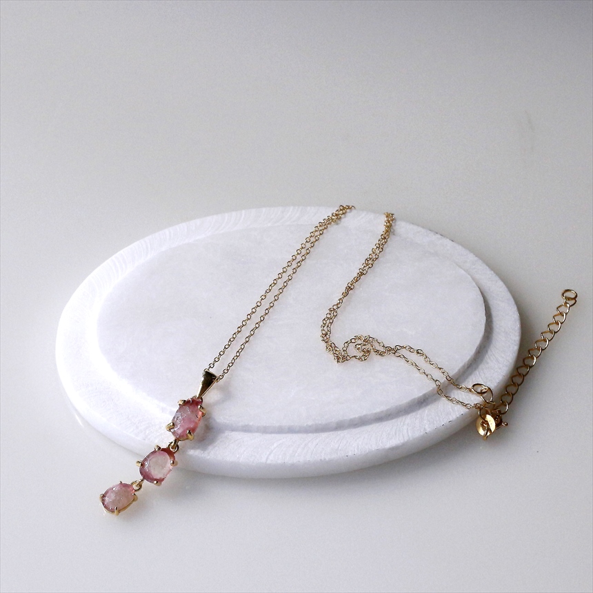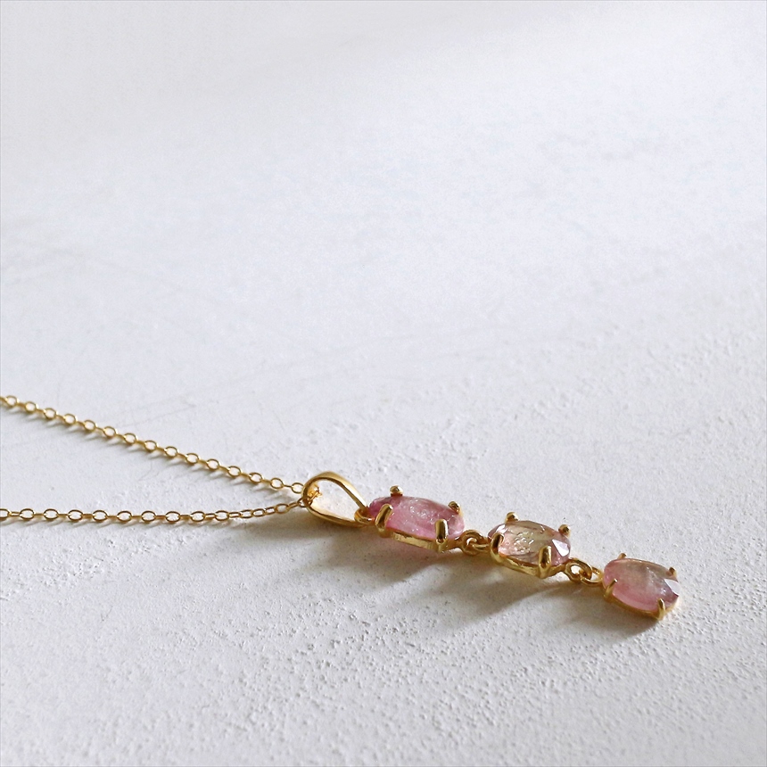 透明感ある淡いピンクへのグラデーションの、ラフにカットされた石が三つ並んだウォーターメロントルマリンのネックレス。爪留めのデザインが上品な印象。ウォーターメロントルマリンとは、その名の通り、スイカのように外側がグリーンで、内側が赤いピンクの配色からなるバイカラートルマリンのことをいいます。大きさ違いの石が寄り添うようなフォークリングデザインは手元を華奢にみせてくれます。※石上1×0.6cm