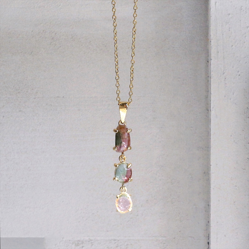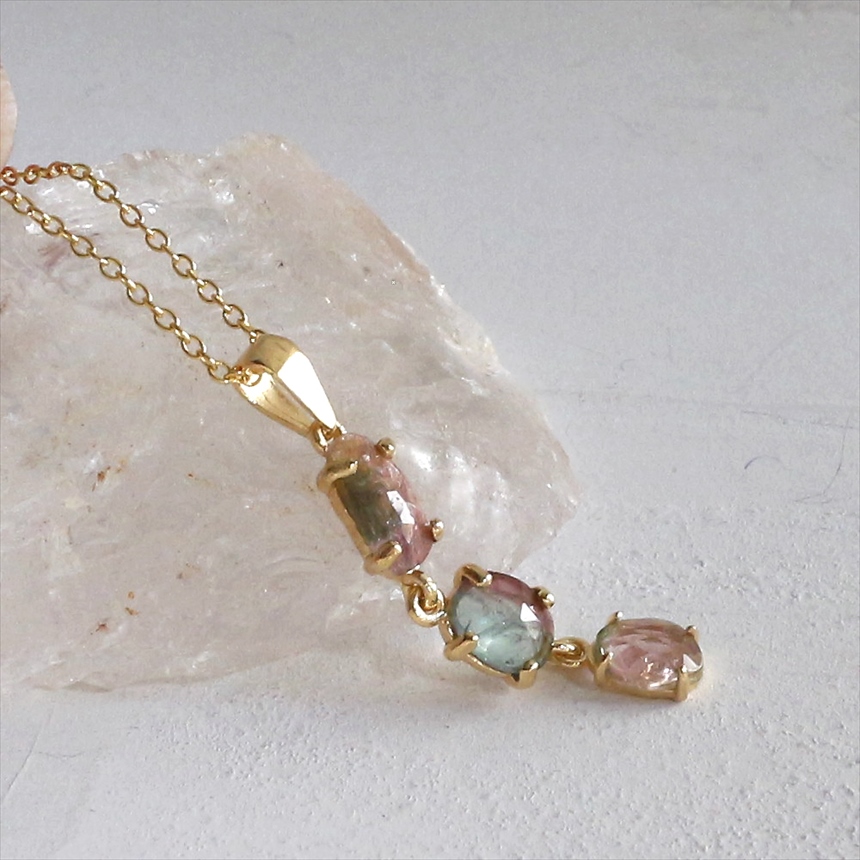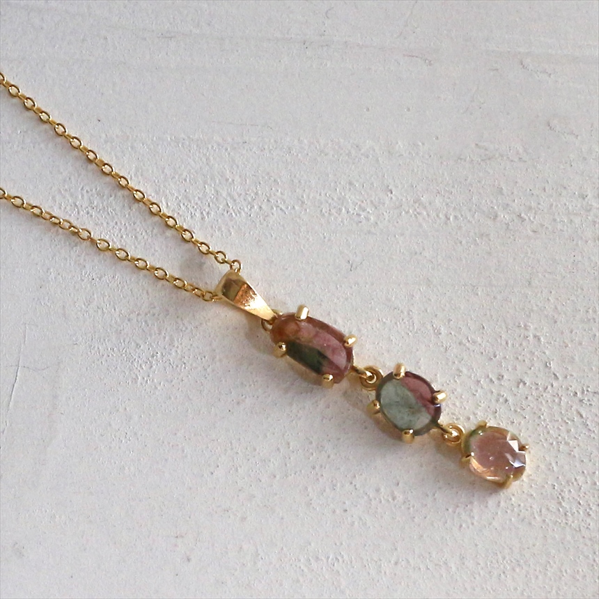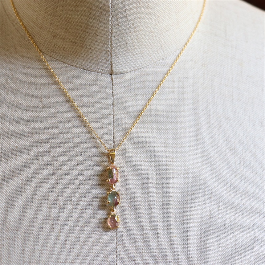 3っつのウォーターメロントルマリンのネックレス 18KGF 天然石 バイカラーダブルストーン オープンリング