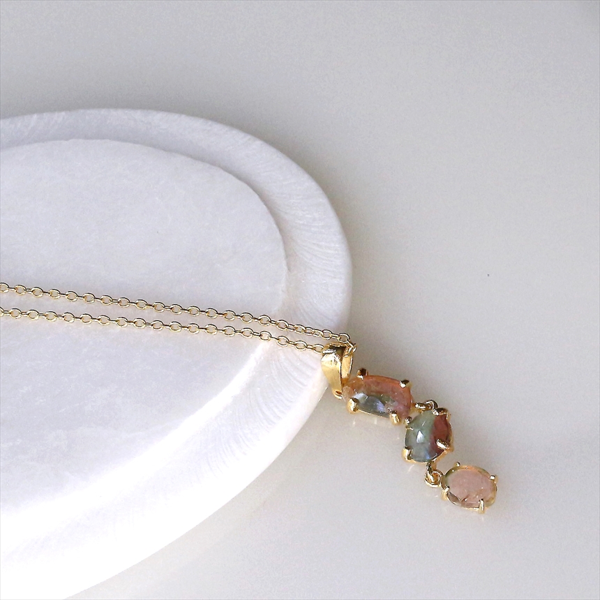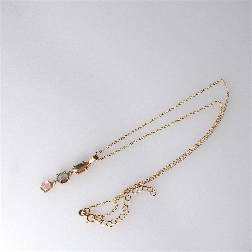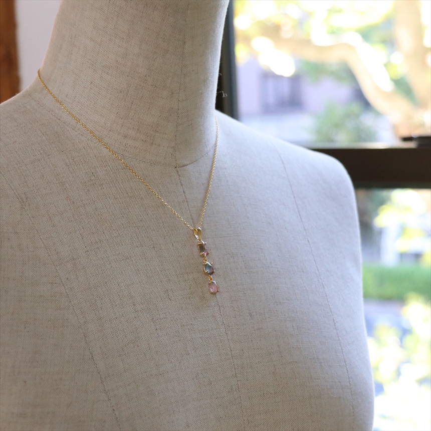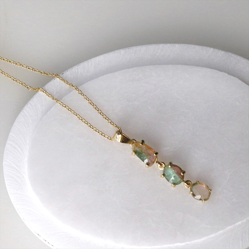 透明感あるブルーからピンクへのグラデーションの、ラフにカットされた石が三つ並んだウォーターメロントルマリンのネックレス。爪留めのデザインが上品な印象。ウォーターメロントルマリンとは、その名の通り、スイカのように外側がグリーンで、内側が赤いピンクの配色からなるバイカラートルマリンのことをいいます。大きさ違いの石が寄り添うようなフォークリングデザインは手元を華奢にみせてくれます。※石上1×0.6cm