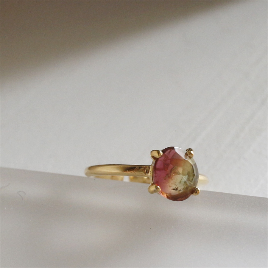 ラフにカットされたウォーターメロントルマリンの一粒リング。指にちょこんと乗るようなかわいらしいサイズながらも、ローズカットが施され、つぼみの様な立体感のあるデザインです。ウォーターメロントルマリンとは、その名の通り、スイカのように外側がグリーンで、内側が赤いピンクの配色からなるバイカラートルマリンのことをいいます。爪留めデザインは周りからたくさんの光がさすので、石のそのままの美しさを引き立てます。