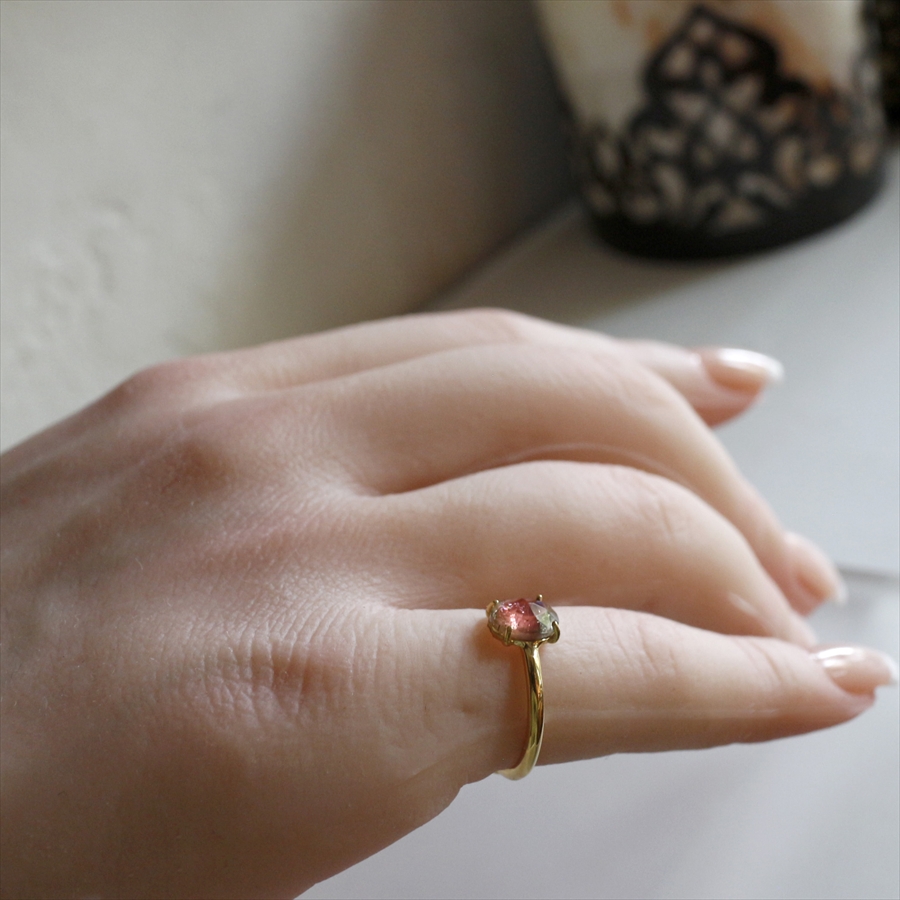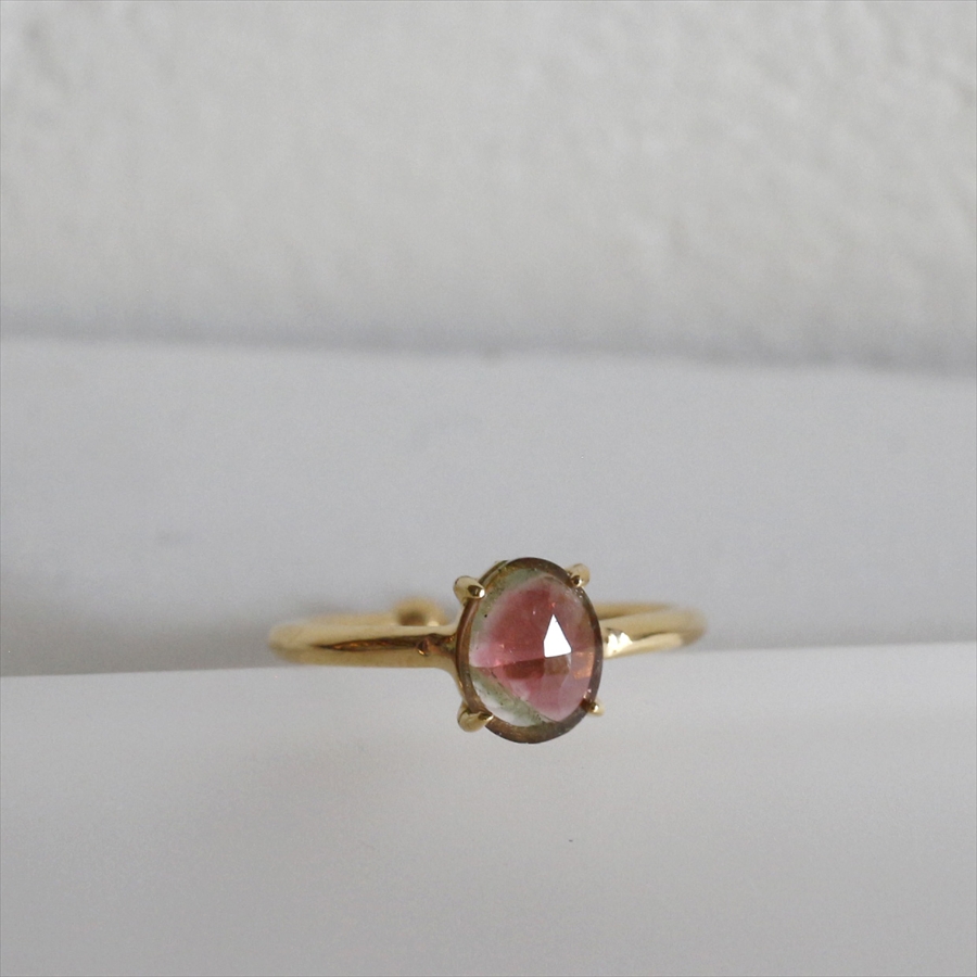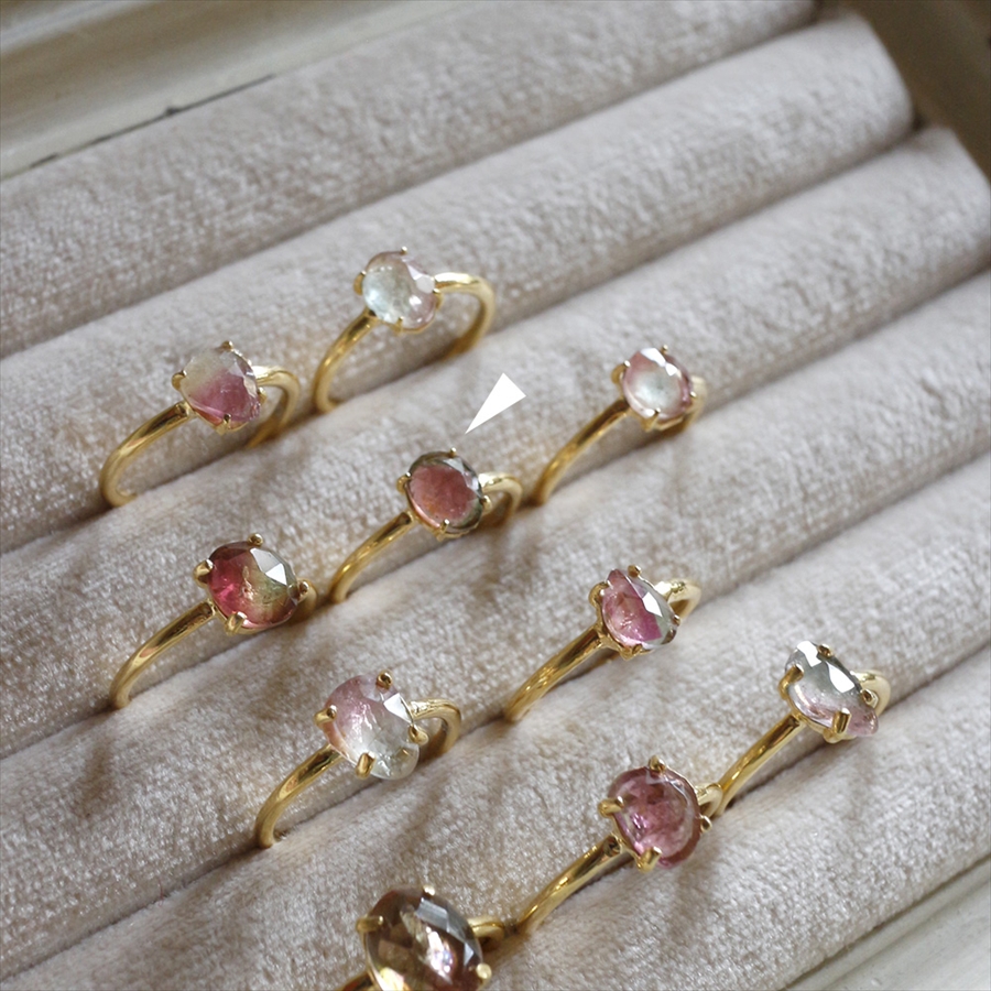 ラフにカットされたウォーターメロントルマリンの一粒リング。指にちょこんと乗るようなかわいらしいサイズながらも、ローズカットが施され、つぼみの様な立体感のあるデザインです。ウォーターメロントルマリンとは、その名の通り、スイカのように外側がグリーンで、内側が赤いピンクの配色からなるバイカラートルマリンのことをいいます。爪留めデザインは周りからたくさんの光がさすので、石のそのままの美しさを引き立てます。
