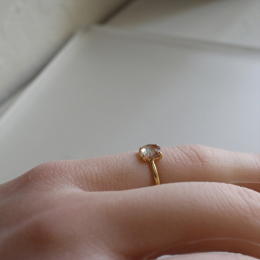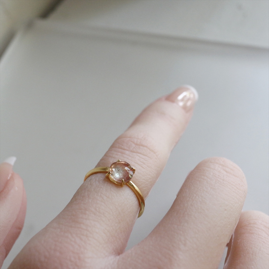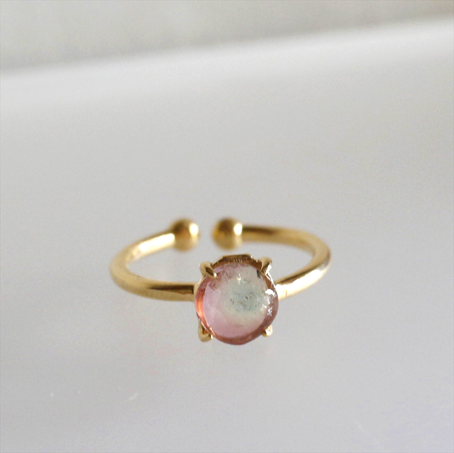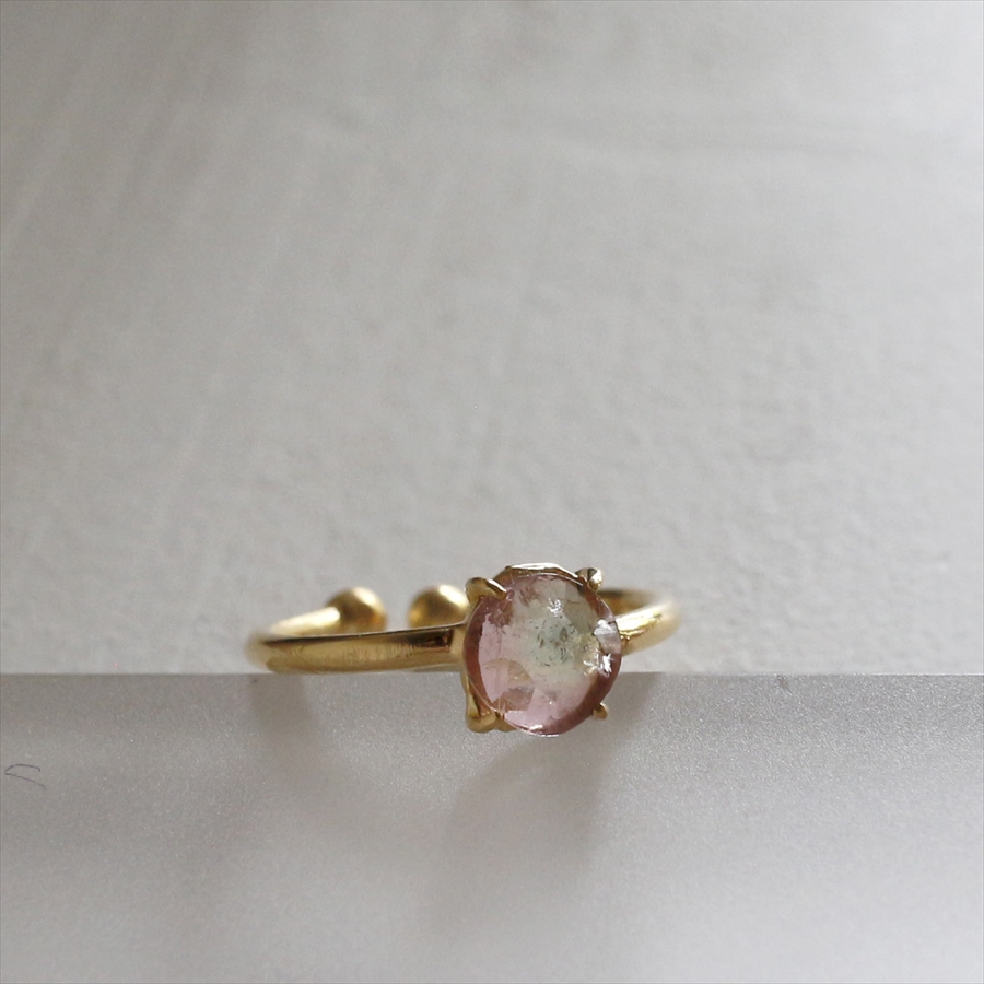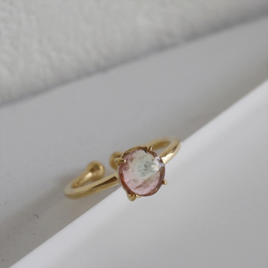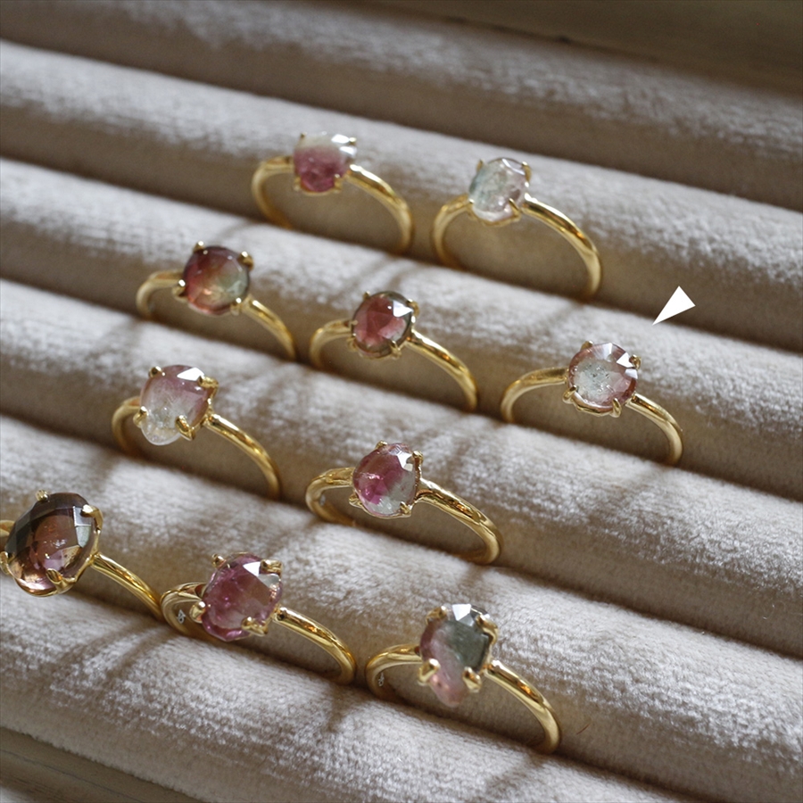 ラフにカットされたウォーターメロントルマリンの一粒リング。指にちょこんと乗るようなかわいらしいサイズながらも、ローズカットが施され、つぼみの様な立体感のあるデザインです。ウォーターメロントルマリンとは、その名の通り、スイカのように外側がグリーンで、内側が赤いピンクの配色からなるバイカラートルマリンのことをいいます。爪留めデザインは周りからたくさんの光がさすので、石のそのままの美しさを引き立てます。