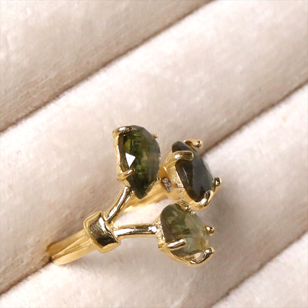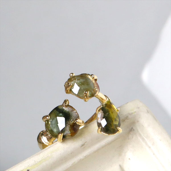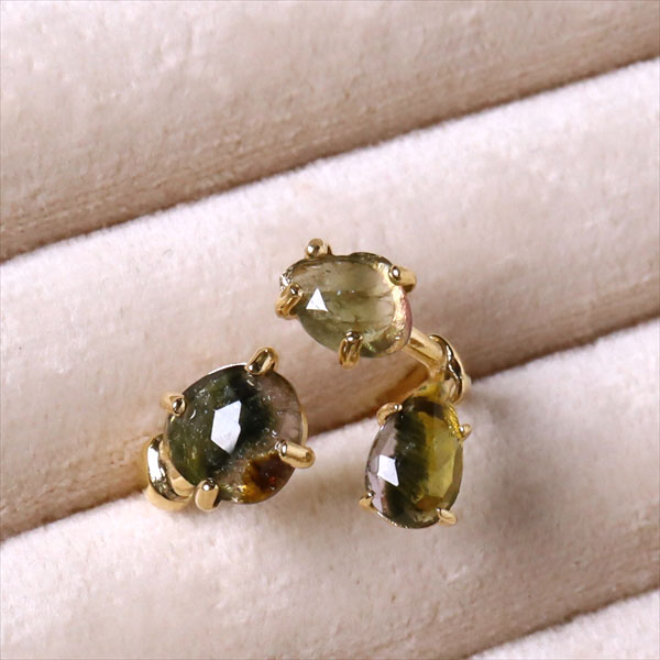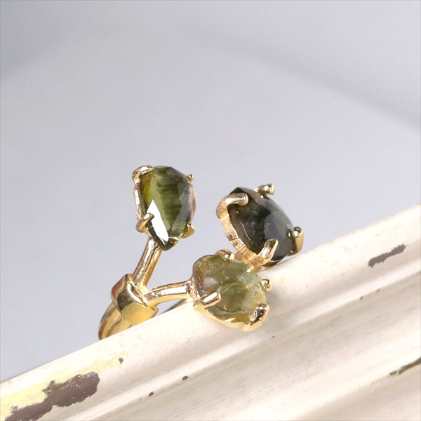 トルマリン 3ストーンシルバーリング 18KGF 天然石 バイカラーラフカット カラーストーン