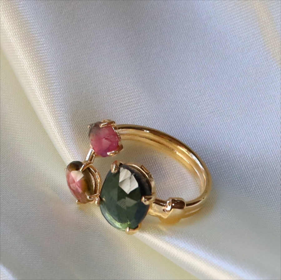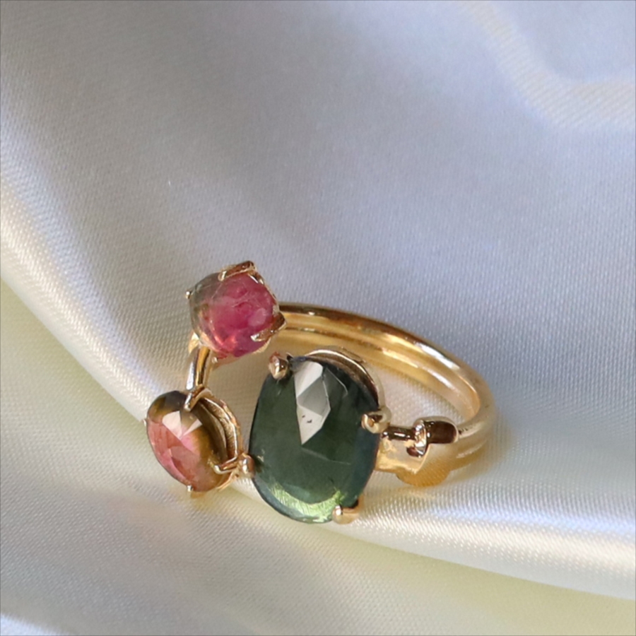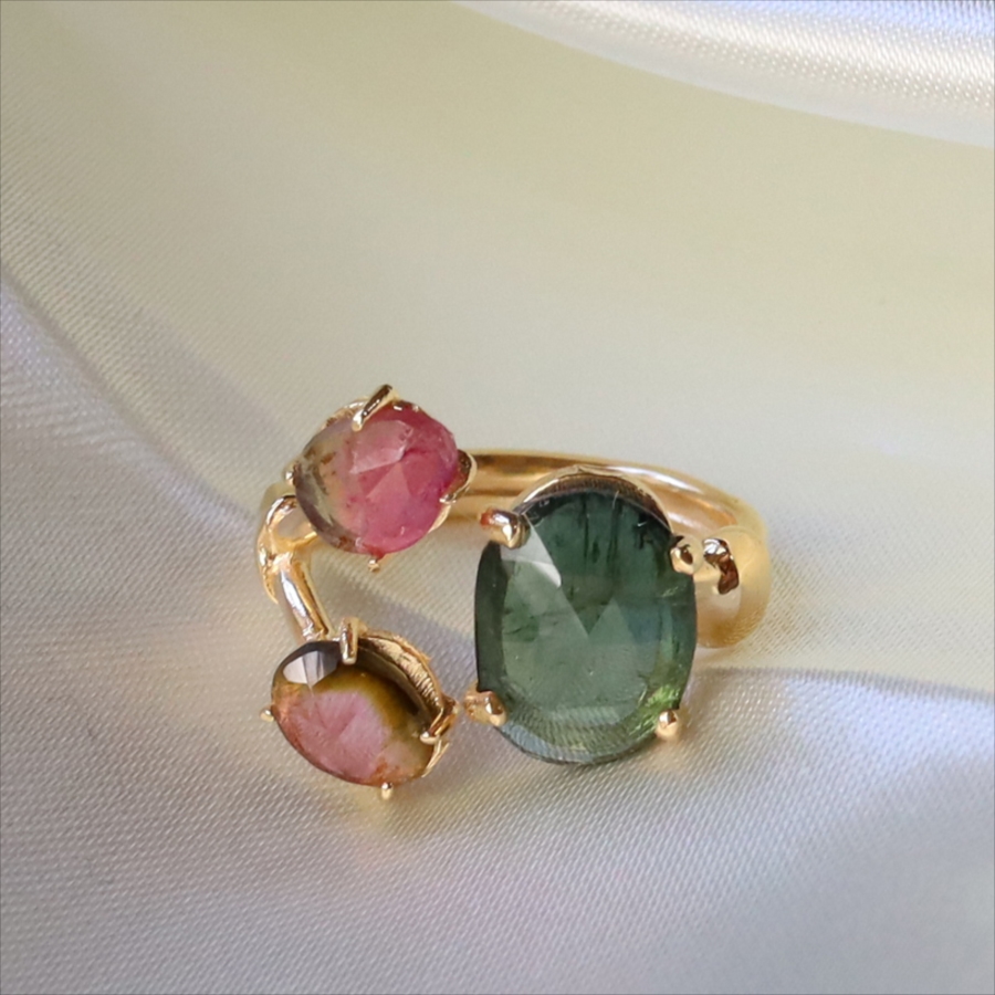ウォーターメロントルマリン 3ストーンシルバーリング 18KGF 天然石 バイカラーラフカット カラーストーン