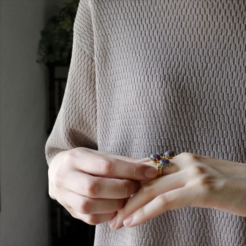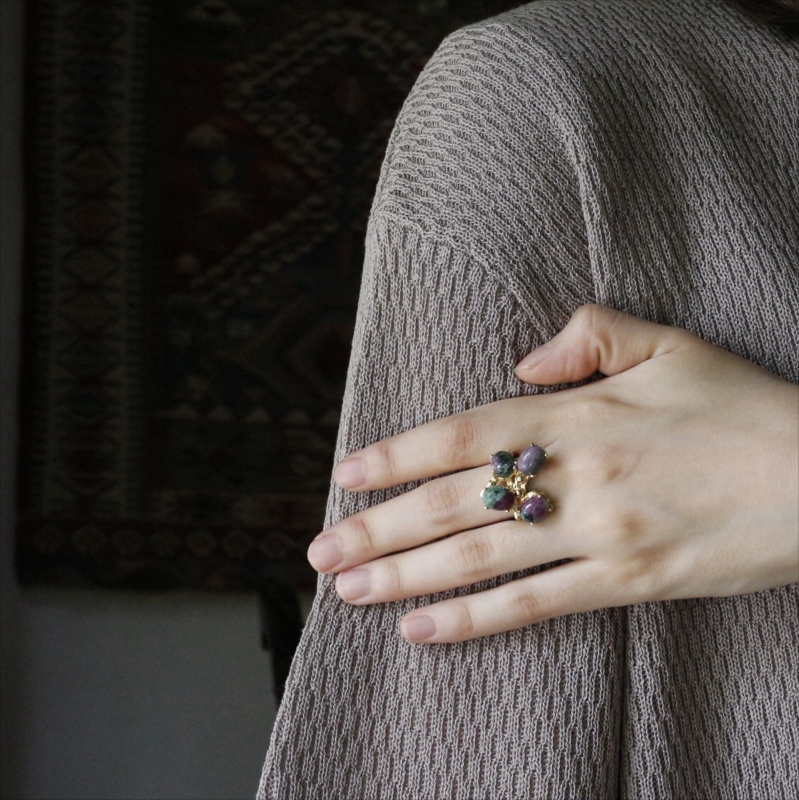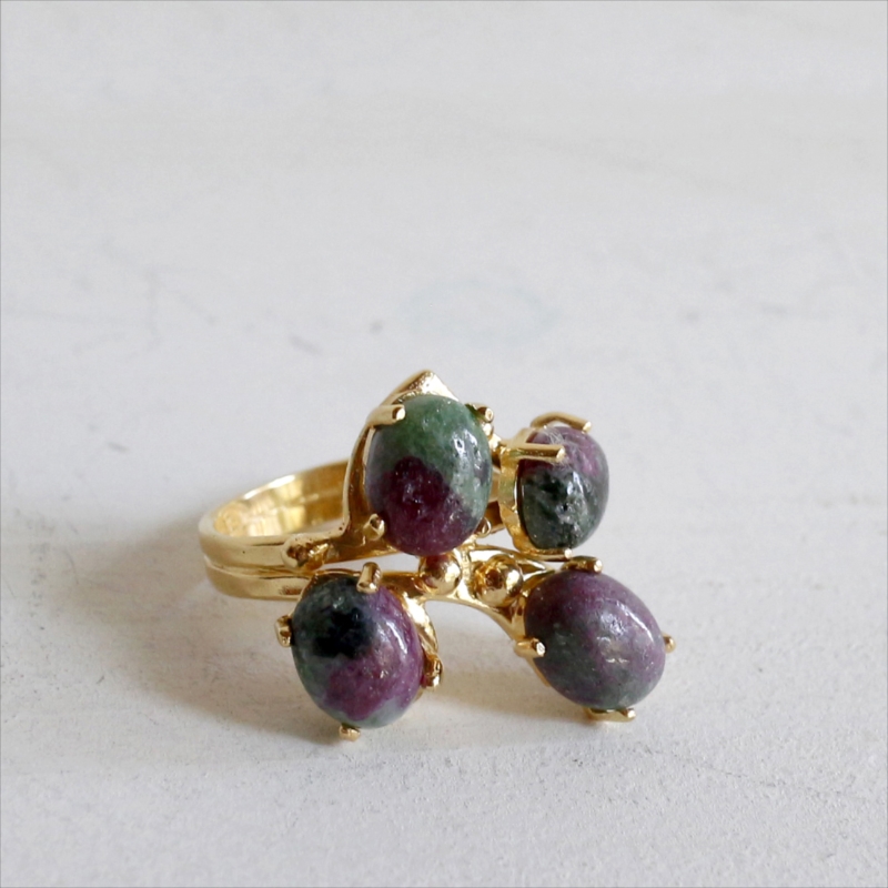 コロンとしたカボションカットのルビーインゾイサイトが四つ集まった不思議なデザインのユニークなリングです。