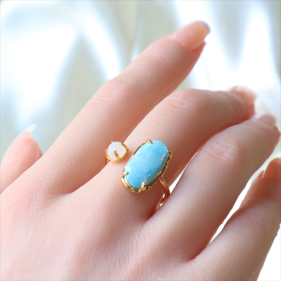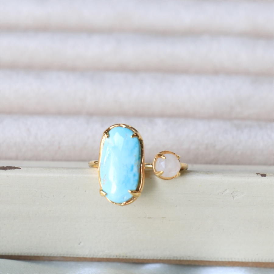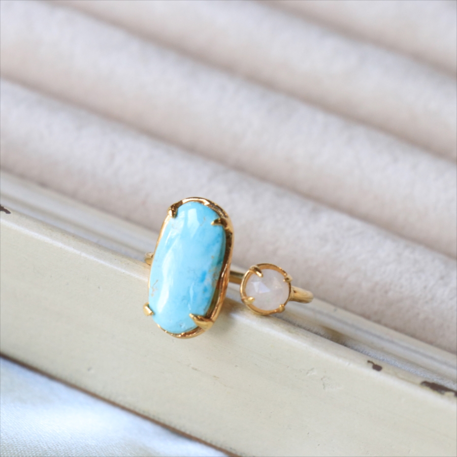 大粒のマットな淡いブルーカラーのターコイズに寄り添うコロンとしたレインボームーンストーン。ゴールドカラーとの相性が良く上品な印象です。