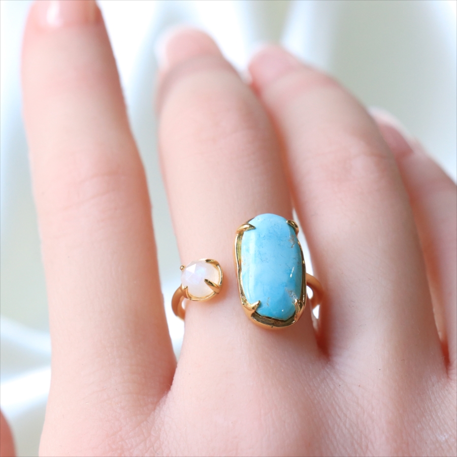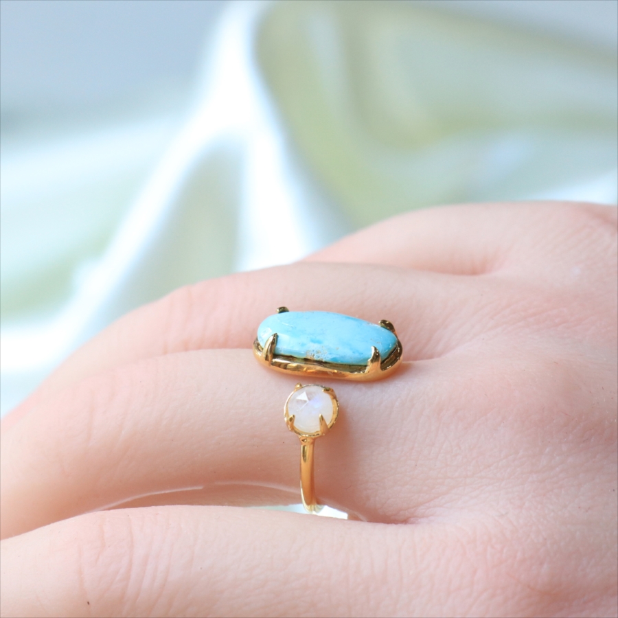 ターコイズ シルバーリングトルコ石 2ストーン レインボウムーンストーン 18Kゴールドフィルド