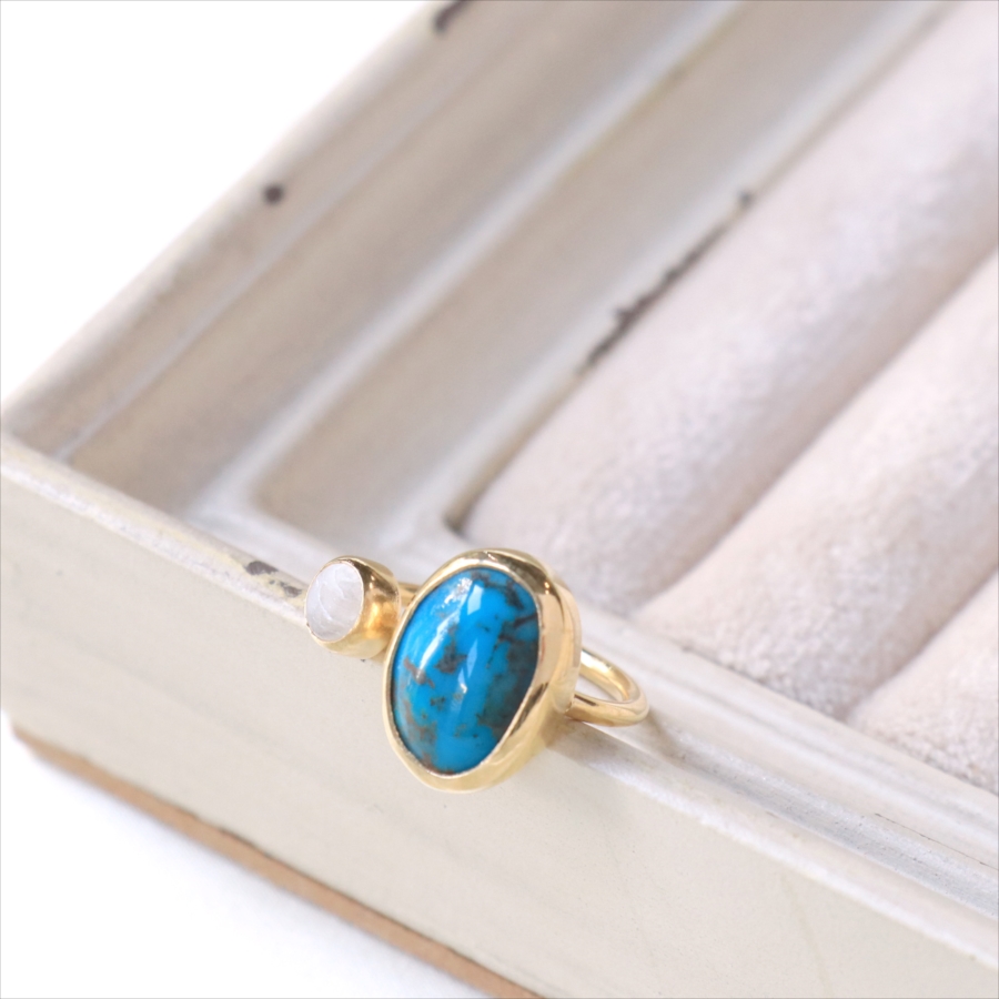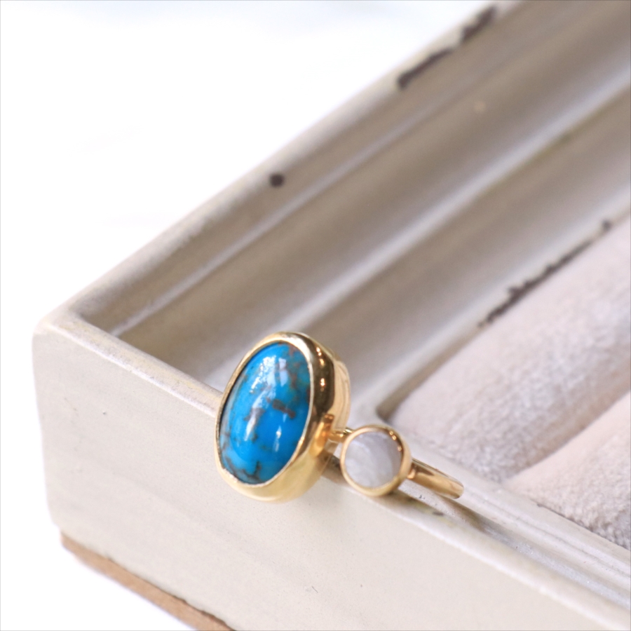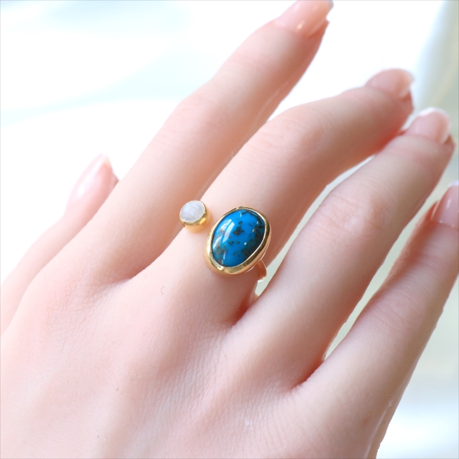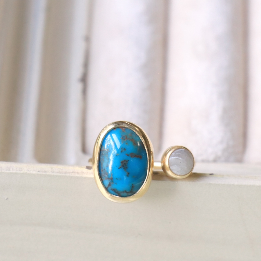 原石の雰囲気をそのままに大粒のマットなブルーカラーのターコイズに寄り添うコロンとしたムーンストーン。ゴールドカラーとの相性が良く上品な印象です。