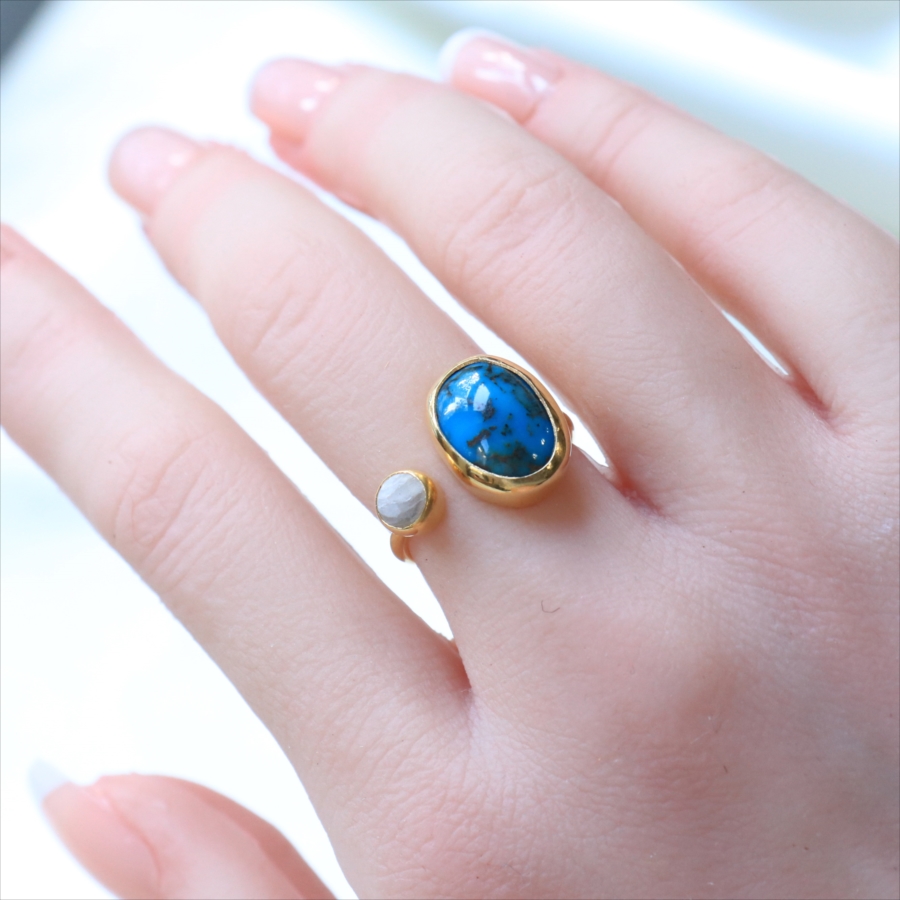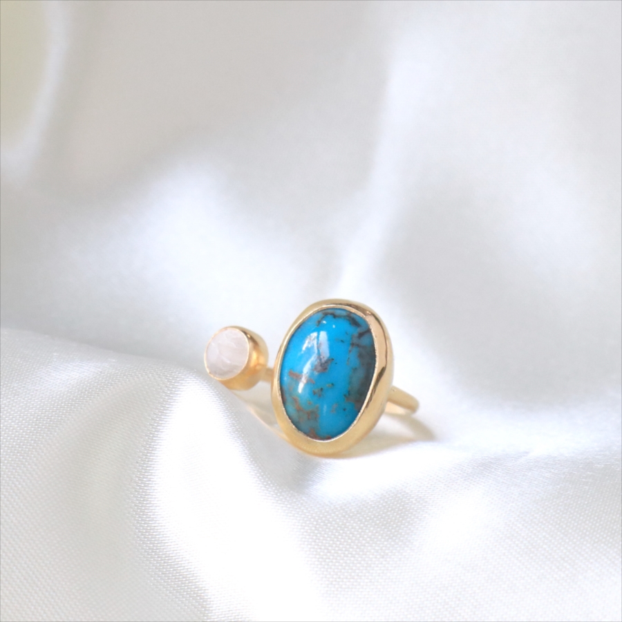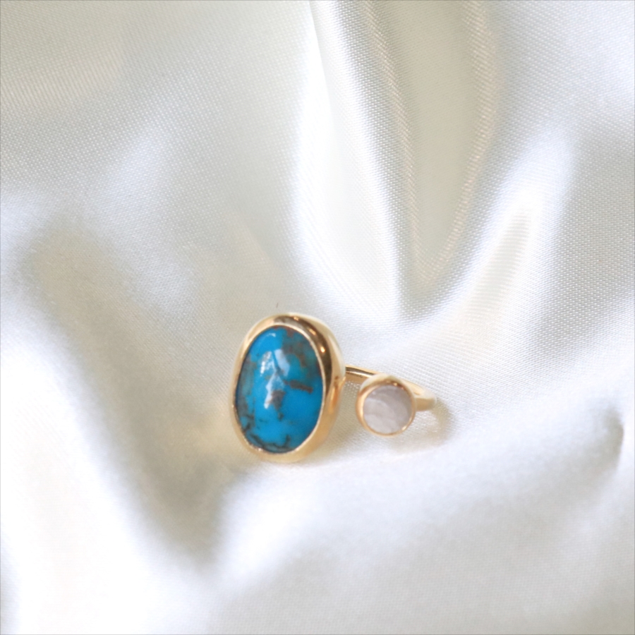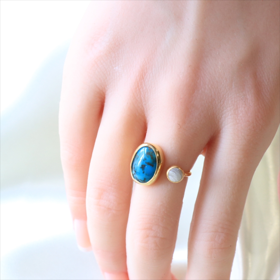 原石の雰囲気をそのままに大粒のマットなブルーカラーのターコイズに寄り添うコロンとしたムーンストーン。ゴールドカラーとの相性が良く上品な印象です。