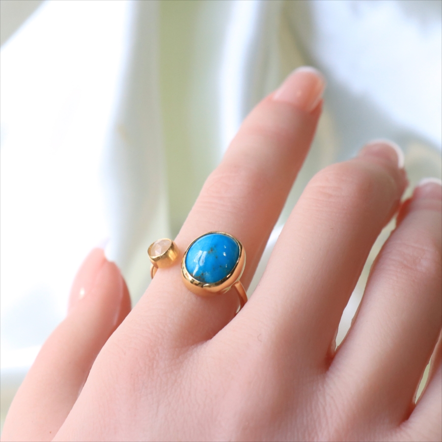 原石の雰囲気をそのままに大粒のマットなブルーカラーのターコイズに寄り添うコロンとしたムーンストーン。ゴールドカラーとの相性が良く上品な印象です。