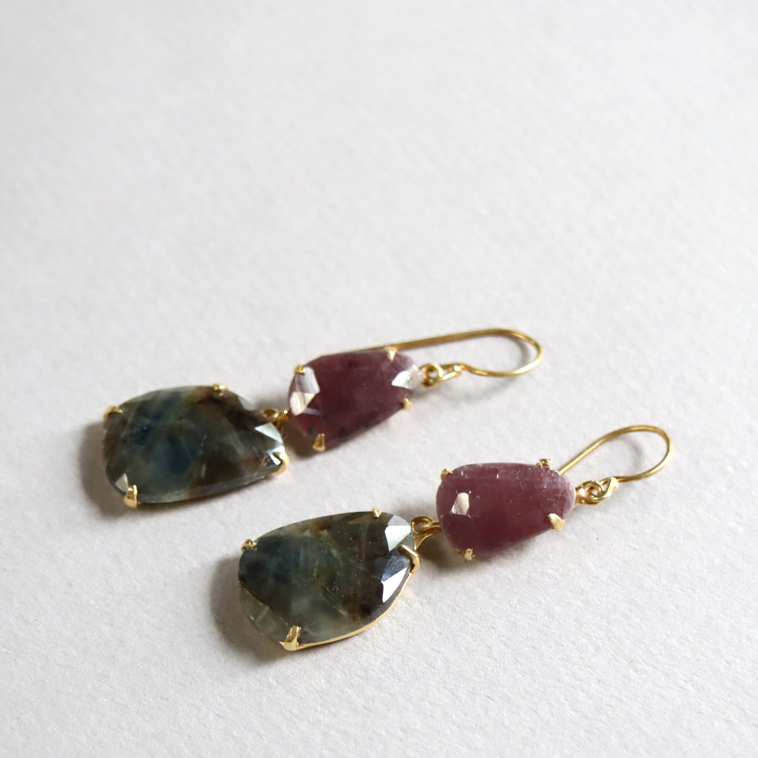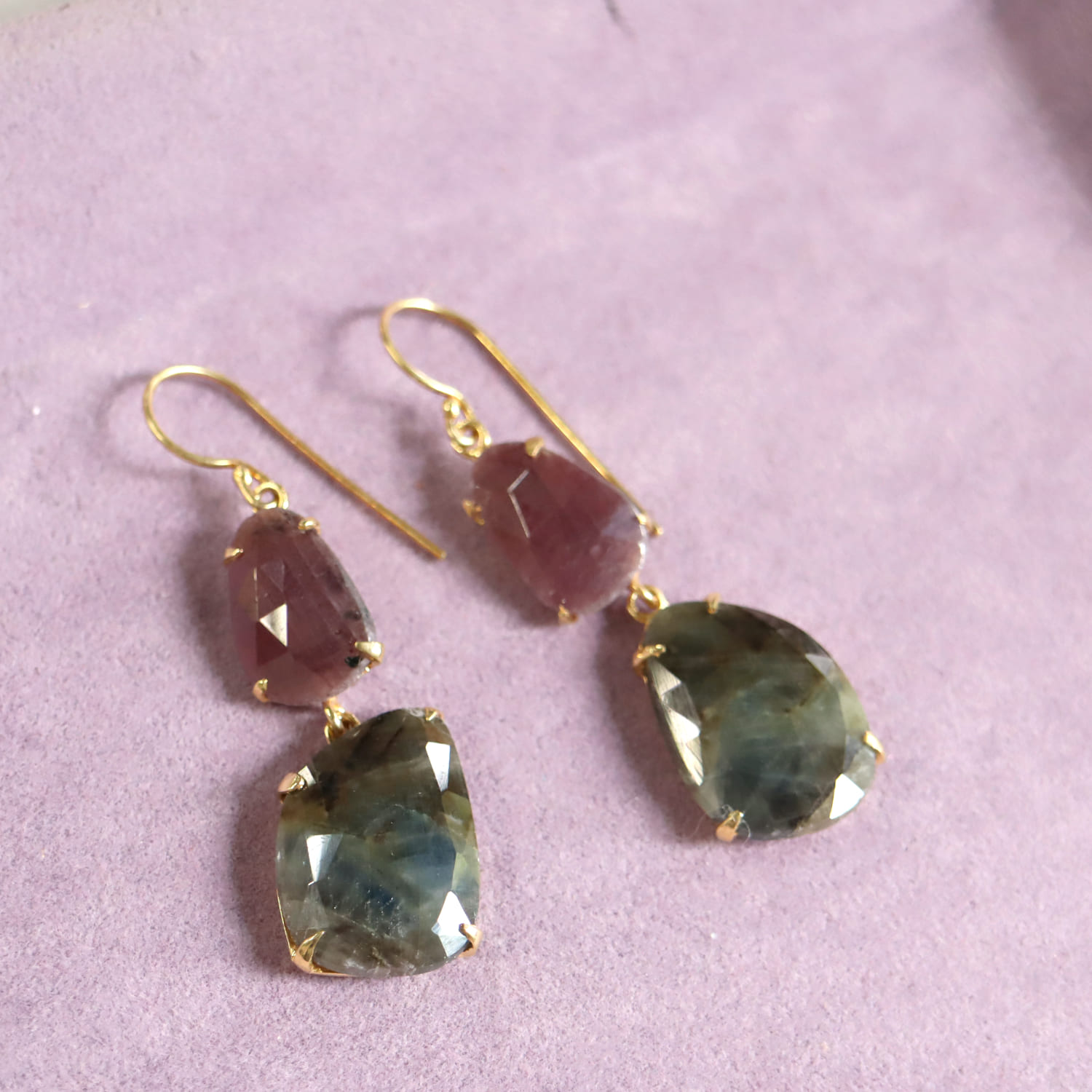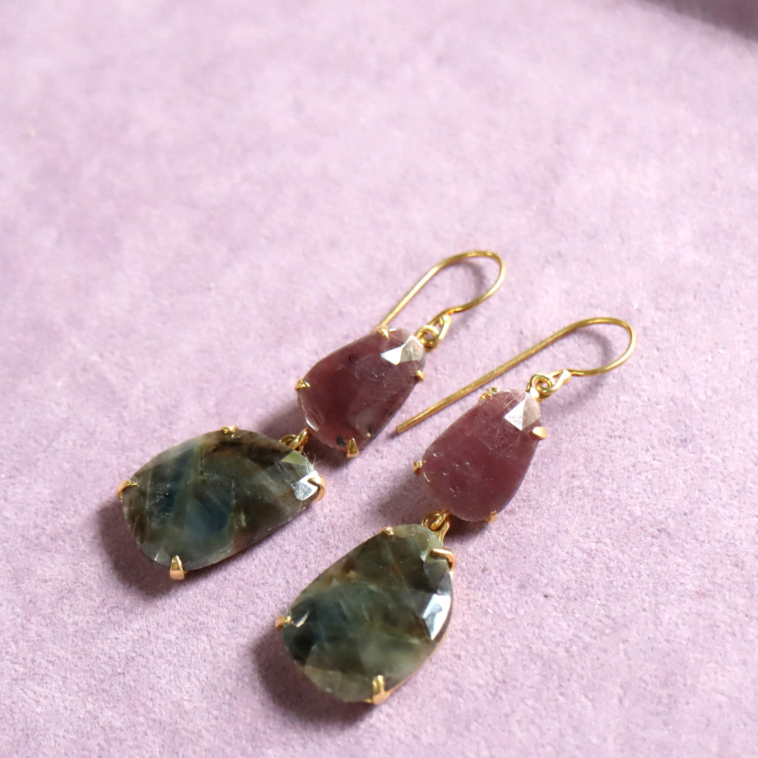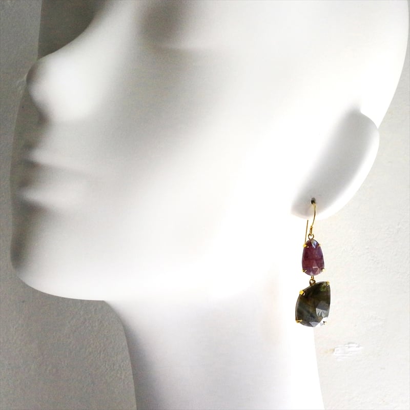 淡い赤紫のグレープカラーと、青みを帯びたグレーの濁りの結晶が大変美しい二つのサファイアのシルバーピアスです。丁寧にローズカットが施され石が、耳元で光を反射し、動くたびにきらきらと揺れ輝きます。