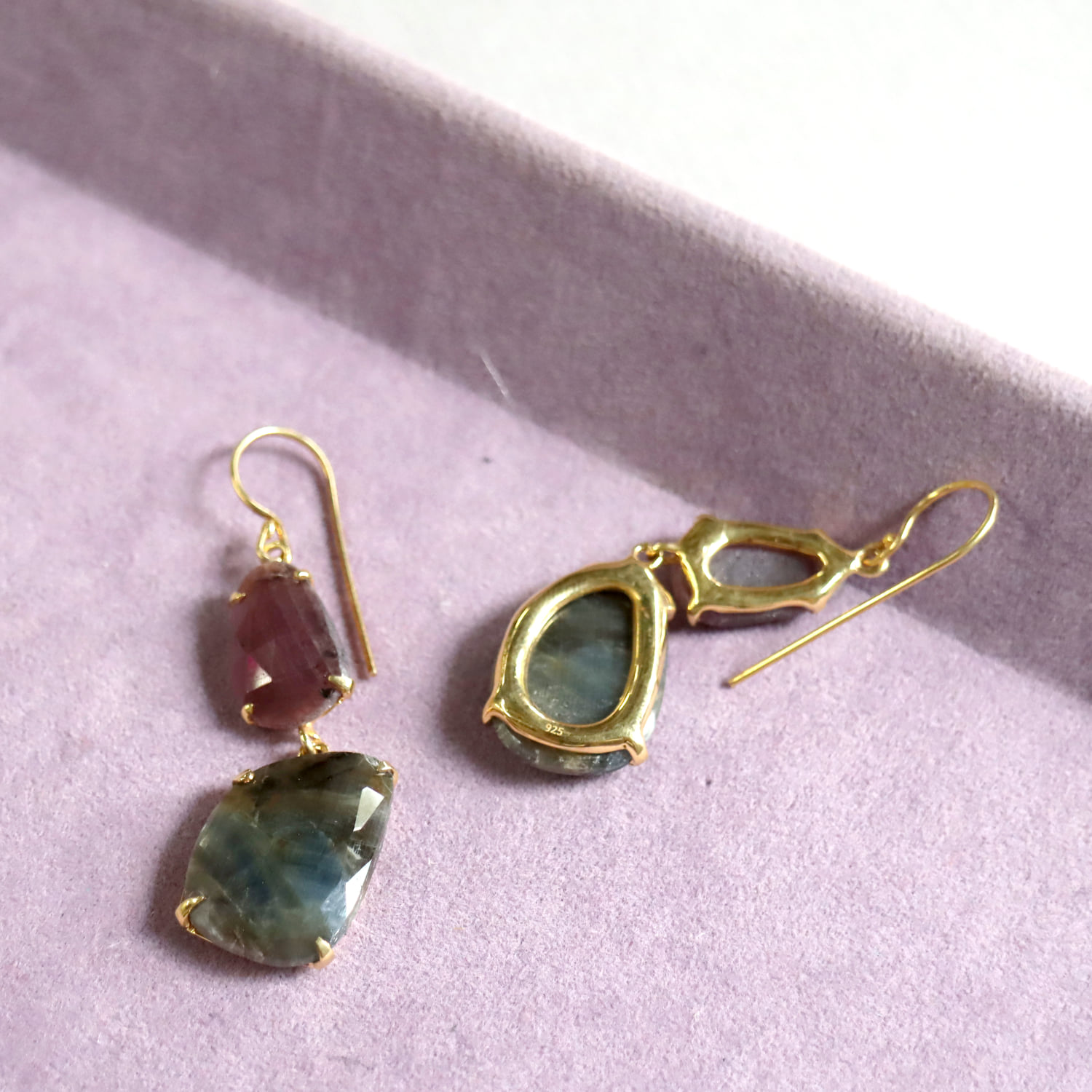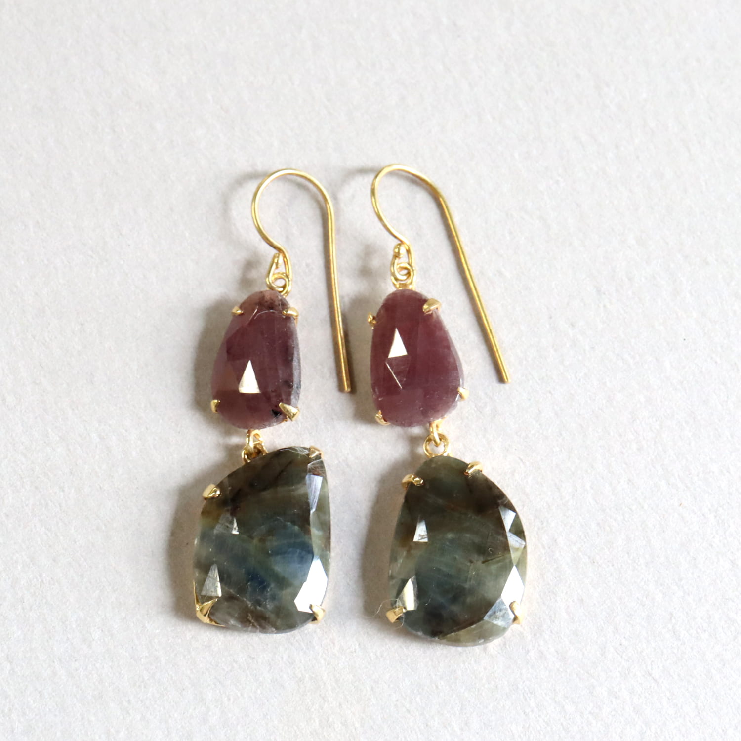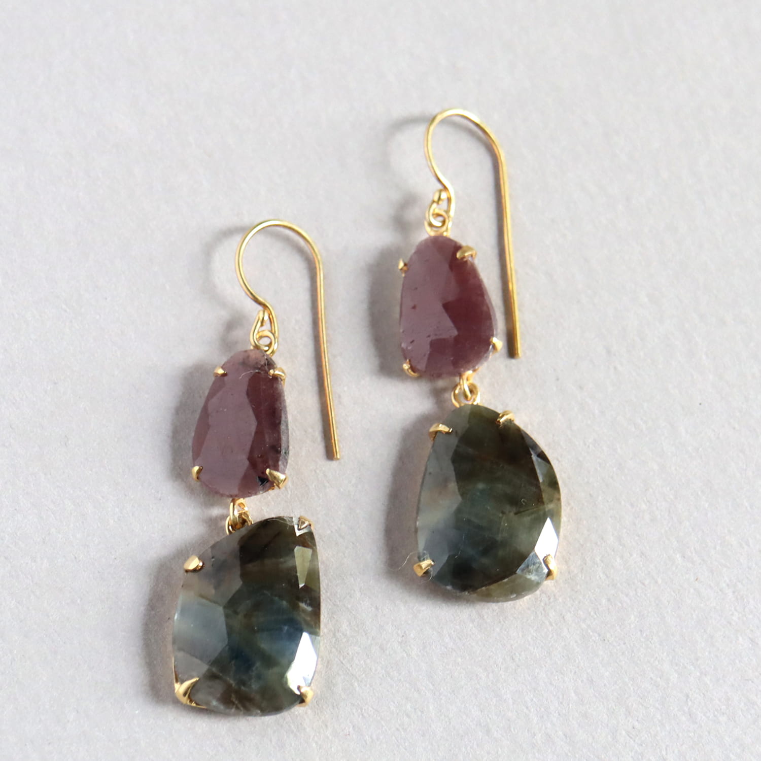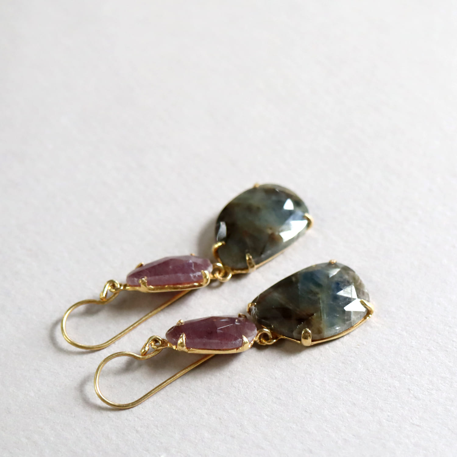淡い赤紫のグレープカラーと、青みを帯びたグレーの濁りの結晶が大変美しい二つのサファイアのシルバーピアスです。丁寧にローズカットが施され石が、耳元で光を反射し、動くたびにきらきらと揺れ輝きます。