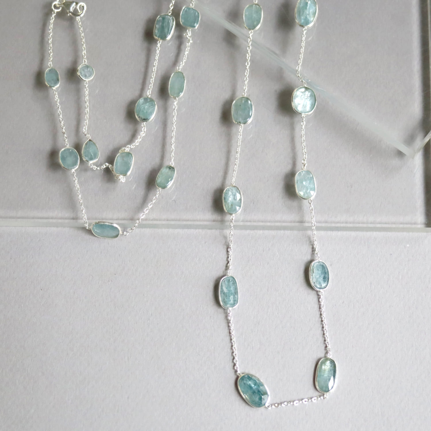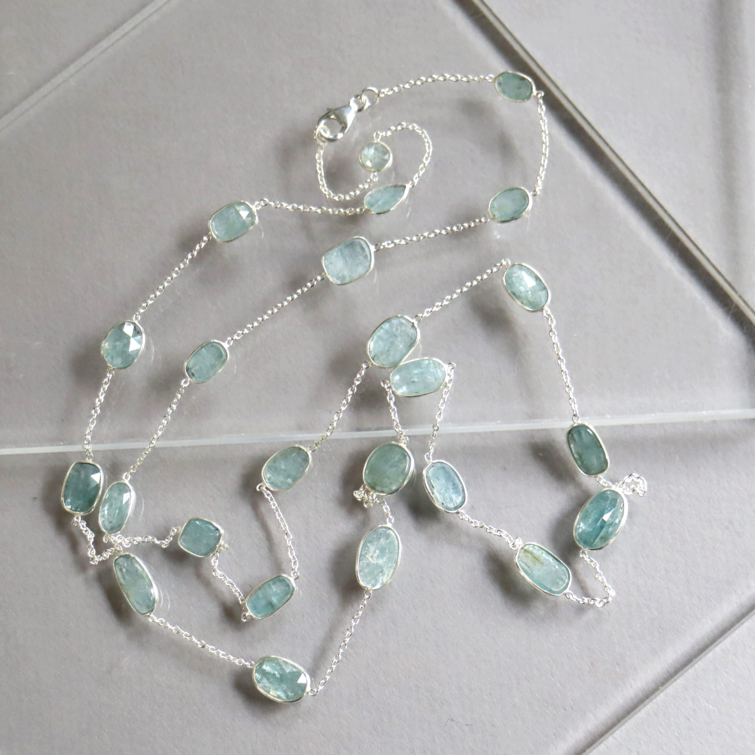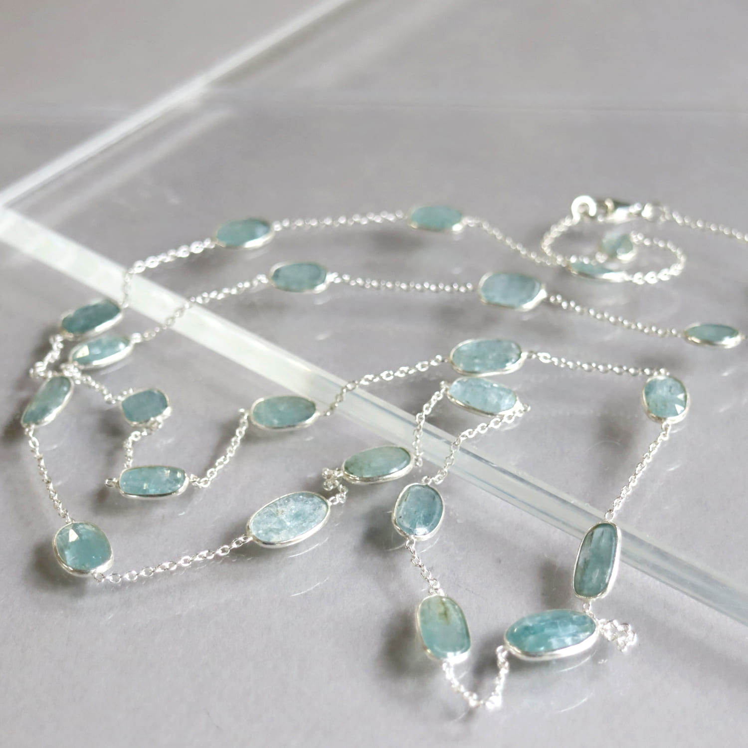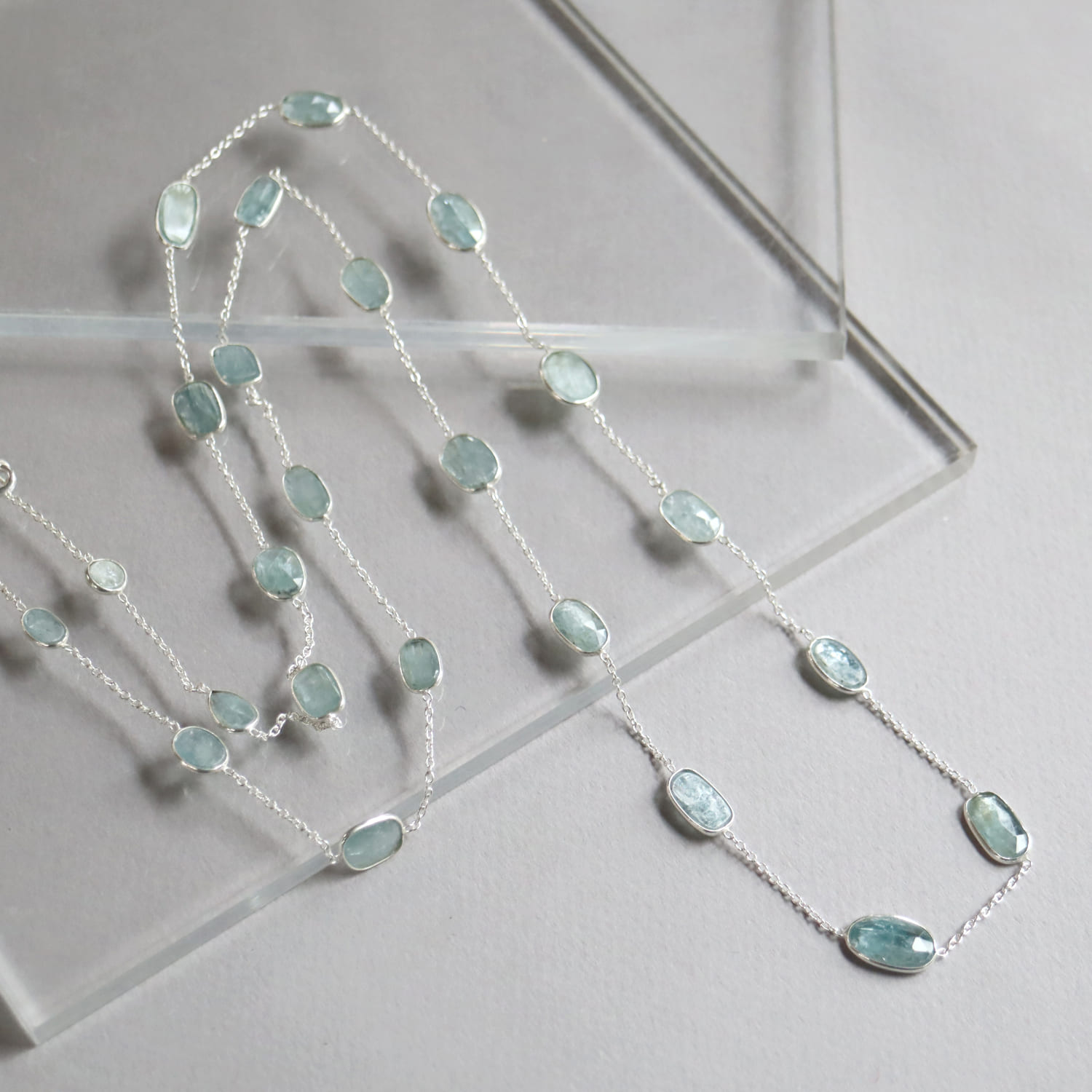 透明感あるブルーグリーンのカイヤナイトが上品に優雅に輝きます。繊維状の内包物が平行に並んでいるのが特徴であり、こちらは一粒一粒にそれらを見ることができます。ソーダ水のような清涼感ある印象の様々な形の石が、贅沢に並んだネックレスです。ロングチェーンならではのゆったりとした揺れ感が目を惹きます。