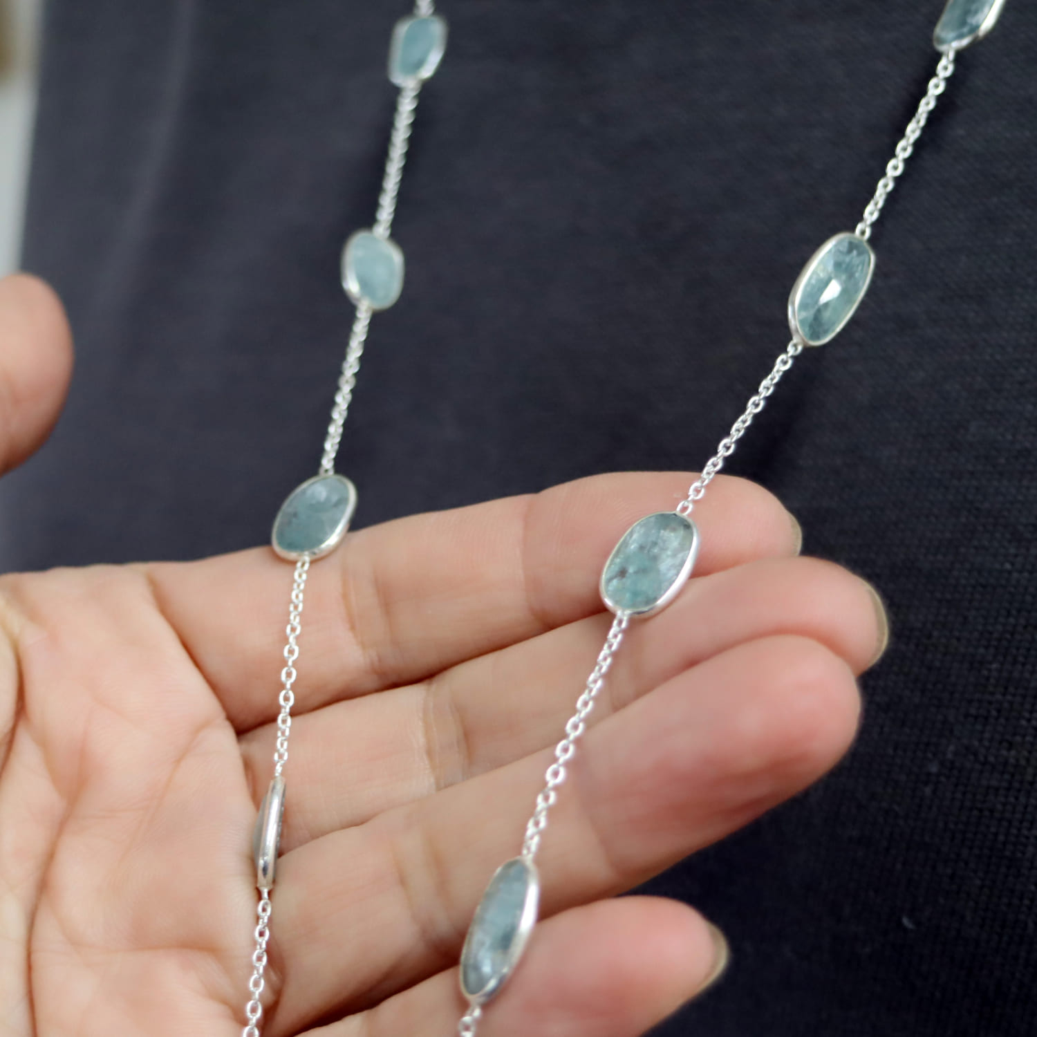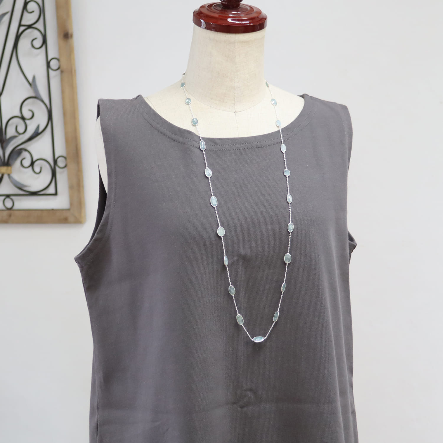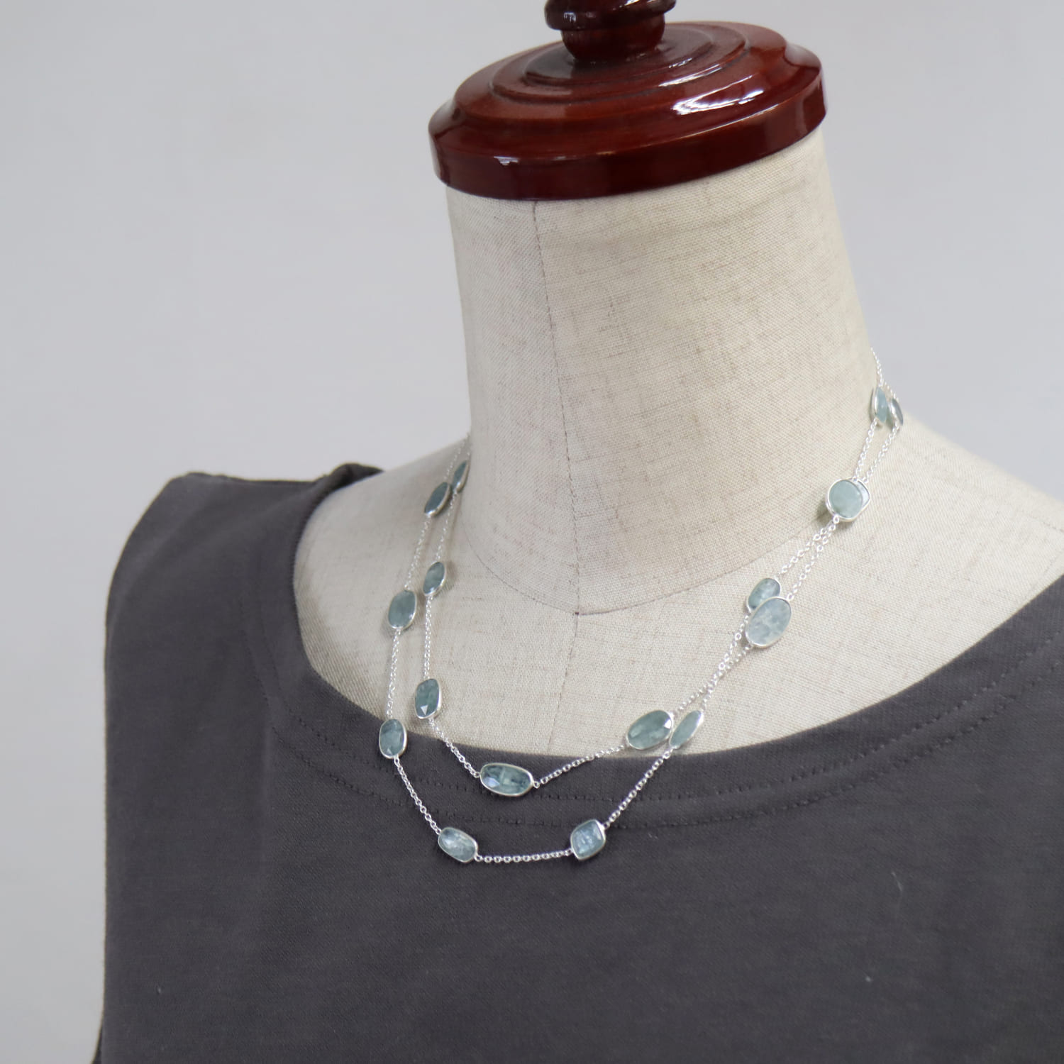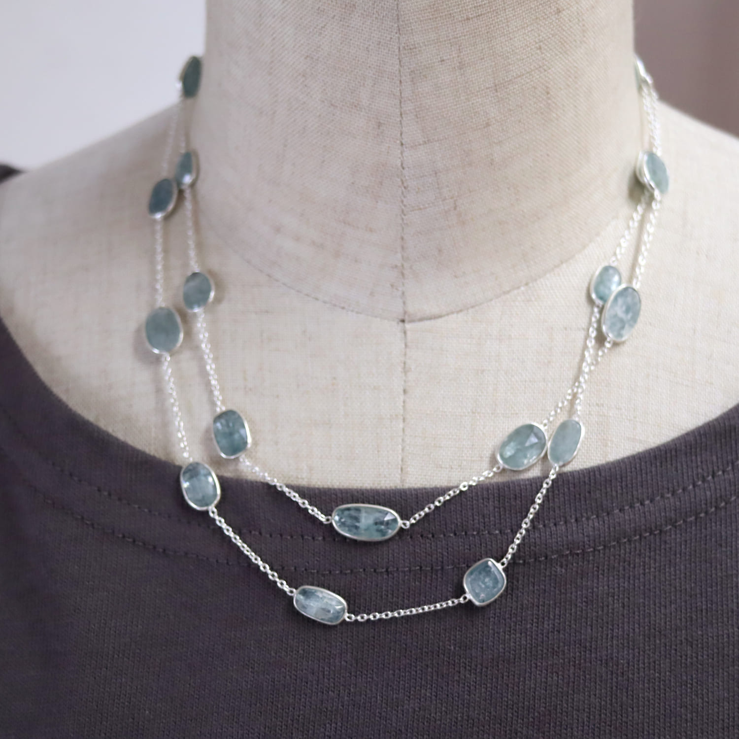 透明感あるブルーグリーンのカイヤナイトが上品に優雅に輝きます。繊維状の内包物が平行に並んでいるのが特徴であり、こちらは一粒一粒にそれらを見ることができます。ソーダ水のような清涼感ある印象の様々な形の石が、贅沢に並んだネックレスです。ロングチェーンならではのゆったりとした揺れ感が目を惹きます。
