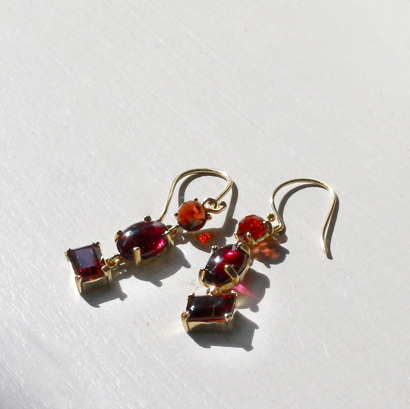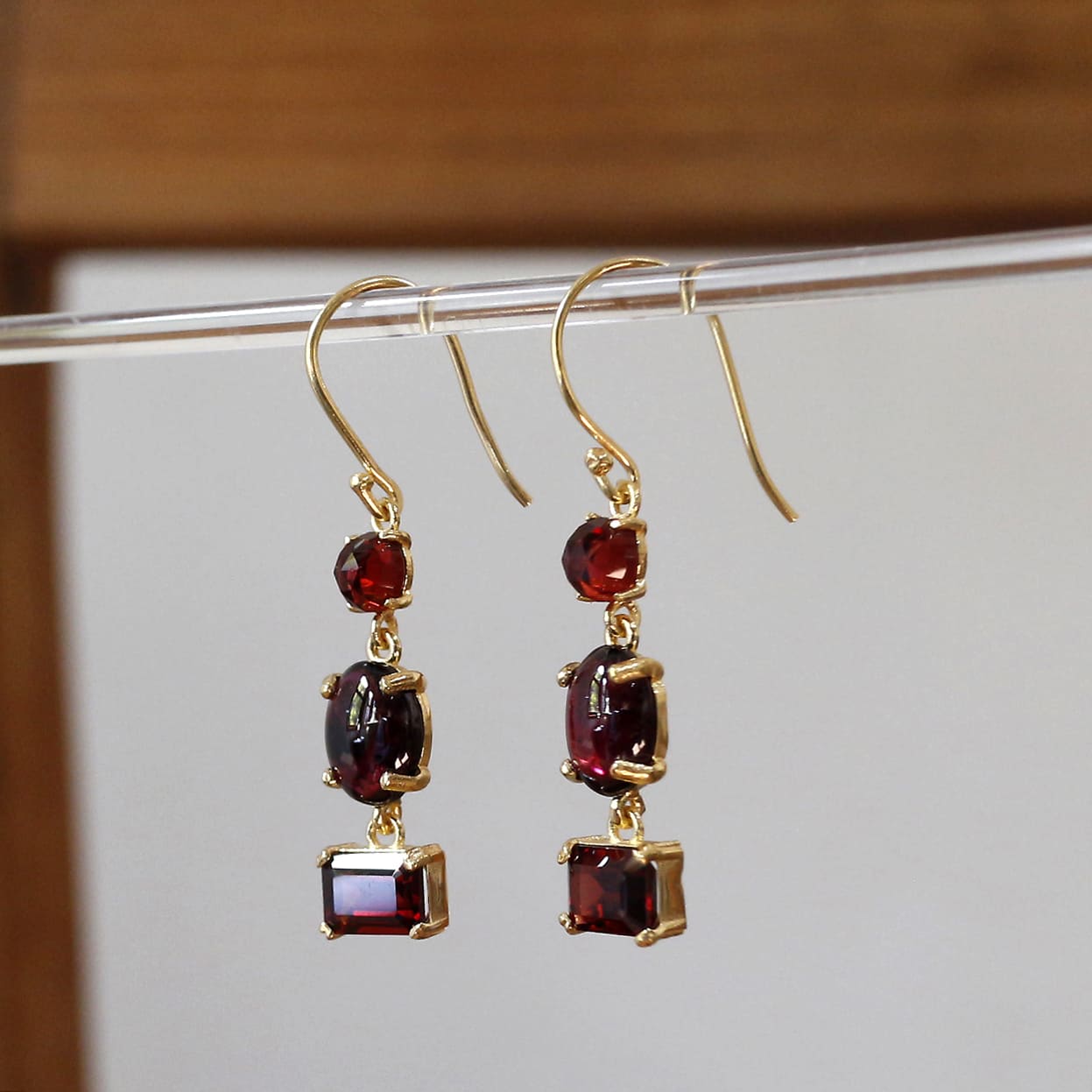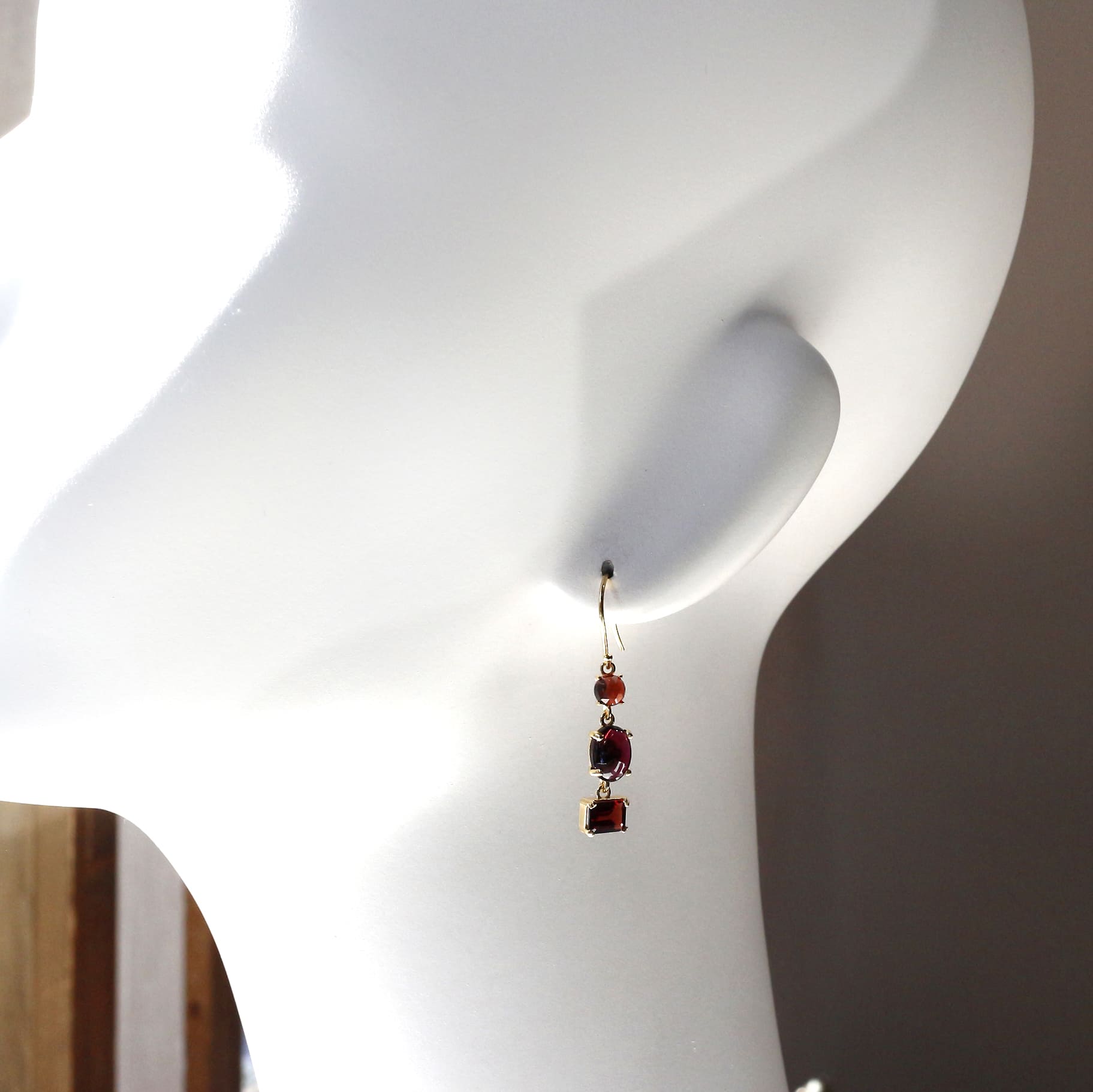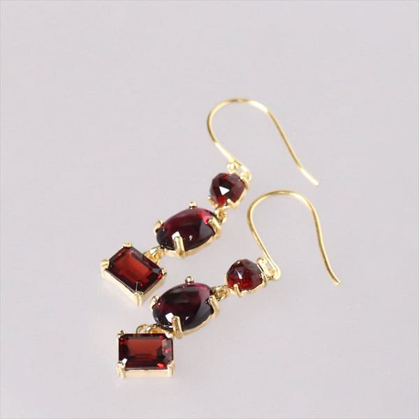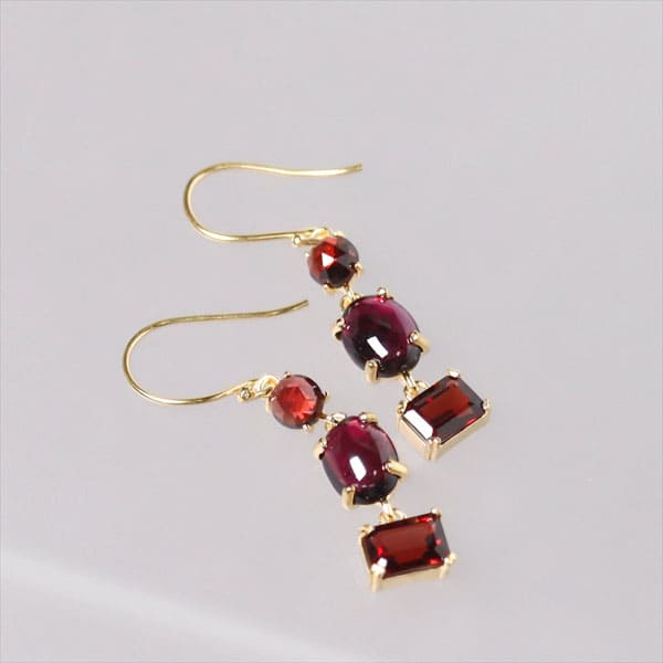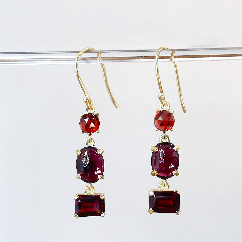 オレンジがかったレッドのストーン、ワインの様な深みある赤紫のストーン、それぞれの艶やかな輝きが美しさあふれるピアスです。一見同じ石のようですが、光をとおしてよく見ると、それぞれが美しく、ほんのりと違うカラーであることがわかります。※一番下の石0.6×0.8cm