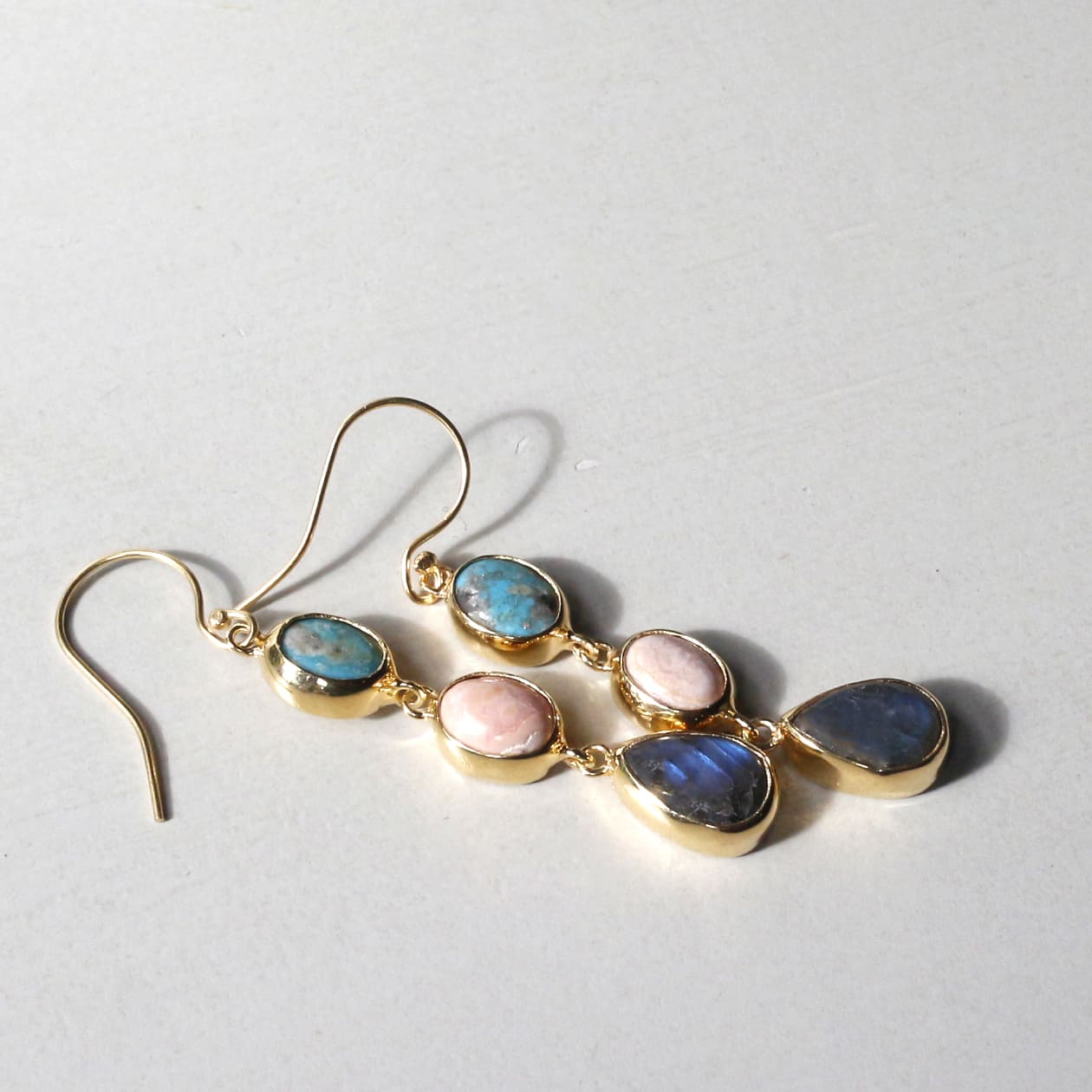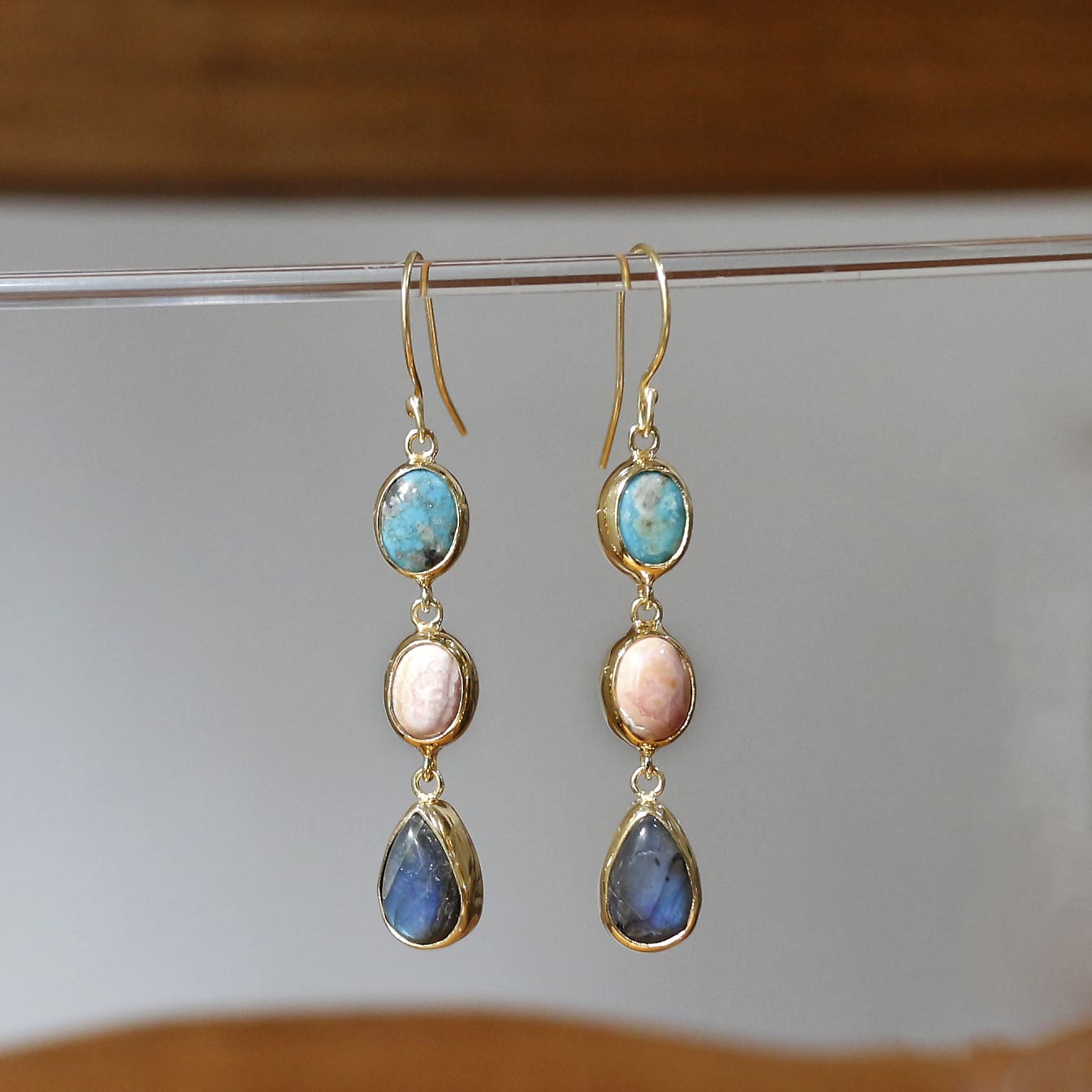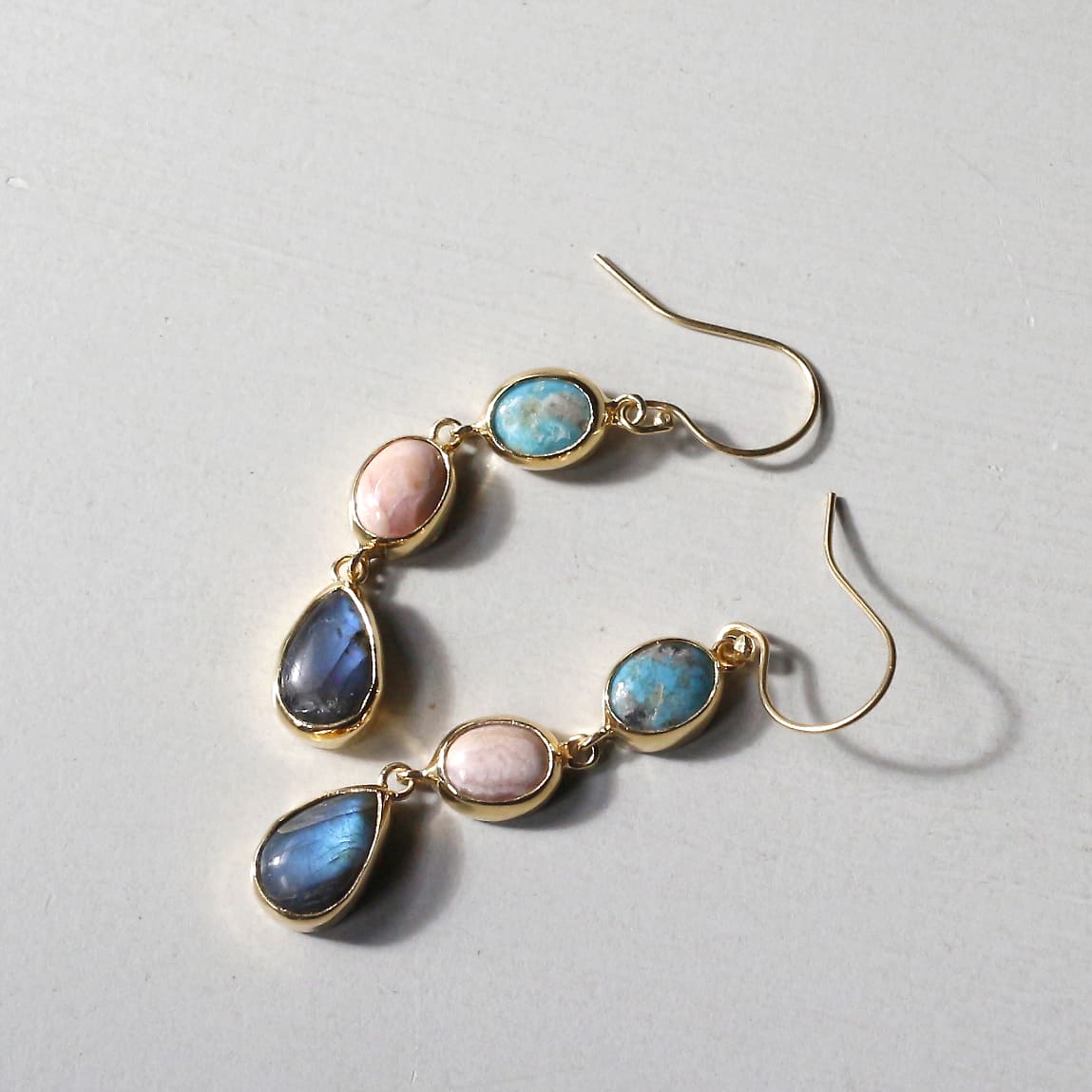 マットなカラーのターコイズ、乳白色のロードクロサイト、揺れるたびに青みを帯びた幻想的なシラーが輝くラブラトライト。三つの個性ある石が並んだピアスです。※一番下の石1.3×1cm