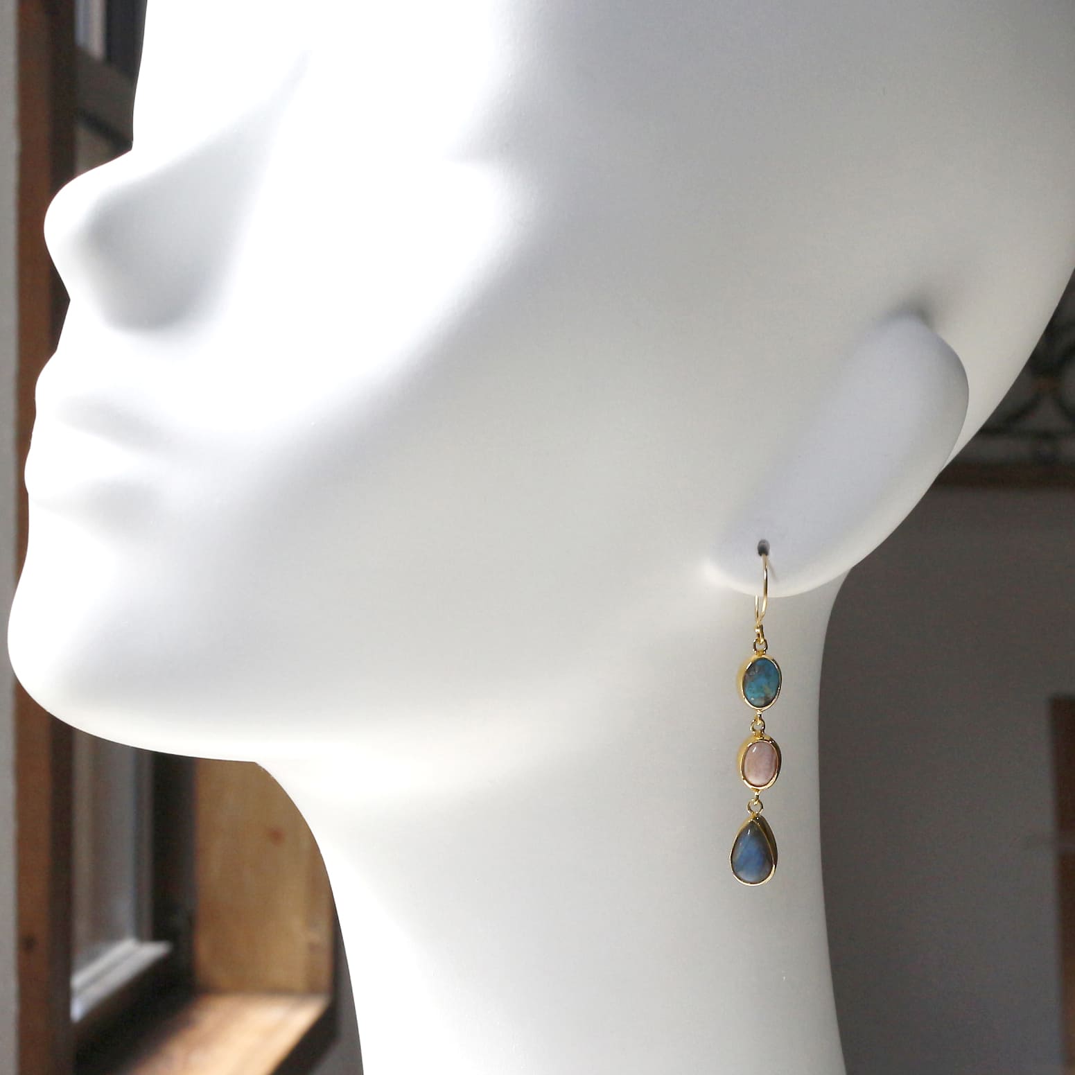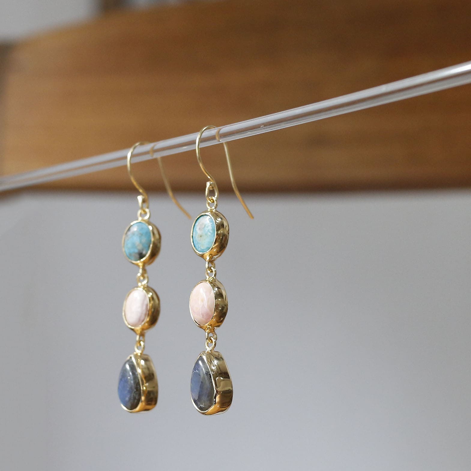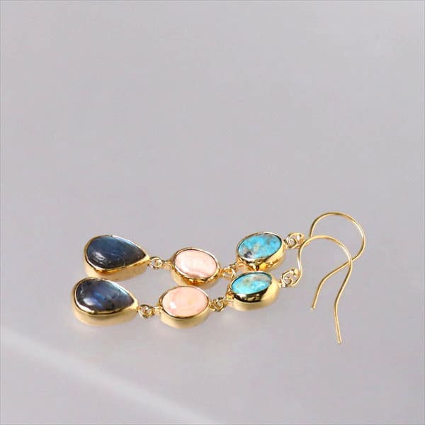 マットなカラーのターコイズ、乳白色のロードクロサイト、揺れるたびに青みを帯びた幻想的なシラーが輝くラブラトライト。三つの個性ある石が並んだピアスです。※一番下の石1.3×1cm