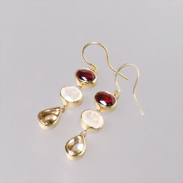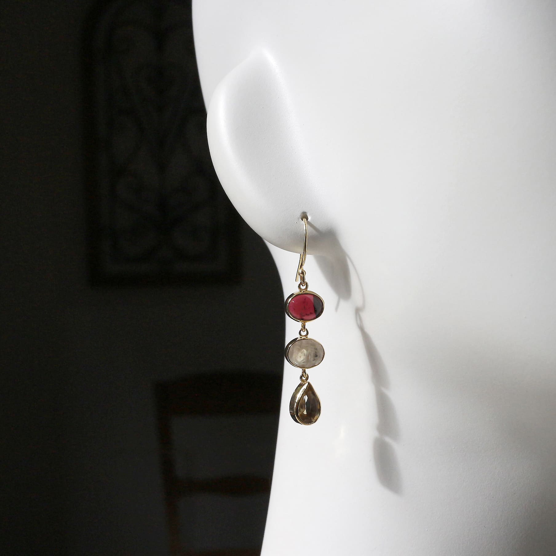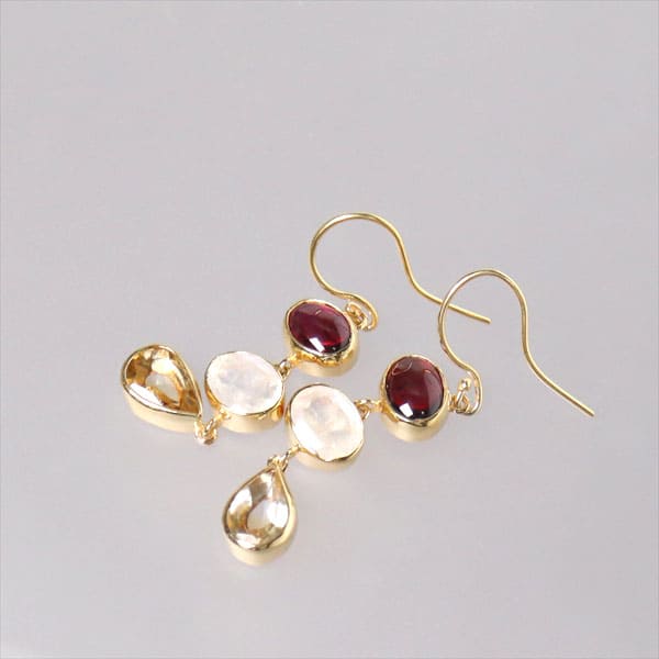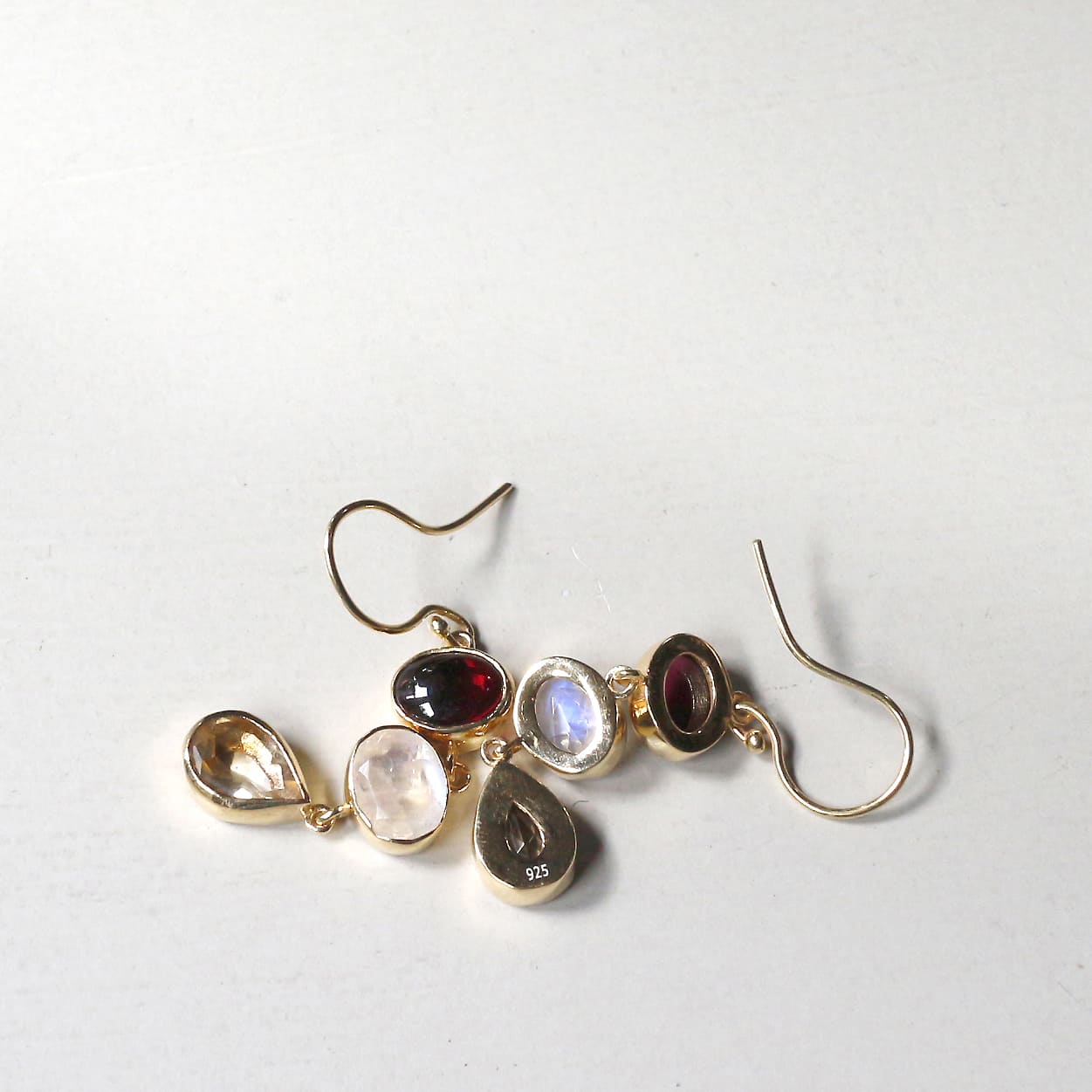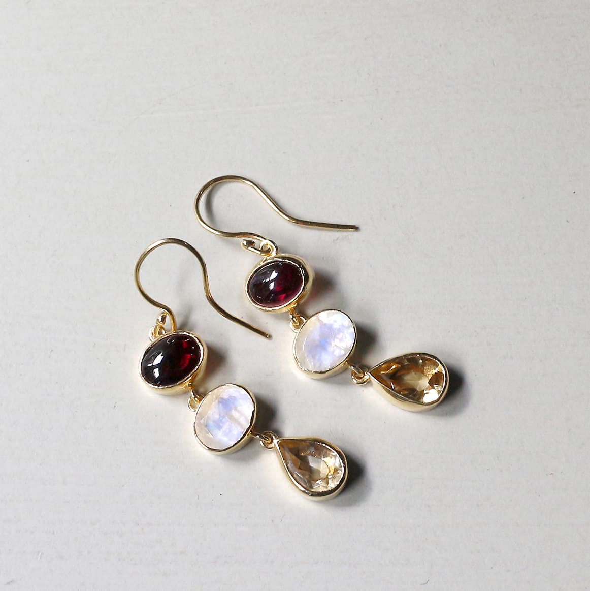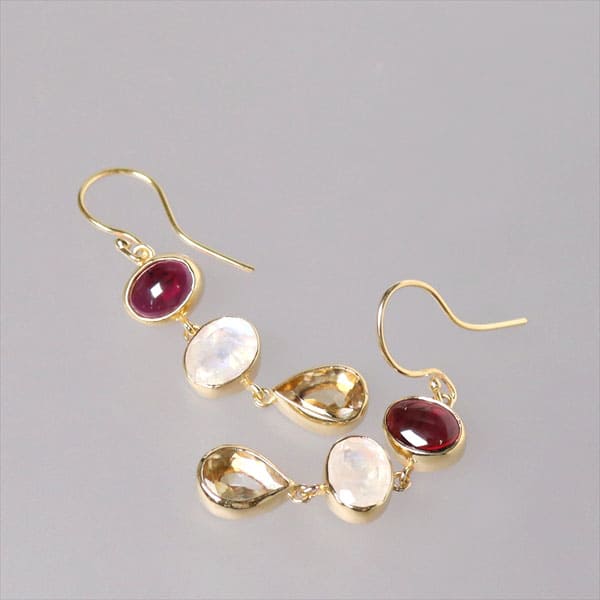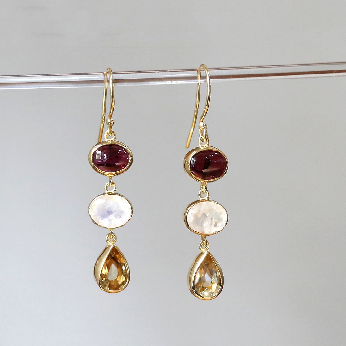 赤紫のアメシストの下には、揺れるたびに、青みあるシラーがきらめくレインボームーンストーンと、先についたかわいいドロップカットのほんのりと黄色がかった美しいシトリンが、華やかな印象のピアスです。※一番下の石1×0.7cm