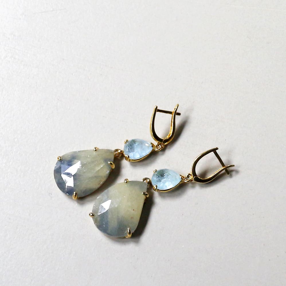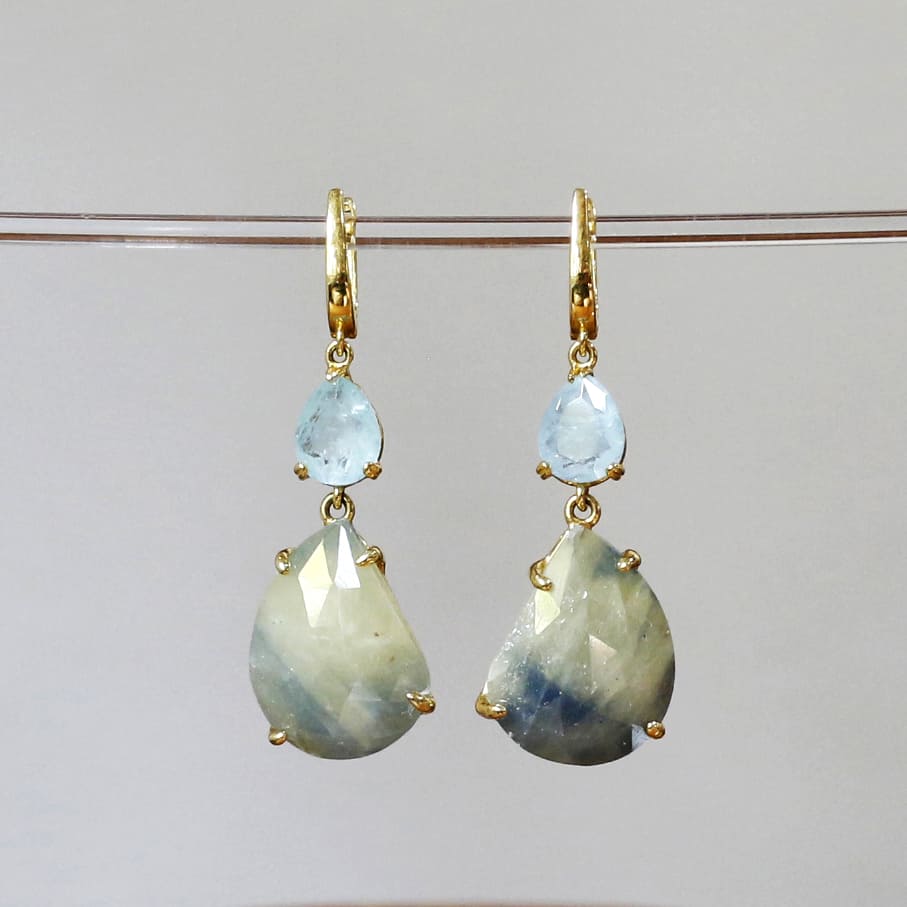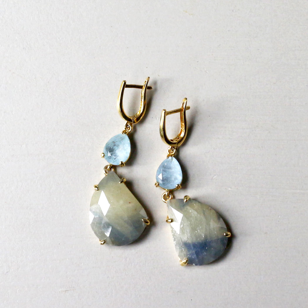 ほんのり黄みがかったカーキグリーンのストーンに、青みがにじんだような上品な印象のサファイアのピアスです。やわらかな色でありながら、ローズカットが施されているので、揺れるたびにきらきらと美しく輝きます。透き通るような淡いブルーのアクアマリンとの相性がより華やかにみせてくれます。※一番下の石2.2×1.7cm