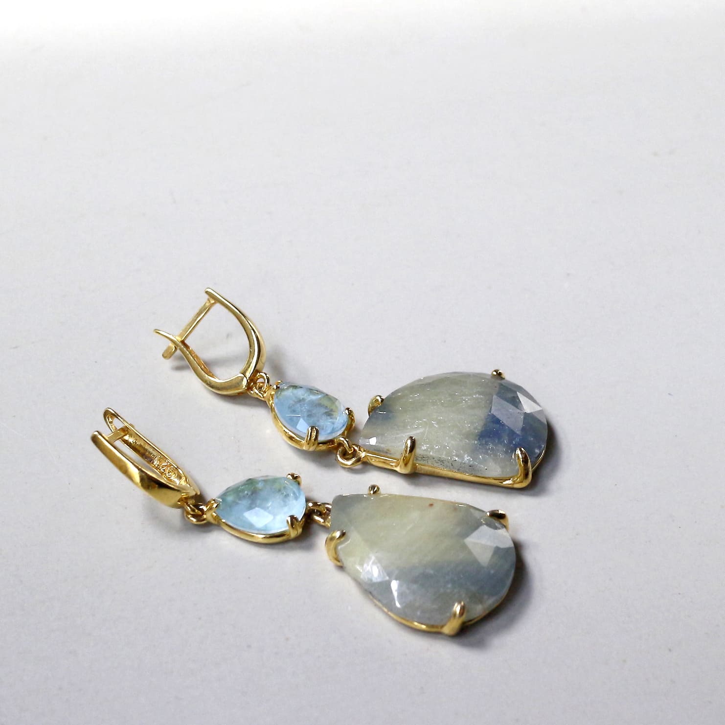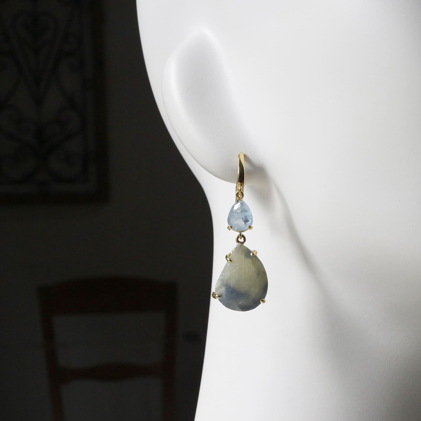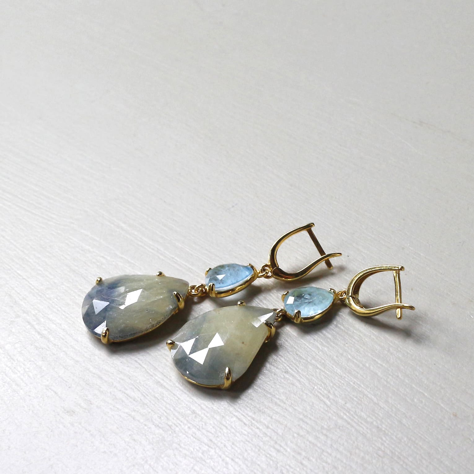 ほんのり黄みがかったカーキグリーンのストーンに、青みがにじんだような上品な印象のサファイアのピアスです。やわらかな色でありながら、ローズカットが施されているので、揺れるたびにきらきらと美しく輝きます。透き通るような淡いブルーのアクアマリンとの相性がより華やかにみせてくれます。※一番下の石2.2×1.7cm