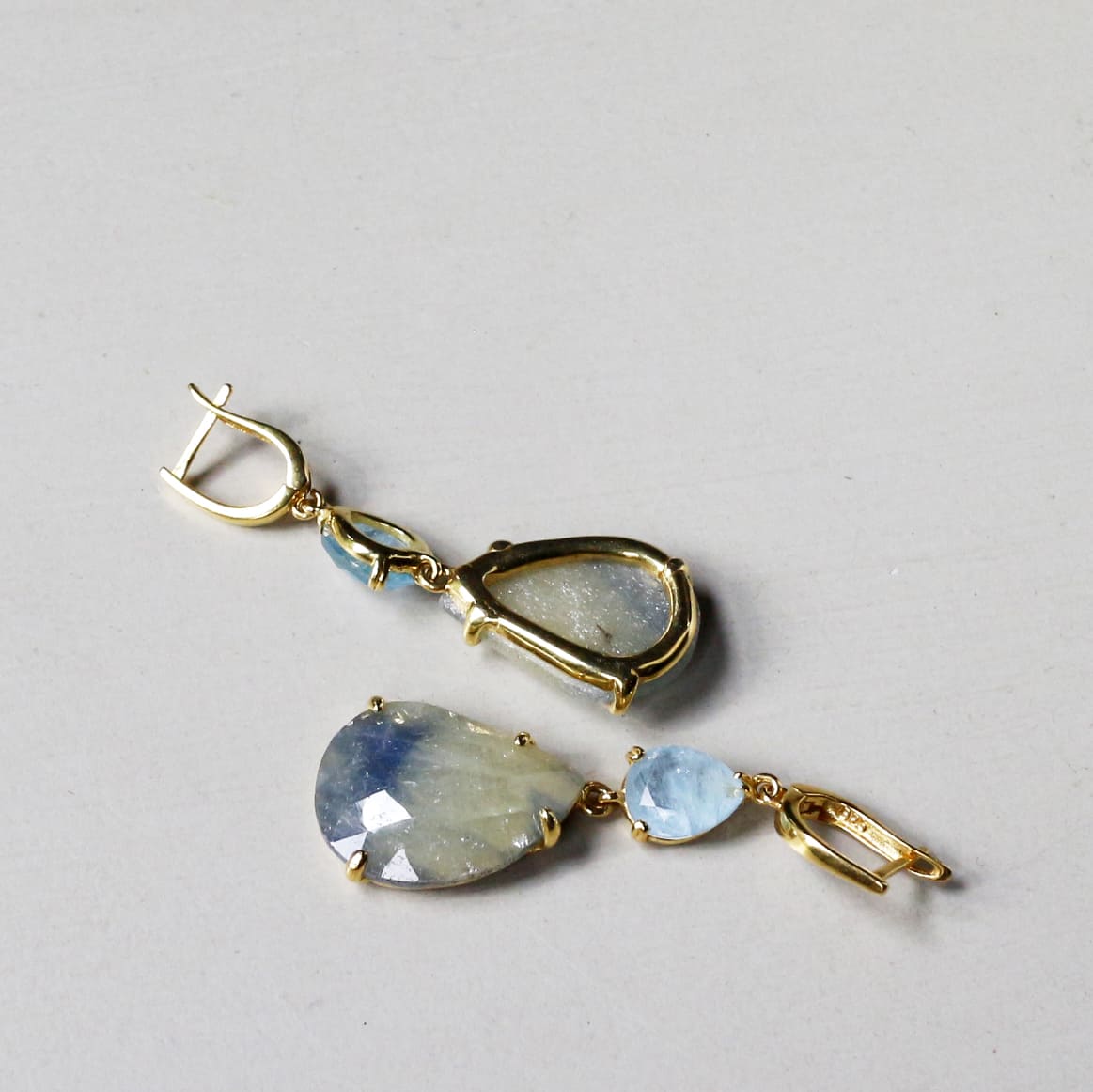 ナチュラルサファイア×アクアマリン ラフカットピアス 2つの石 18KGF 天然石 シルバーピアス くすみカラー