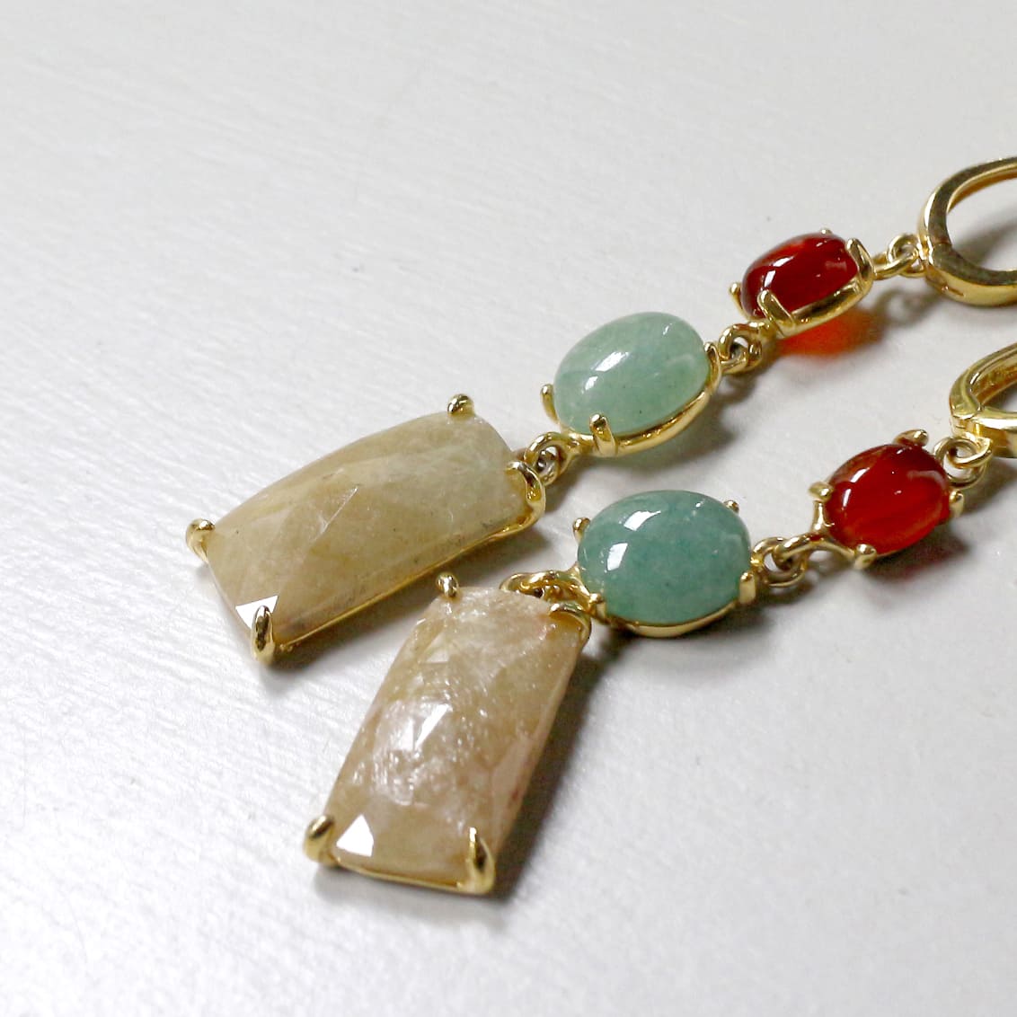 やさしいベージュカラーが上品な印象のナチュラルサファイアのピアスです。コロンとしたカボションカットのグリーンアベンチュリンとカーネリアン、異なる三つのストーンが耳元で揺れるたびにきらきらと輝きます。※一番下の石2×1cm