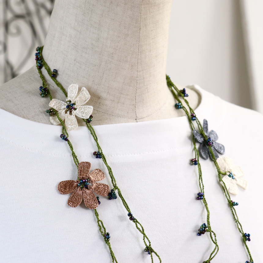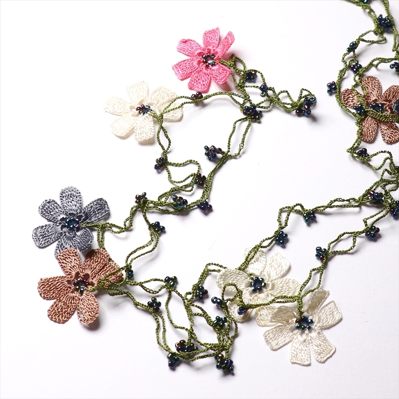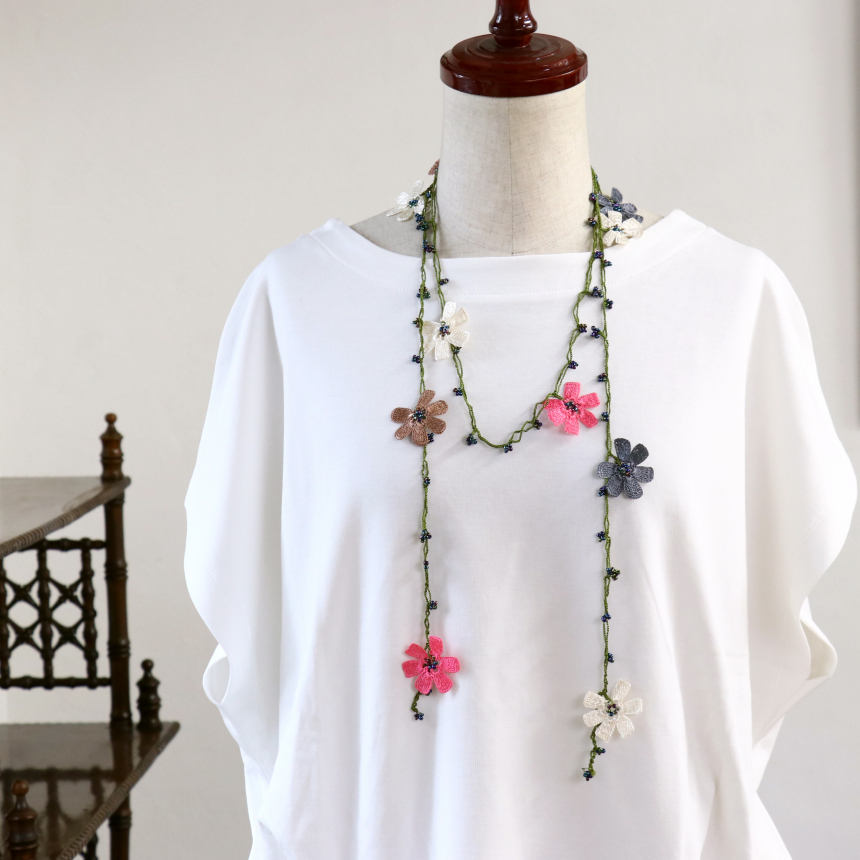 トルコの伝統的な手芸「オヤ」をモチーフにして、手編みで作られたネックレスです。このピースは、かぎ針で編んだ「トゥ・オヤ」。様々な色の取り合わせが、首もとを華やかに彩ります。巻き方次第で印象が変わるので、その日のお洋服に合わせてお楽しみいただけます。