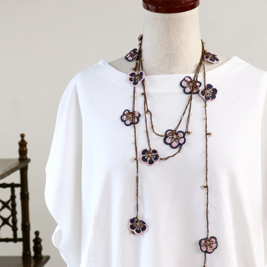 トルコの伝統的な手芸「オヤ」をモチーフにして、手編みで作られたネックレスです。このピースは、かぎ針で編んだ「トゥ・オヤ」。様々な色の取り合わせが、首もとを華やかに彩ります。巻き方次第で印象が変わるので、その日のお洋服に合わせてお楽しみいただけます。