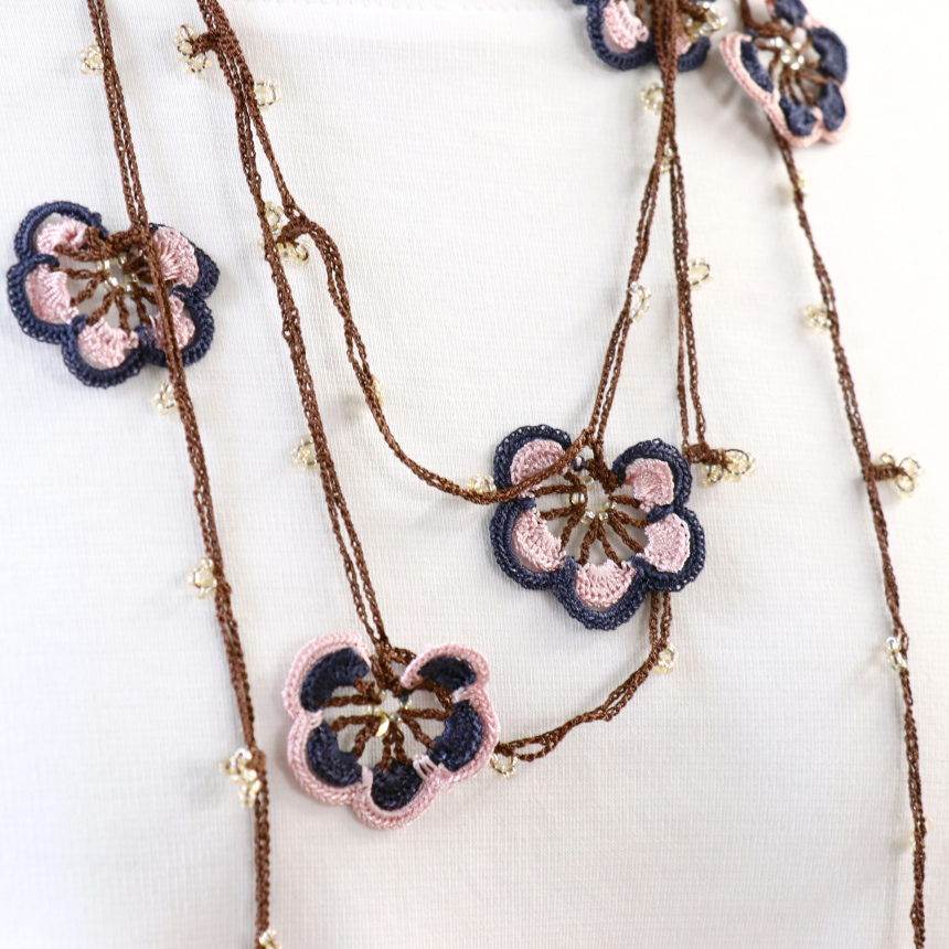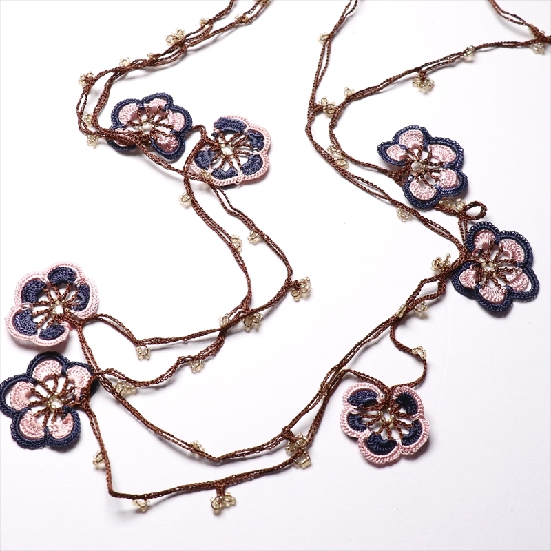 トルコのレース編み「オヤ」ラリエット トゥオヤ ピンク&ネイビーの花