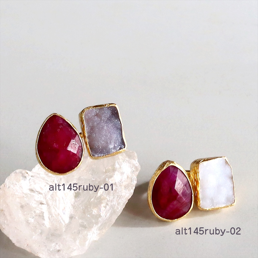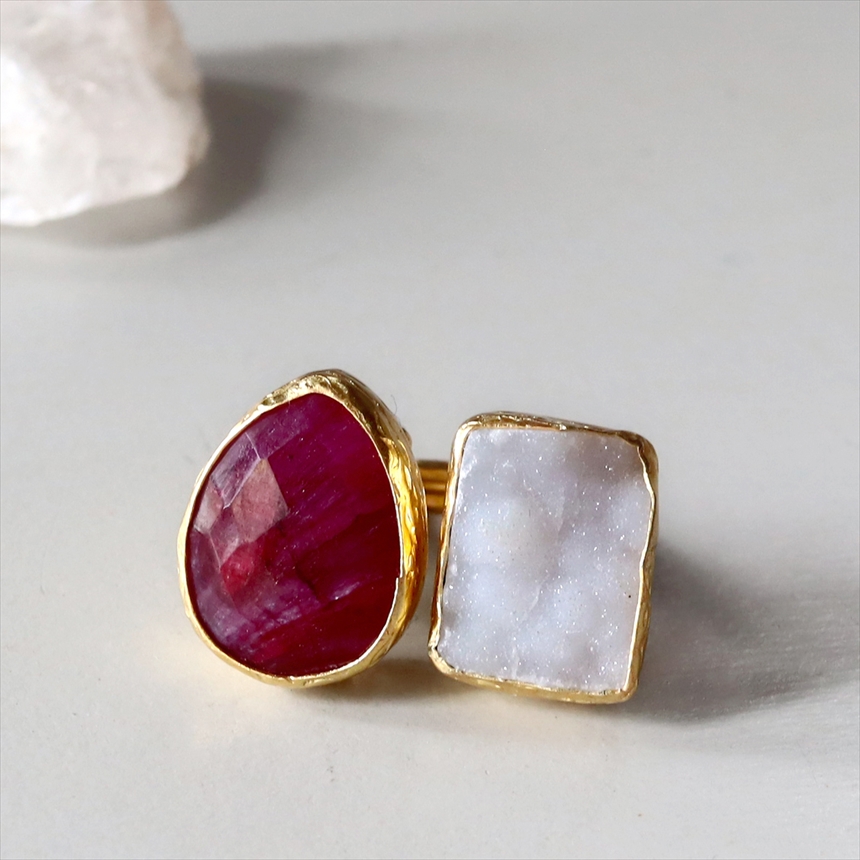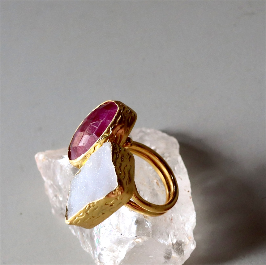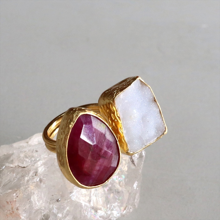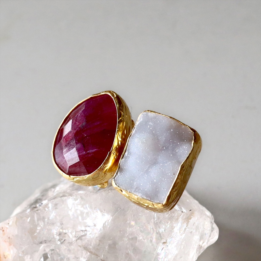 大きなドロップ型のルビーと、スクエア型のドゥルージーの石が二つ並んだリング。ドゥルージーとは、鍾乳洞のように内側が空洞化したものの結晶部分のみを採掘して、切削加工していない石のこと。光に当たるとキラキラと輝く美しい、角砂糖のようなフォルムの淡いグレーのドゥルージーと、鮮やかな深いレッドのルビーが美しいリングです。
