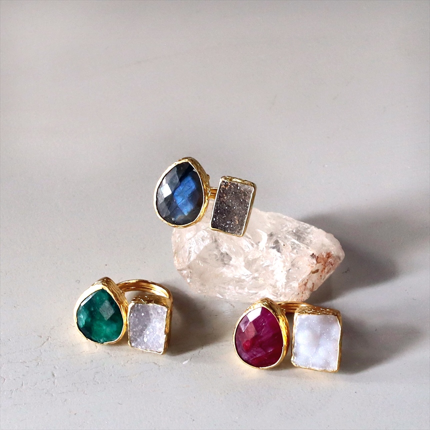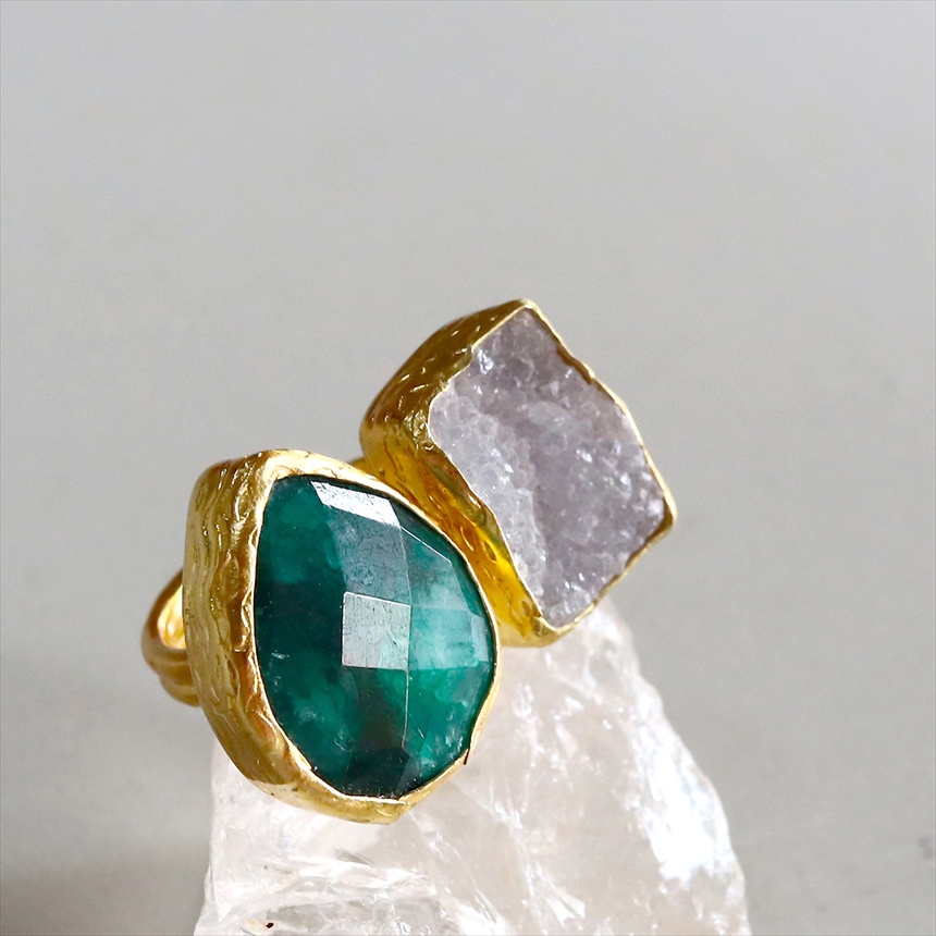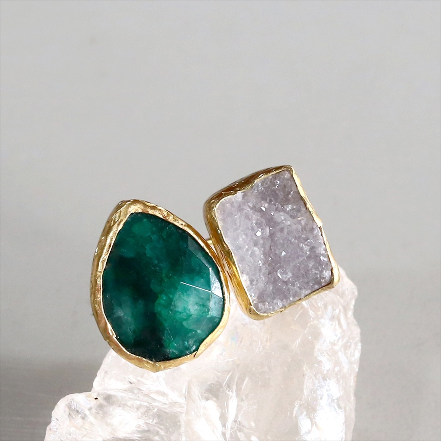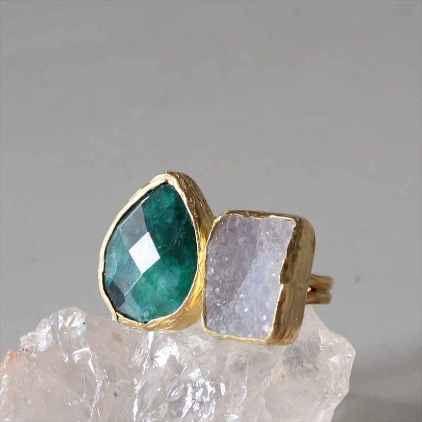 深みあるグリーンの大きなドロップ型のエメラルドと、ラフにカットされたドゥルージーの石が二つ並んだリング。ドゥルージーとは、鍾乳洞のように内側が空洞化したものの結晶部分のみを採掘して、切削加工していない石のこと。光に当たるとキラキラと輝く美しい、角砂糖のようなフォルムの淡いグレーのドゥルージーと、鮮やかな深いグリーンのエメラルドが美しいリングです。