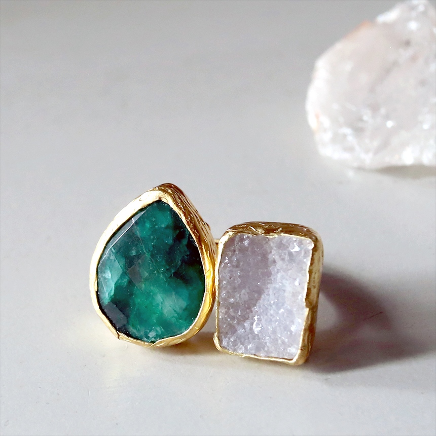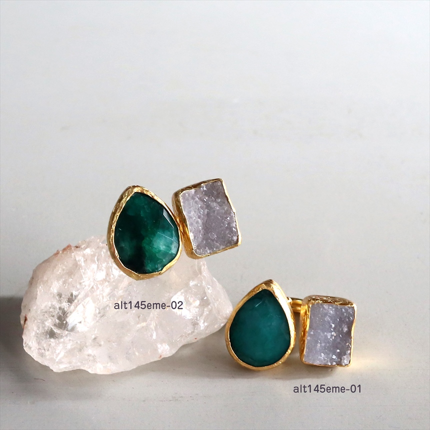 天然石(エメラルド、クォーツ)、真鍮(22kゴールドプレーテッド)